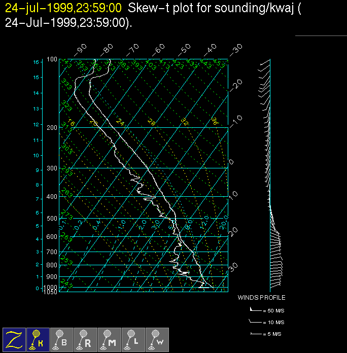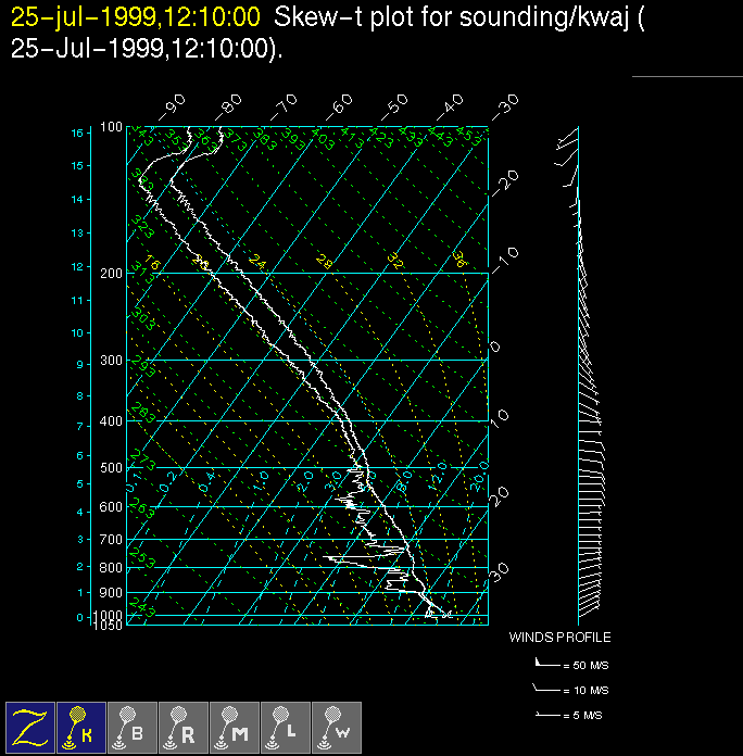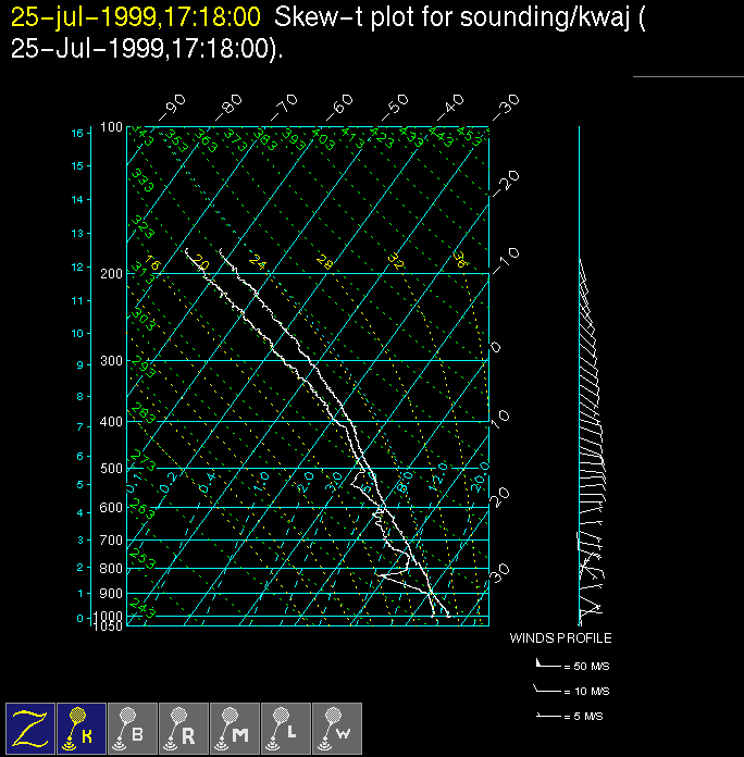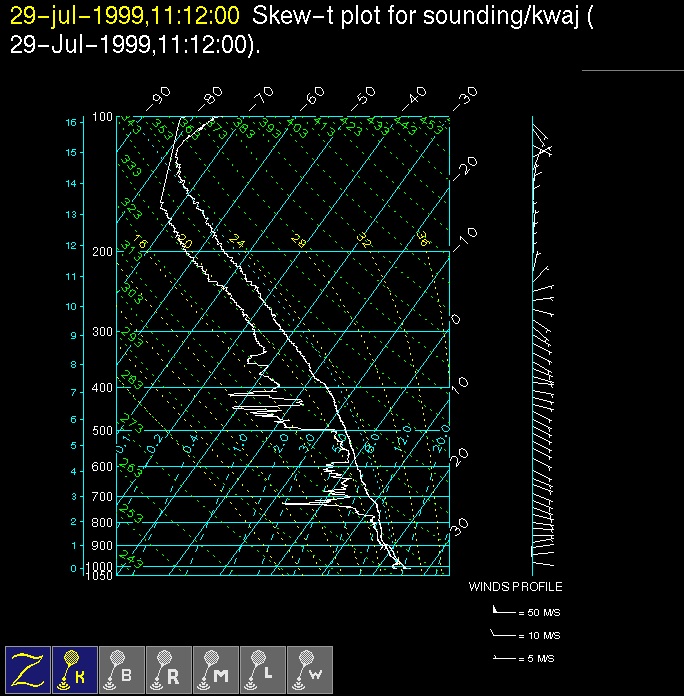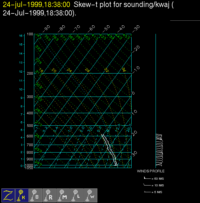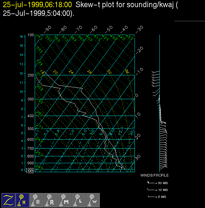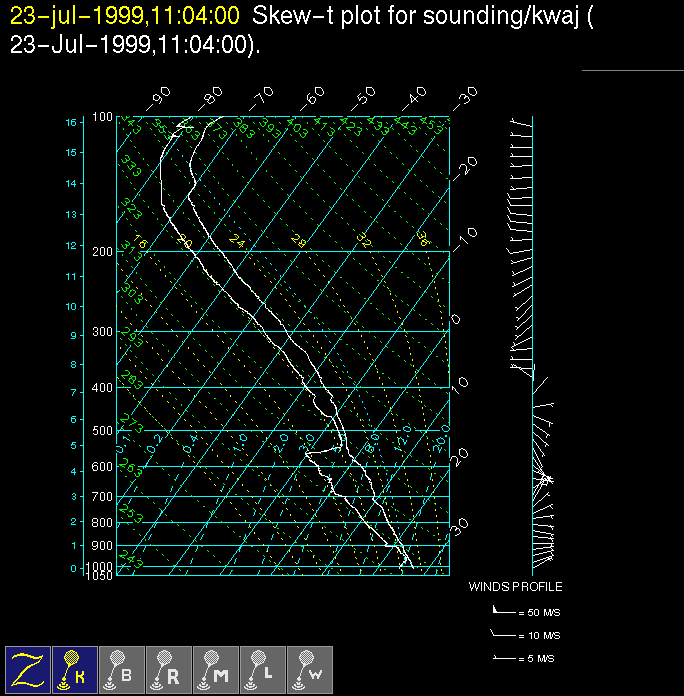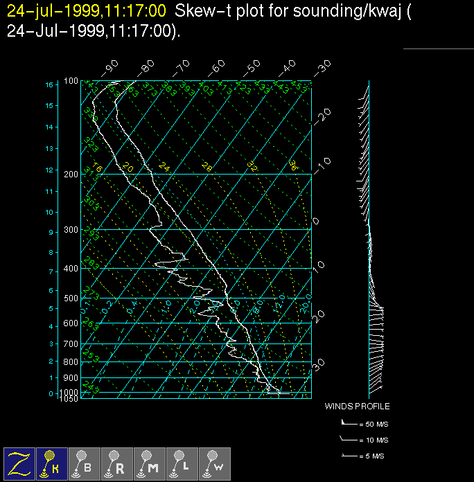 KWAJEX Weekly Sounding SummaryClick on "Plot" to see the skew-T for the sounding or select "Data" to see the data in tabular form. N/S signifies that no sounding was launched at the given time and location. AOP denotes an aircraft operational period. Soundings: July 23, 1999 (6-hourly)Use