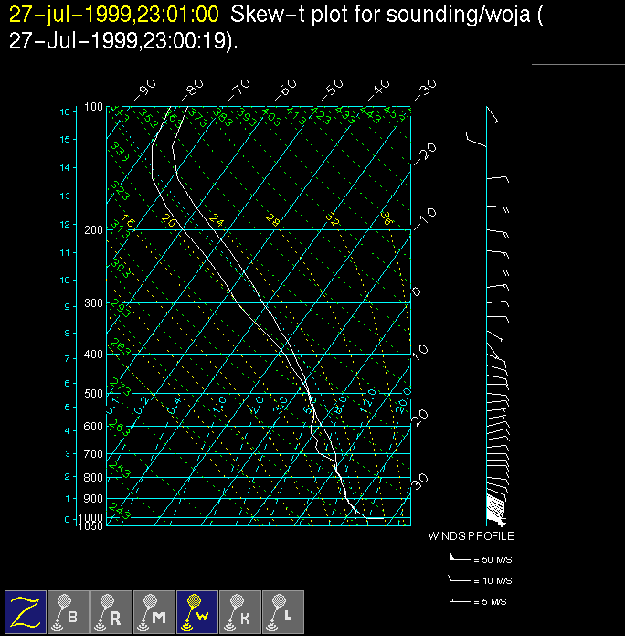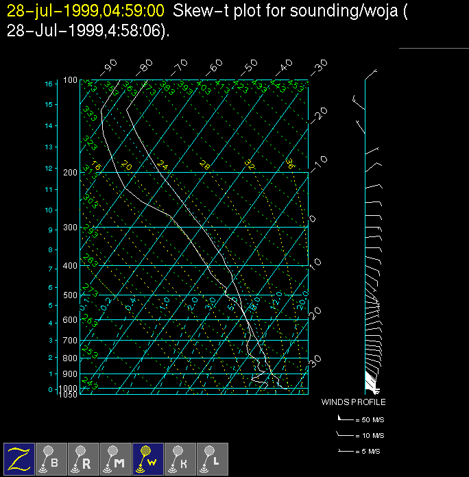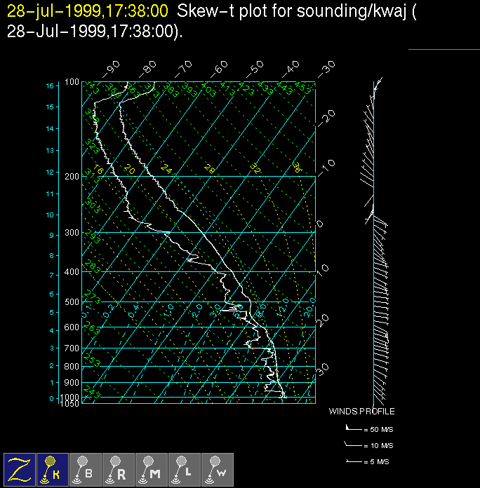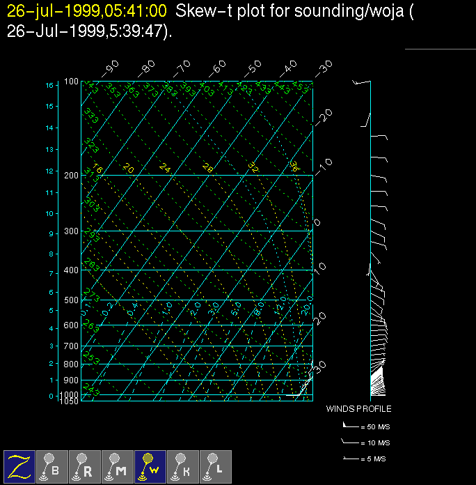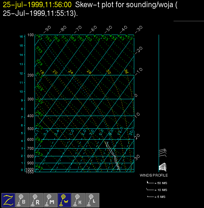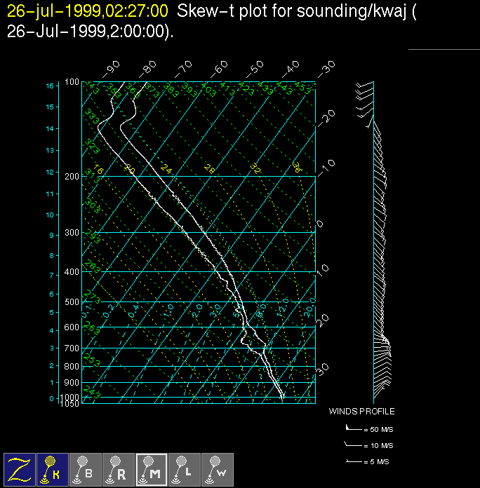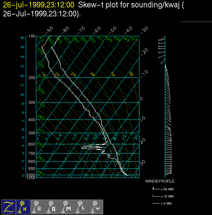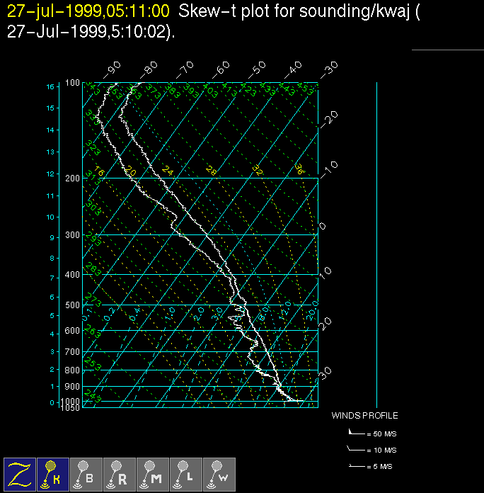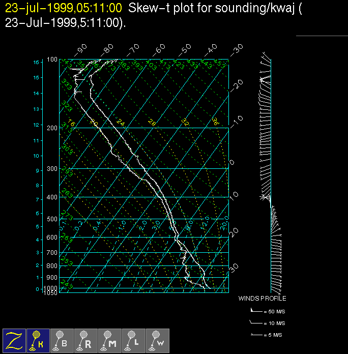 KWAJEX Weekly Sounding SummaryClick on "Plot" to see the skew-T for the sounding or select "Data" to see the data in tabular form. N/S signifies that no sounding was launched at the given time and location. AOP denotes an aircraft operational period. Soundings: July 23, 1999 (6-hourly)Use