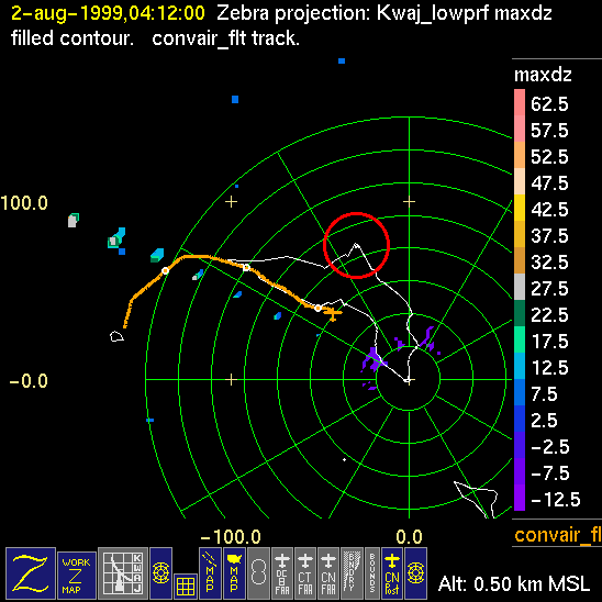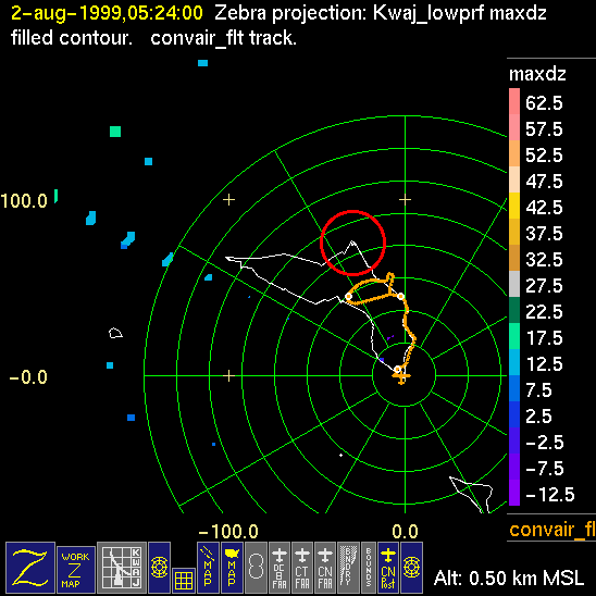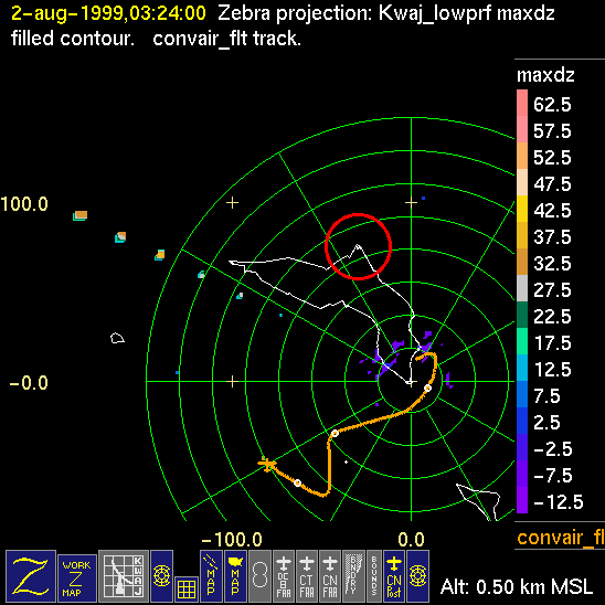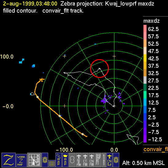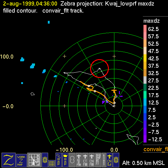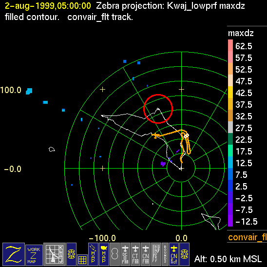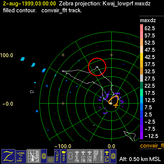 Mission summaries consist of Scientists' discussions of the flights and Radar Images overlayed with flight tracks. Separate discussions (written by the Aircraft Mission Coordinator and the chief airborne mission scientist on each aircraft participating in the mission) may be read by clicking on the "Scientists' Discussion" link shown below. Also shown below are the aircraft flight tracks (see color key below) superimposed on a series of radar echo patterns obtained by the Kwajalein S-band radar during flights. Echo along radials 296-297 deg. is non-meteorological. The geography of the Kwajalein Atoll is outlined in white. The area covered by the radar is almost all open ocean. Range rings are at 10 nm intervals. The NOAA ship Ronald H. Brown is located ~22 nm (40 km) south of the Kwajalein radar. The overlapping white circles show the dual-Doppler radar lobes for the combined Kwajalein and ship radars. The red circle is a no-fly zone.