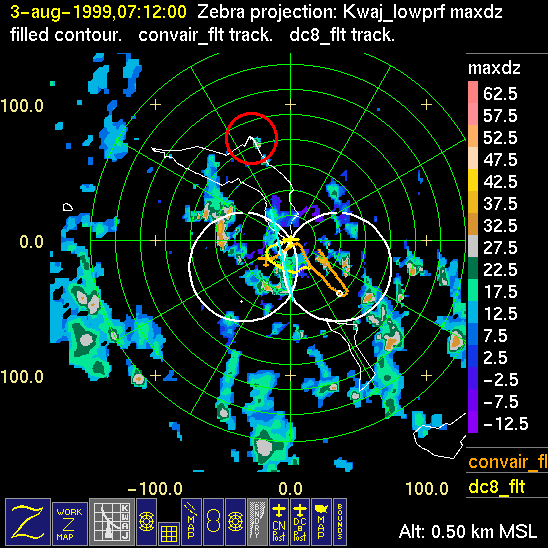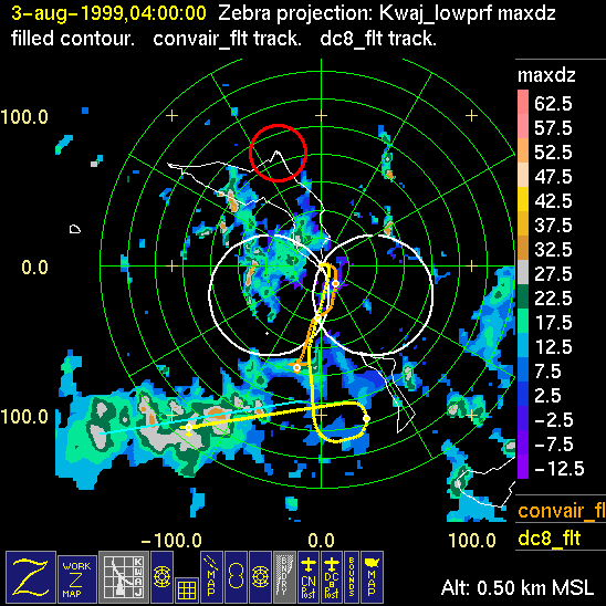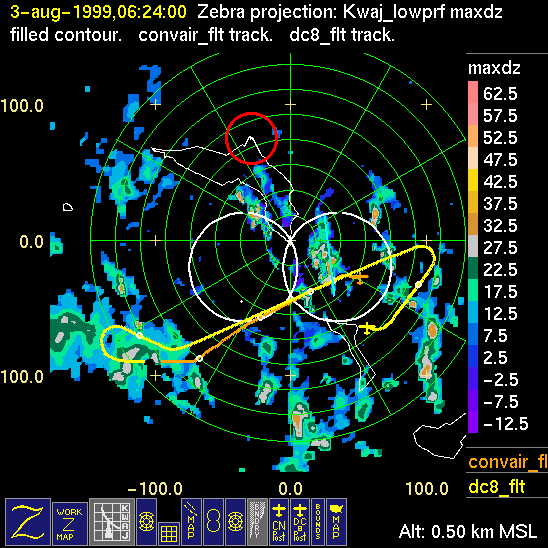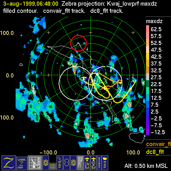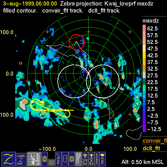 Mission summaries consist of Scientists' discussions of the flights and Radar Images overlayed with flight tracks. Separate discussions (written by the Aircraft Mission Coordinator and the chief airborne mission scientist on each aircraft participating in the mission) may be read by clicking on the "Scientists' Discussion" link shown below. Also shown below are the aircraft flight tracks (see color key below) superimposed on a series of radar echo patterns obtained by the Kwajalein S-band radar during flights. In some cases, horizontal maps of radar echo are accompanied by a vertical cross section of the radar reflectivity: indicated by light blue lines on the horizontal maps and displayed directly below them. The geography of the Kwajalein Atoll is outlined in white. The area covered by the radar is almost all open ocean. Range rings are at 10 nm intervals. The NOAA ship Ronald H. Brown is located ~22 nm (40 km) south of the Kwajalein radar. The overlapping white circles show the dual-Doppler radar lobes for the combined Kwajalein and ship radars. The red circle is a no-fly zone.