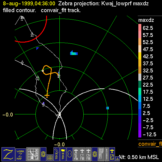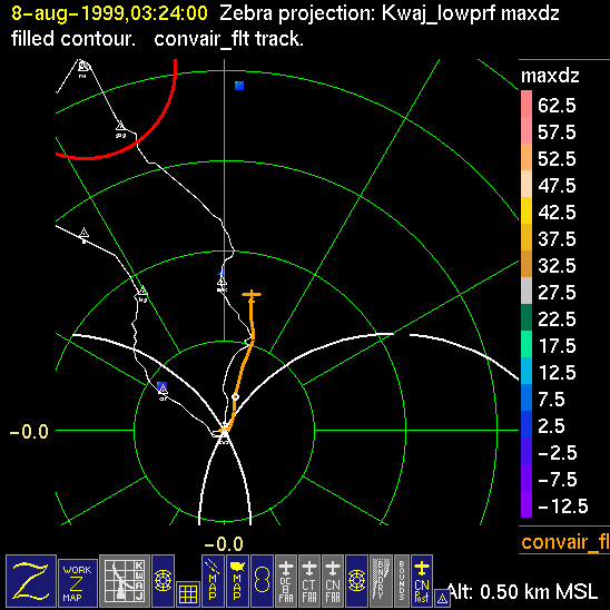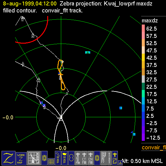 Mission summaries consist of Scientists' discussions of the flights and Radar Images overlayed with flight tracks. Separate discussions (written by the Aircraft Mission Coordinator and the chief airborne mission scientist on each aircraft participating in the mission) may be read by clicking on the "Scientists' Discussion" link shown below. Also shown below are the aircraft flight tracks (see color key below) superimposed on a series of radar echo patterns obtained by the Kwajalein S-band radar during flights. In some cases, horizontal maps of radar echo are accompanied by a vertical cross section of the radar reflectivity: indicated by light blue lines on the horizontal maps and displayed directly below them. The geography of the Kwajalein Atoll is outlined in white. The area covered by the radar is almost all open ocean. Range rings are at 10 nm intervals. The NOAA ship Ronald H. Brown is located ~22 nm (40 km) south of the Kwajalein radar. The overlapping white circles show the dual-Doppler radar lobes for the combined Kwajalein and ship radars. The red circle is a no-fly zone.