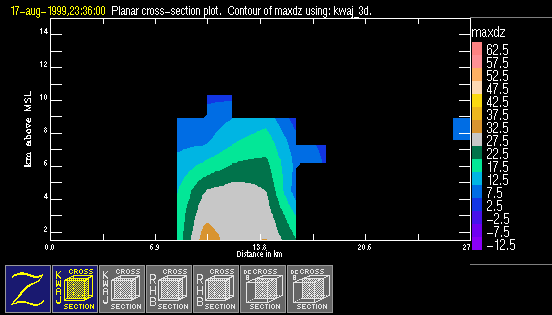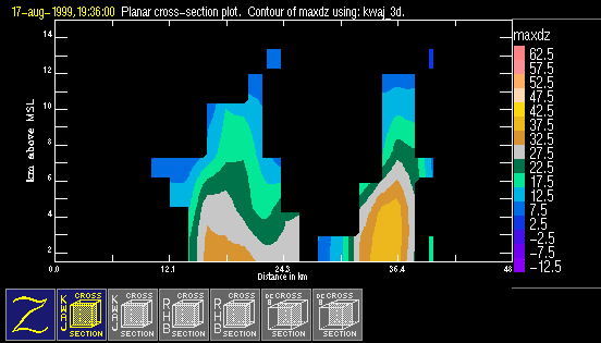 Mission summaries consist of Scientists' discussions of the flights and Radar Images overlayed with flight tracks. Separate discussions (written by the Aircraft Mission Coordinator and the chief airborne mission scientist on each aircraft participating in the mission) may be read by clicking on the "Scientists' Discussion" link shown below. Also shown below are the aircraft flight tracks (see color key below) superimposed on a series of radar echo patterns obtained by the Kwajalein S-band radar during flights. In some cases, horizontal maps of radar echo are accompanied by a vertical cross section of the radar reflectivity: indicated by light blue lines on the horizontal maps and displayed directly below them. The geography of the Kwajalein Atoll is outlined in white. The area covered by the radar is almost all open ocean. Range rings are at 10 nm intervals. The NOAA ship Ronald H. Brown is located ~22 nm (40 km) south of the Kwajalein radar. The overlapping white circles show the dual-Doppler radar lobes for the combined Kwajalein and ship radars. The red circle is a no-fly zone.