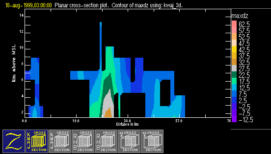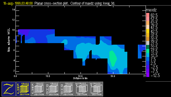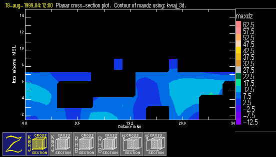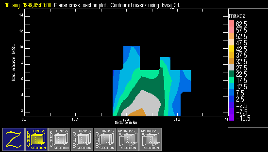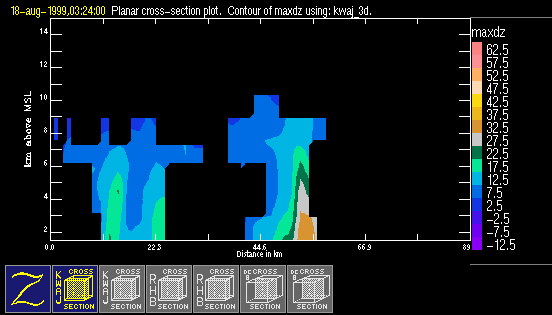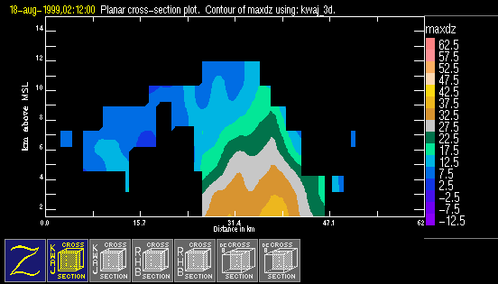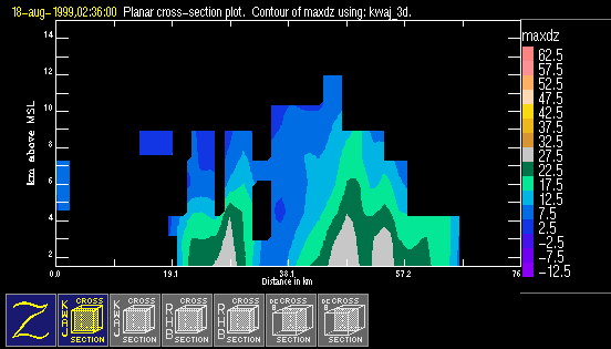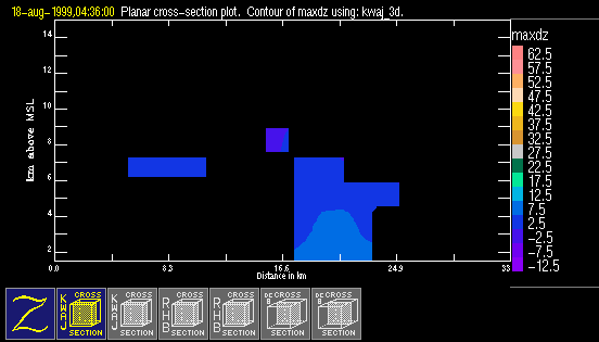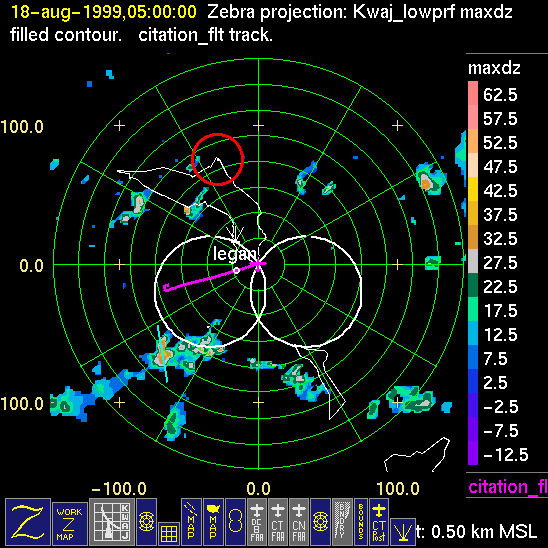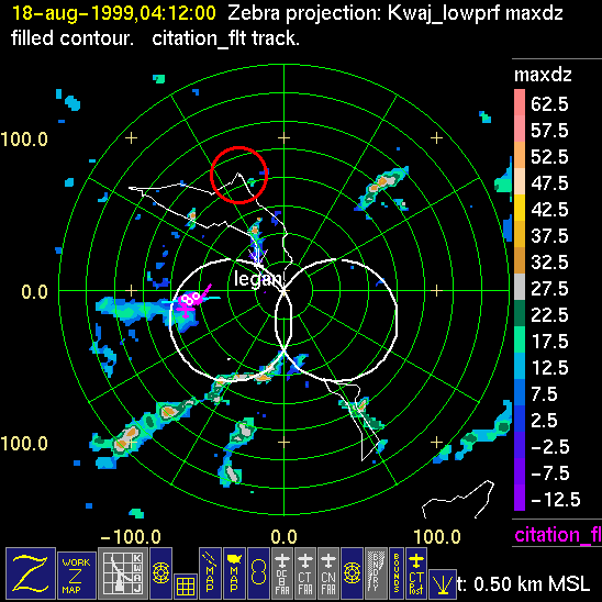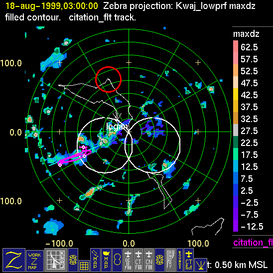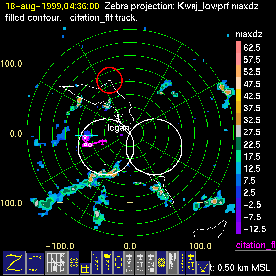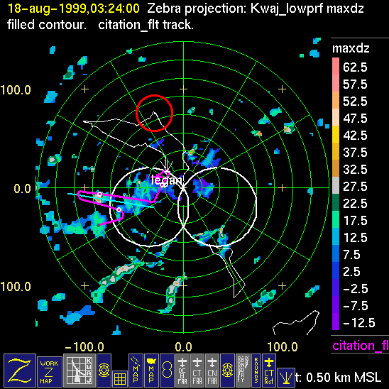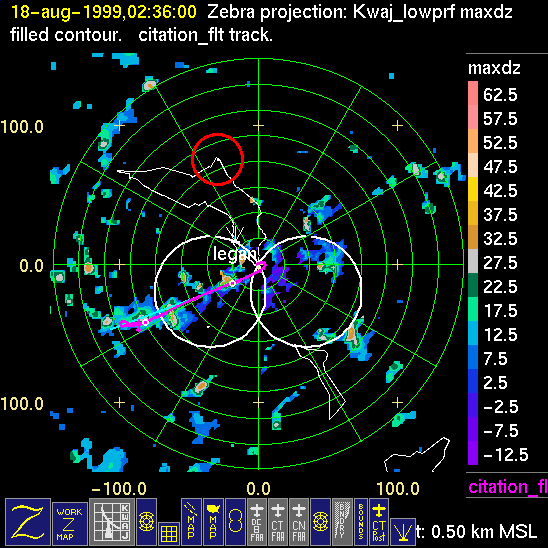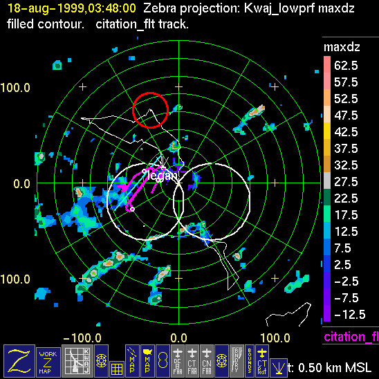 Mission summaries consist of Scientists' discussions of the flights and Radar Images overlayed with flight tracks. Separate discussions (written by the Aircraft Mission Coordinator and the chief airborne mission scientist on each aircraft participating in the mission) may be read by clicking on the "Scientists' Discussion" link shown below. Also shown below are the aircraft flight tracks (see color key below) superimposed on a series of radar echo patterns obtained by the Kwajalein S-band radar during flights. In some cases, horizontal maps of radar echo are accompanied by a vertical cross section of the radar reflectivity: indicated by light blue lines on the horizontal maps and displayed directly below them. The geography of the Kwajalein Atoll is outlined in white. The area covered by the radar is almost all open ocean. Range rings are at 10 nm intervals. The NOAA ship Ronald H. Brown is located ~22 nm (40 km) south of the Kwajalein radar. The overlapping white circles show the dual-Doppler radar lobes for the combined Kwajalein and ship radars. The red circle is a no-fly zone.