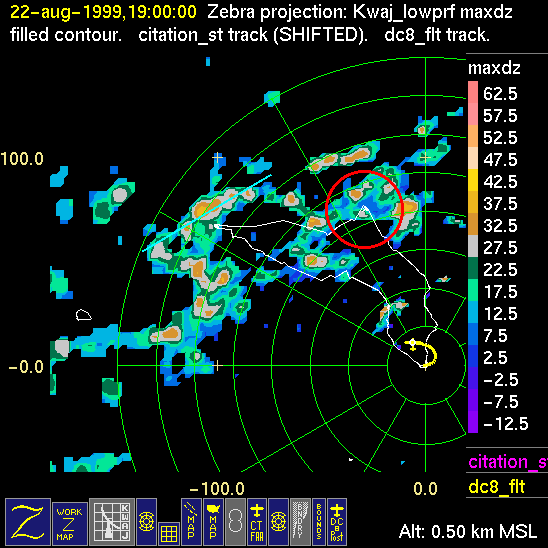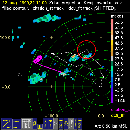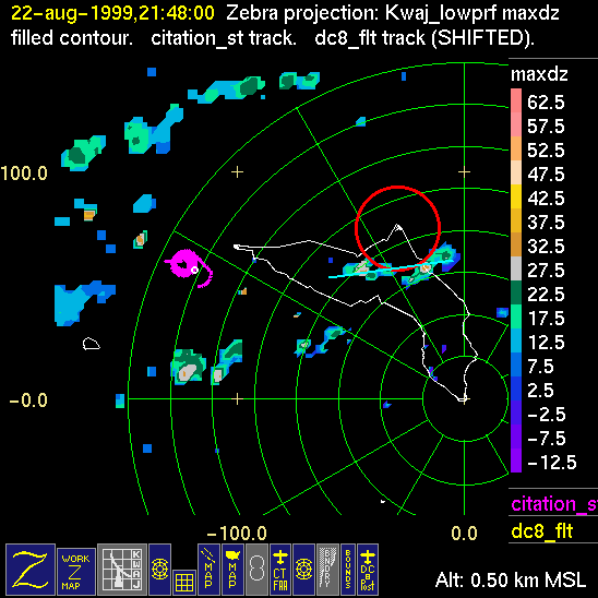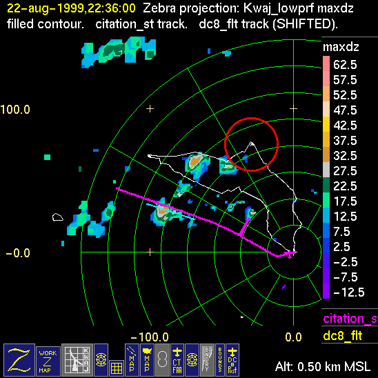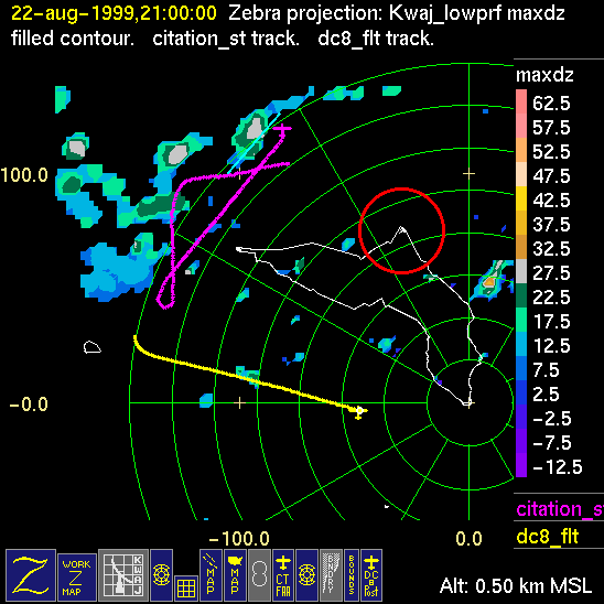 Mission summaries consist of Scientists' discussions of the flights and Radar Images overlayed with flight tracks. Separate discussions (written by the Aircraft Mission Coordinator and the chief airborne mission scientist on each aircraft participating in the mission) may be read by clicking on the "Scientists' Discussion" link shown below. Also shown below are the aircraft flight tracks (see color key below) superimposed on a series of radar echo patterns obtained by the Kwajalein S-band radar during flights. In some cases, horizontal maps of radar echo are accompanied by a vertical cross section of the radar reflectivity: indicated by light blue lines on the horizontal maps and displayed directly below them. The geography of the Kwajalein Atoll is outlined in white. The area covered by the radar is almost all open ocean. Range rings are at 10 nm intervals. The NOAA ship Ronald H. Brown is located ~22 nm (40 km) south of the Kwajalein radar. The overlapping white circles show the dual-Doppler radar lobes for the combined Kwajalein and ship radars. The red circle is a no-fly zone.