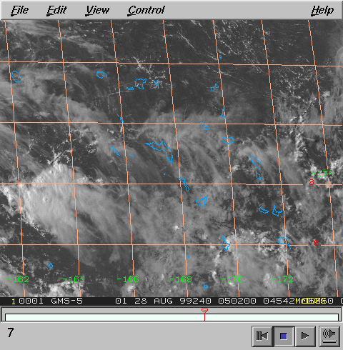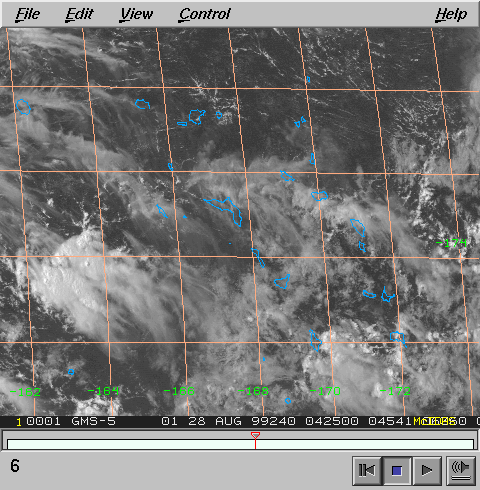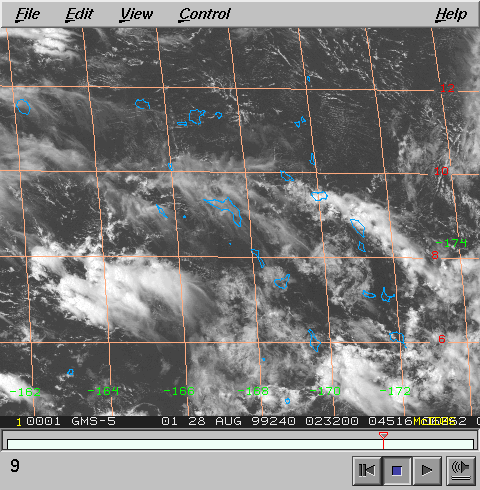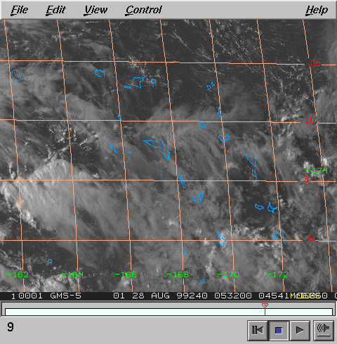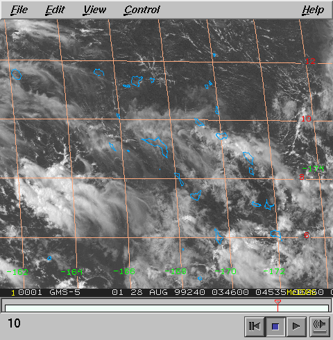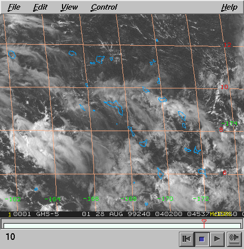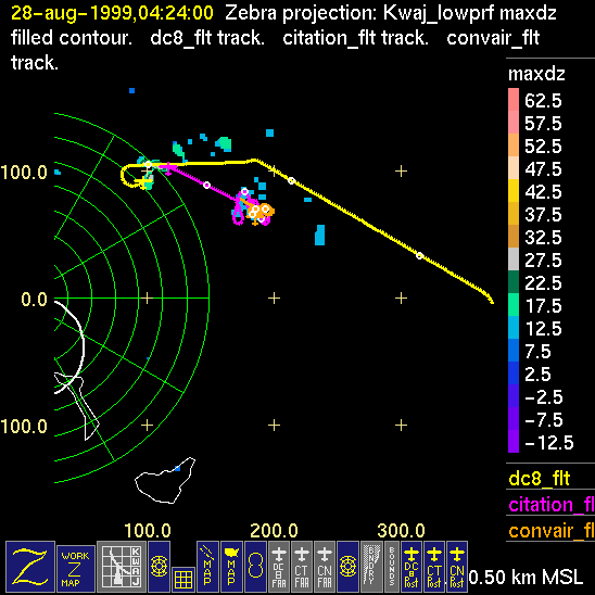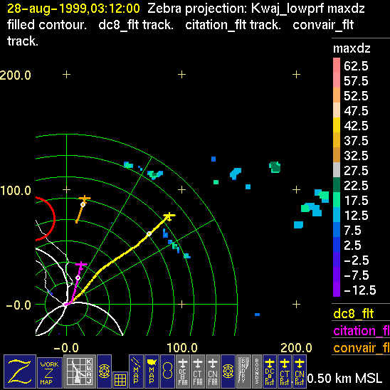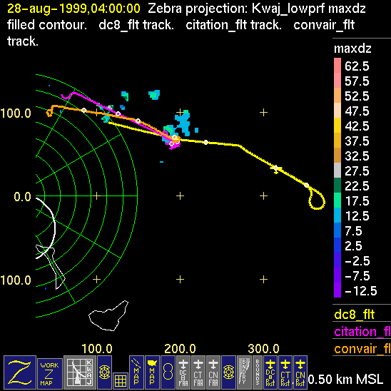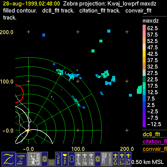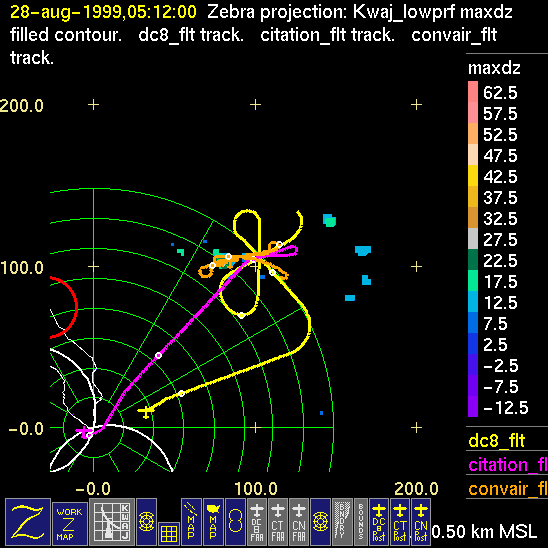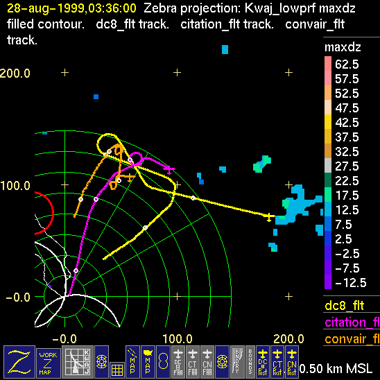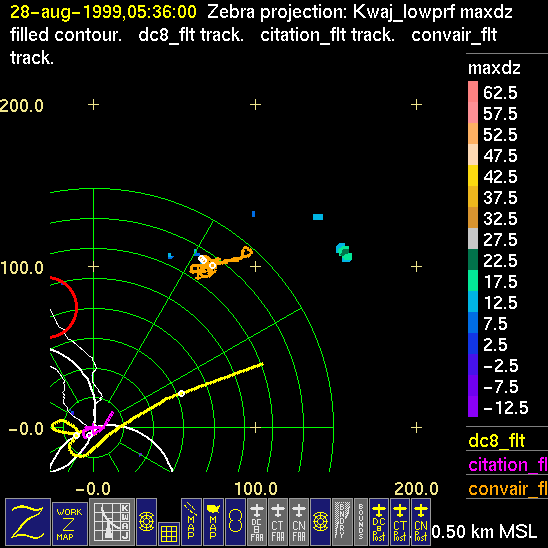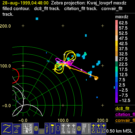 Mission summaries consist of Scientists' discussions of the flights and Radar Images overlayed with flight tracks. Separate discussions (written by the Aircraft Mission Coordinator and the chief airborne mission scientist on each aircraft participating in the mission) may be read by clicking on the "Scientists' Discussion" link shown below. Also shown below are the aircraft flight tracks (see color key below) superimposed on a series of radar echo patterns obtained by the Kwajalein S-band radar during flights. Echo along radials 296-297 deg. is non-meteorological. The geography of the Kwajalein Atoll is outlined in white. The area covered by the radar is almost all open ocean. Range rings are at 10 nm intervals. The NOAA ship Ronald H. Brown is located ~22 nm (40 km) southwest of the Kwajalein radar. The overlapping white circles show the dual-Doppler radar lobes for the combined Kwajalein and ship radars. The red circle is a no-fly zone.