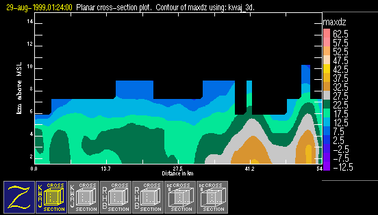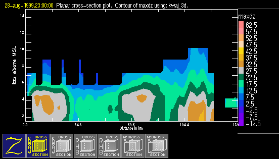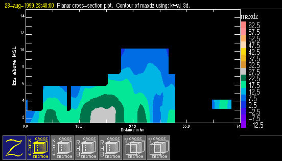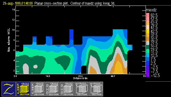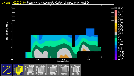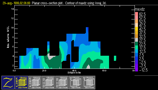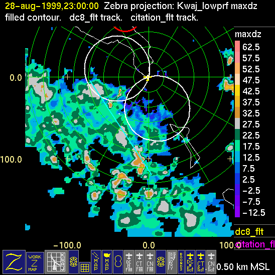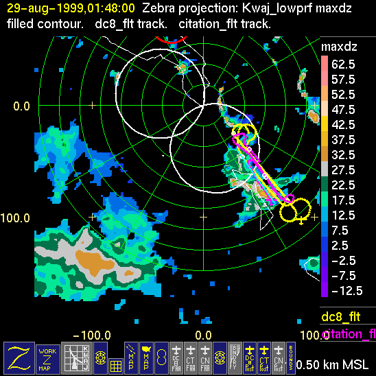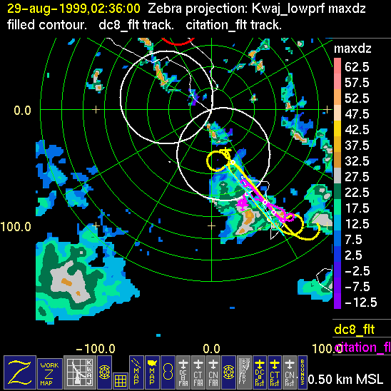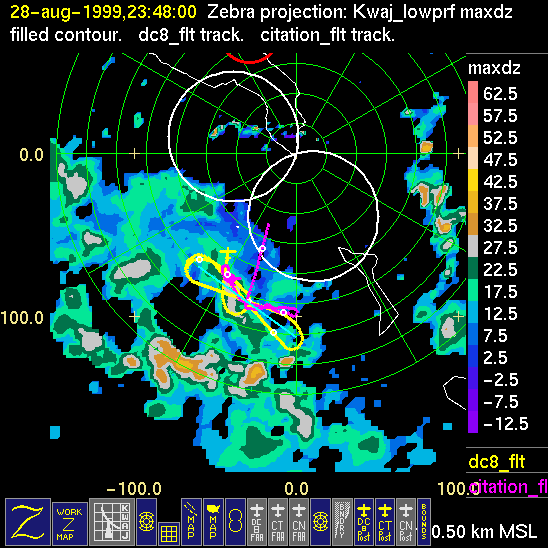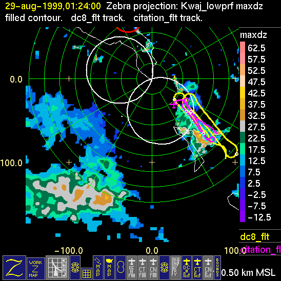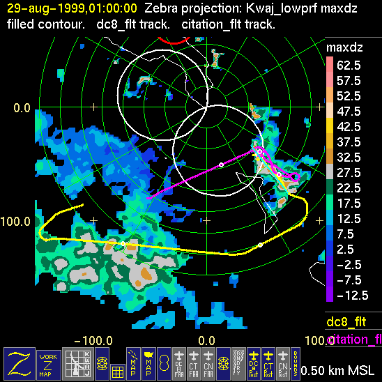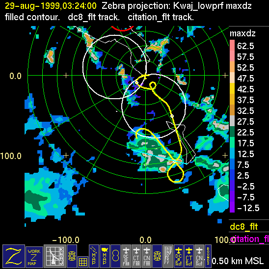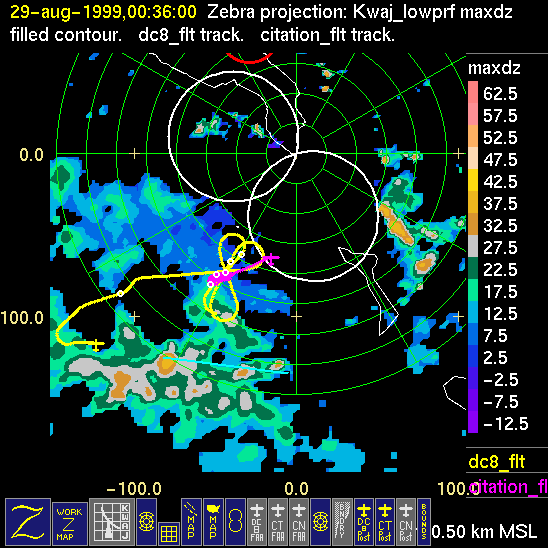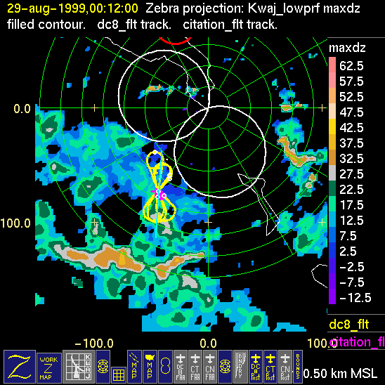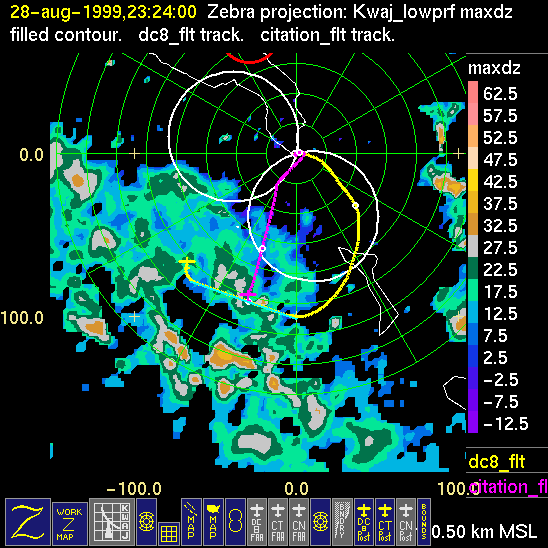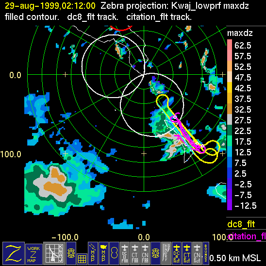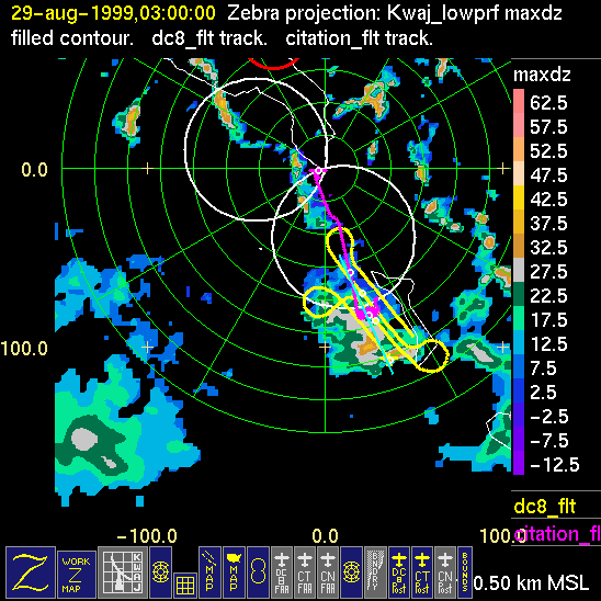Mission summaries consist of Scientists' discussions of the flights and Radar Images overlayed with flight tracks. Separate discussions (written by the Aircraft Mission Coordinator and the chief airborne mission scientist on each aircraft participating in the mission) may be read by clicking on the "Scientists' Discussion" link shown below. Also shown below are the aircraft flight tracks (see color key below) superimposed on a series of radar echo patterns obtained by the Kwajalein S-band radar during flights. Echo along radials 296-297 deg. is non-meteorological. The geography of the Kwajalein Atoll is outlined in white. The area covered by the radar is almost all open ocean. Range rings are at 10 nm intervals. The NOAA ship Ronald H. Brown is located ~22 nm (40 km) south of the Kwajalein radar. The overlapping white circles show the dual-Doppler radar lobes for the combined Kwajalein and ship radars. The red circle is a no-fly zone.