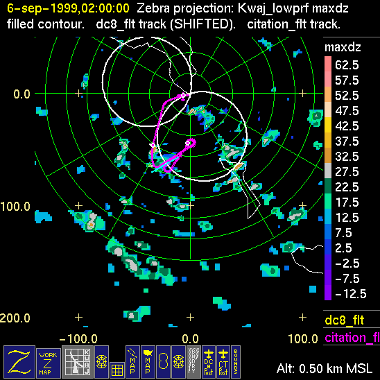 Mission summaries consist of Scientists' discussions of the flights and Radar Images overlayed with flight tracks. Separate discussions (written by the Aircraft Mission Coordinator and the chief airborne mission scientist on each aircraft participating in the mission) may be read by clicking on the "Scientists' Discussion" link shown below. Also shown below are the aircraft flight tracks (see color key below) superimposed on a series of radar echo patterns obtained by the Kwajalein S-band radar during flights. In some cases, horizontal maps of radar echo are accompanied by a vertical cross section of the radar reflectivity: indicated by light blue lines on the horizontal maps and displayed directly below them. The geography of the Kwajalein Atoll is outlined in white. The area covered by the radar is almost all open ocean. Range rings are at 10 nm intervals. The NOAA ship Ronald H. Brown is located ~22 nm (40 km) southwest of the Kwajalein radar. The overlapping white circles show the dual-Doppler radar lobes for the combined Kwajalein and ship radars. The red circle is a no-fly zone.