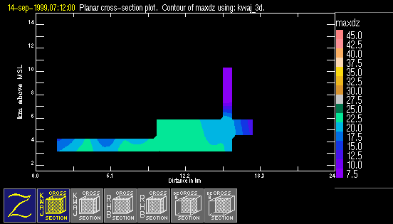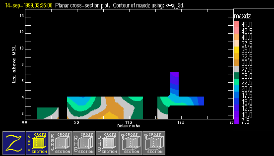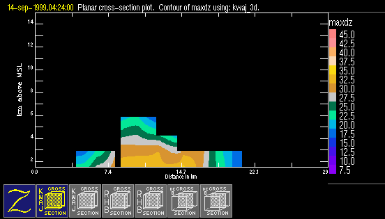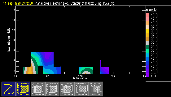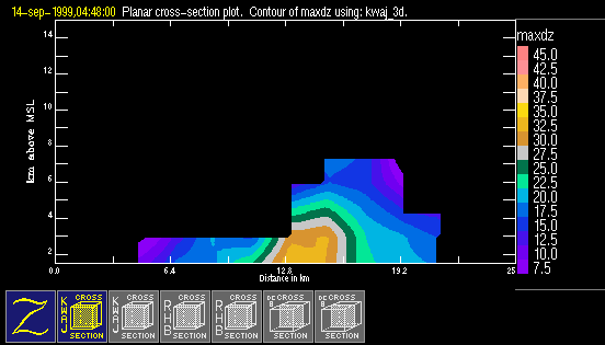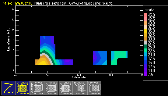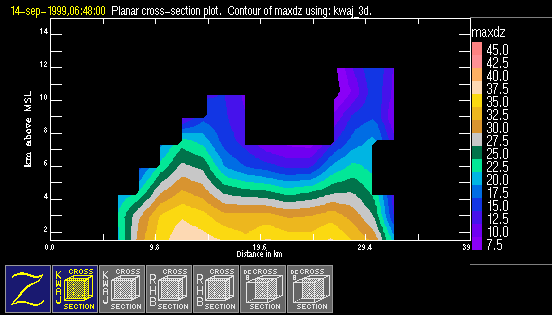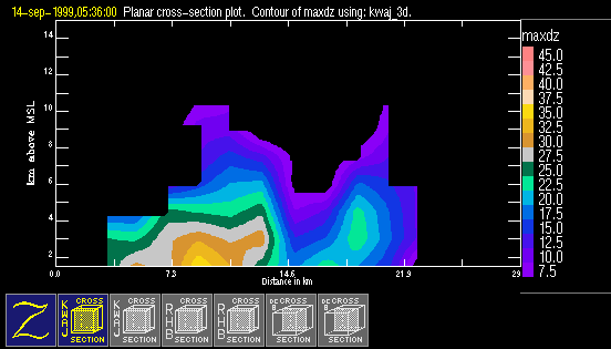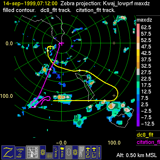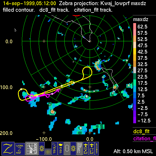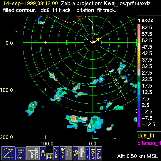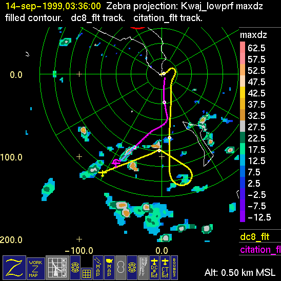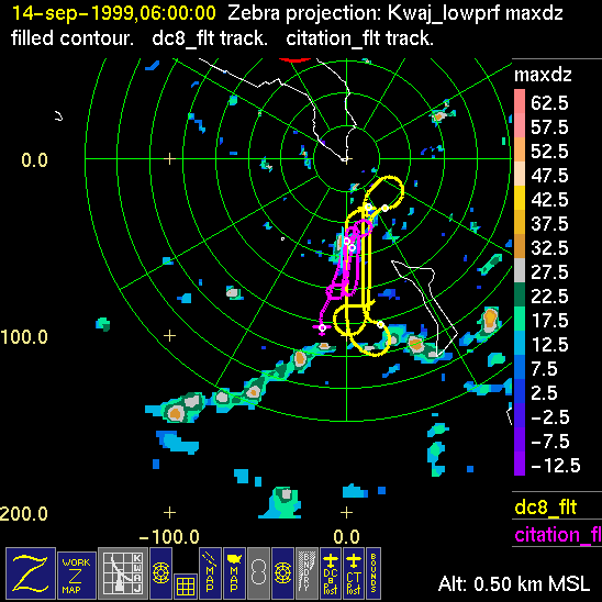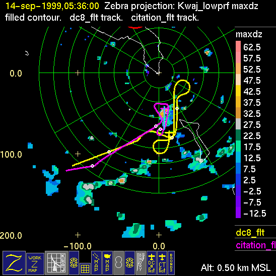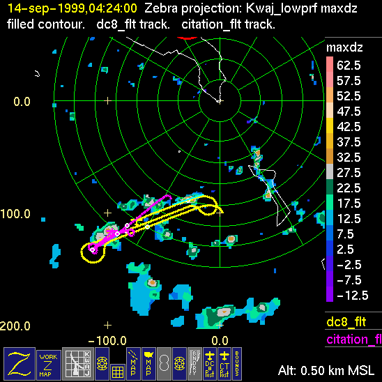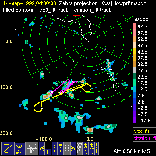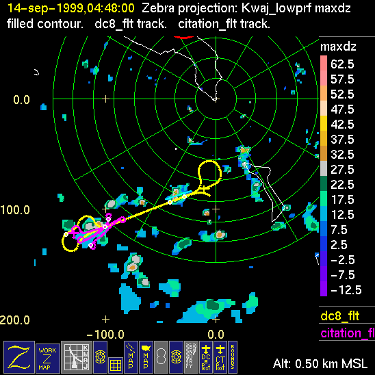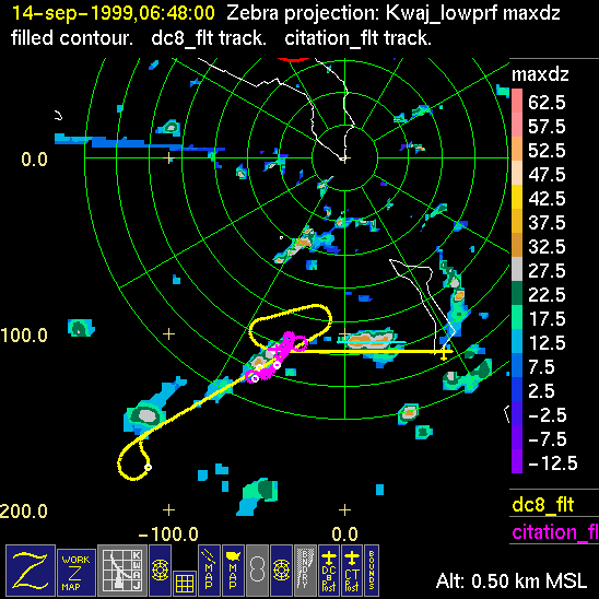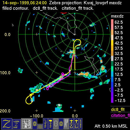 Mission summaries consist of Scientists' discussions of the flights and Radar Images overlayed with flight tracks. Separate discussions (written by the Aircraft Mission Coordinator and the chief airborne mission scientist on each aircraft participating in the mission) may be read by clicking on the "Scientists' Discussion" link shown below. Also shown below are the aircraft flight tracks (see color key below) superimposed on a series of radar echo patterns obtained by the Kwajalein S-band radar during flights. In some cases, horizontal maps of radar echo are accompanied by a vertical cross section of the radar reflectivity: indicated by light blue lines on the horizontal maps and displayed directly below them. The geography of the Kwajalein Atoll is outlined in white. The area covered by the radar is almost all open ocean. Range rings are at 10 nm intervals. The NOAA ship Ronald H. Brown is located ~22 nm (40 km) southwest of the Kwajalein radar. The overlapping white circles show the dual-Doppler radar lobes for the combined Kwajalein and ship radars. The red circle is a no-fly zone.