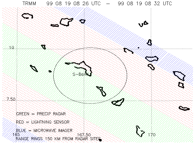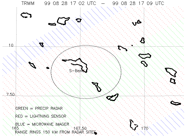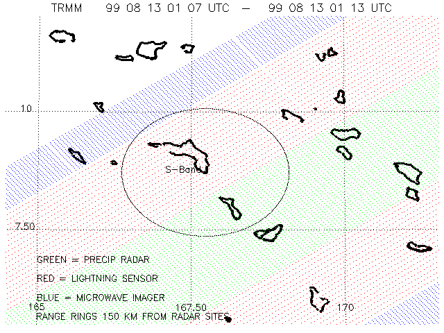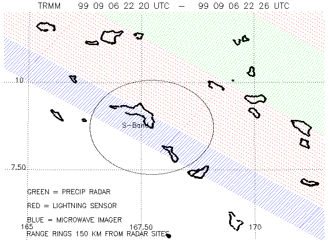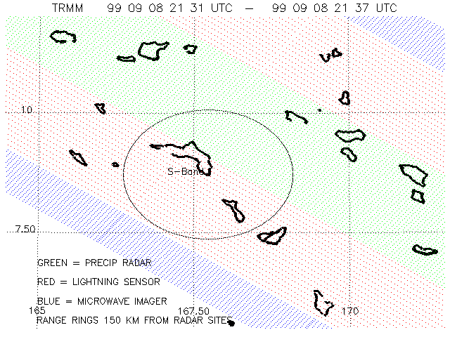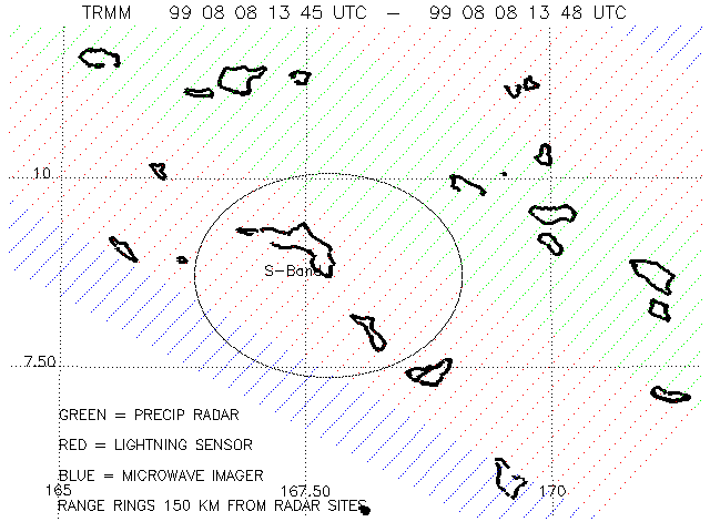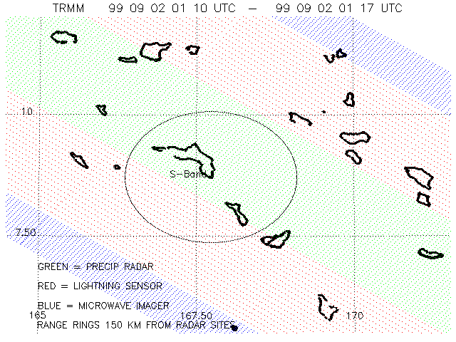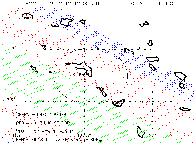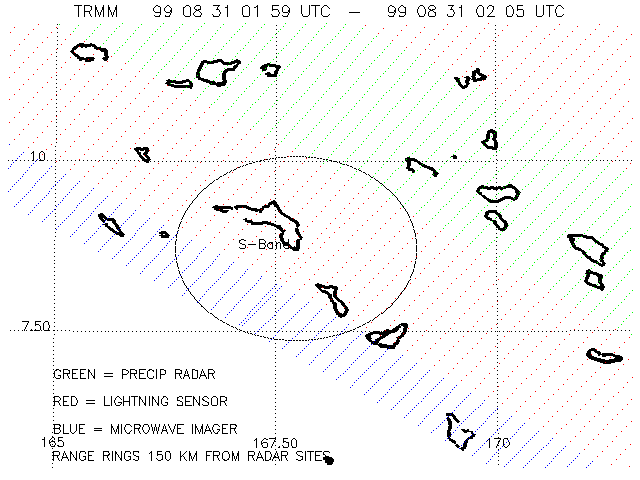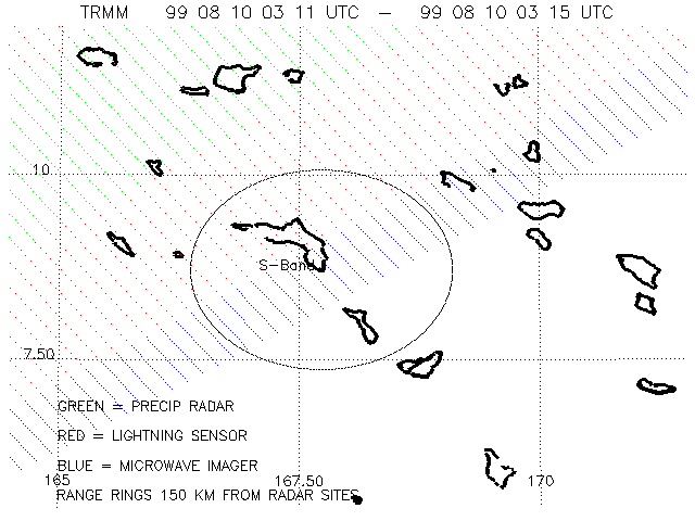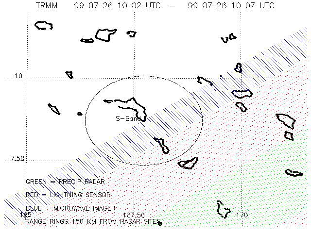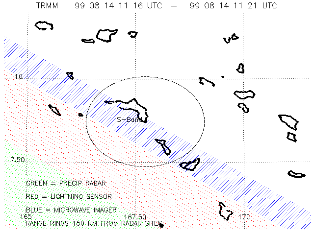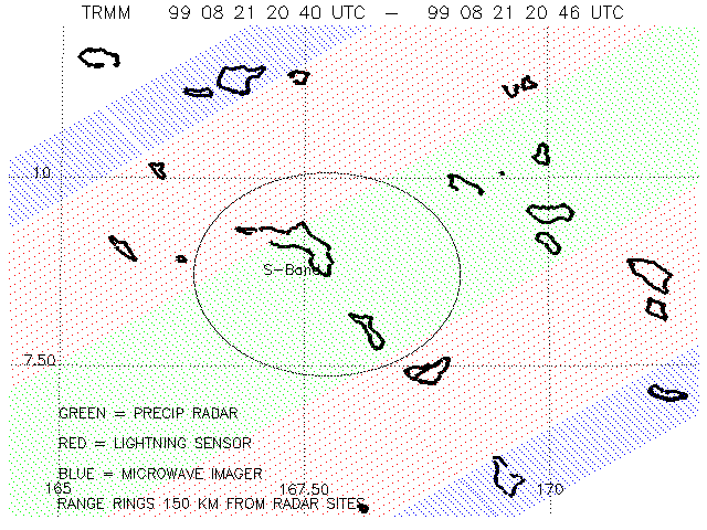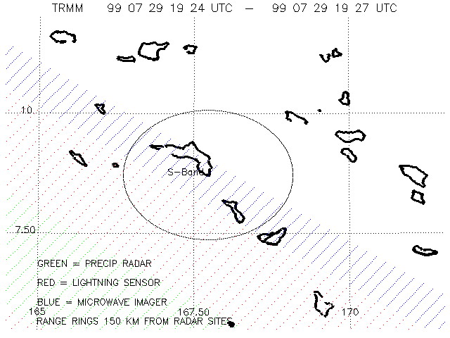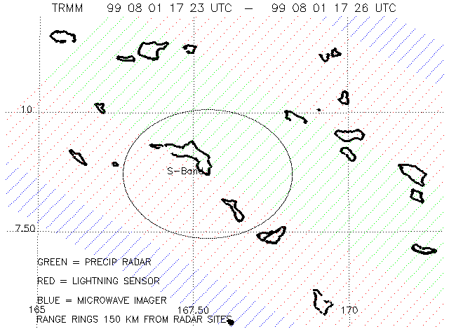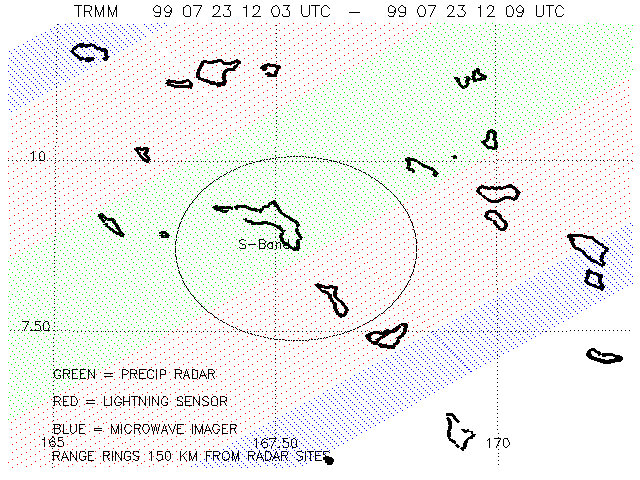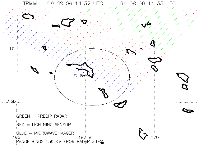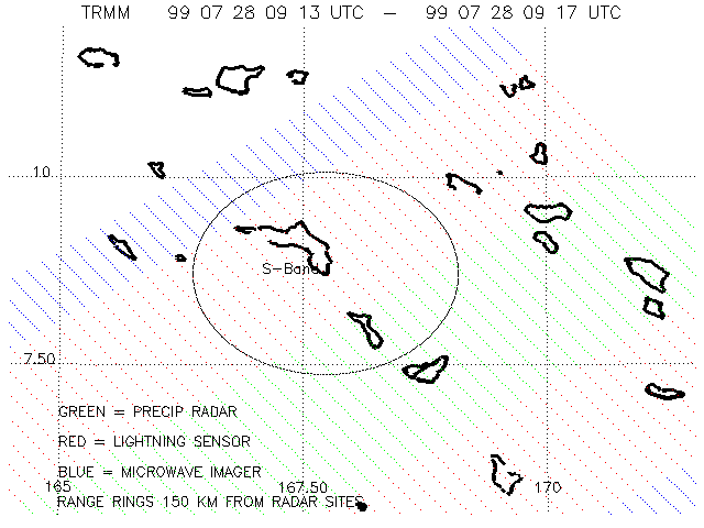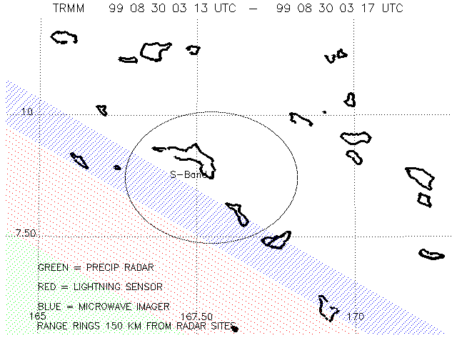 S-band radar area (150 km radius centered on Kwajalein) with the PR and