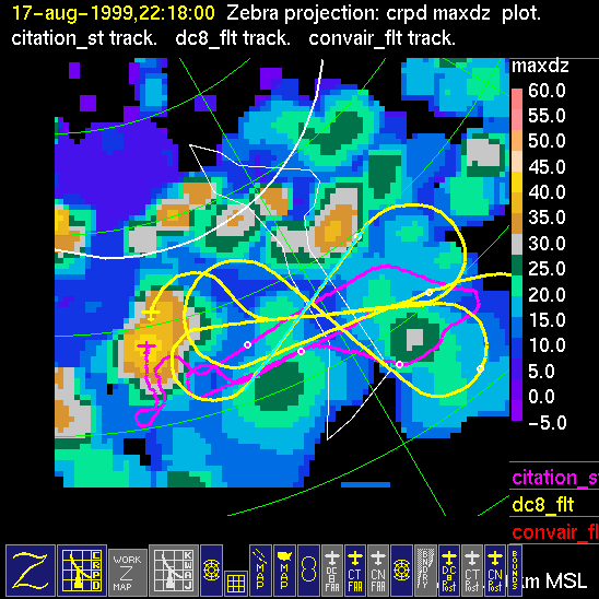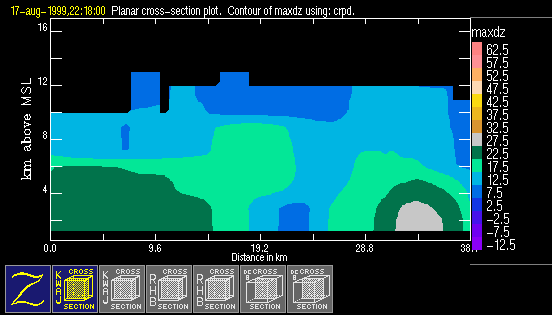 KWAJEX Radar Leg 3 - 17 AUG 2222 - Nadir dBZ Table The radar volumes shown are those overlapping the time of flight leg. The KWAJEX radar calibration was applied to these data and the 3D volumes were interpolated to 1 km x 1 km x 1 km resolution. The vertical cross-section is taken approximately along the flight track. The exact position of the vertical cross-section is indicated by the blue line in the horizontal cross-section.