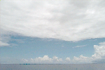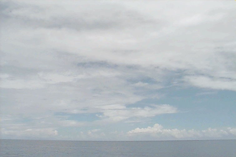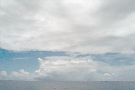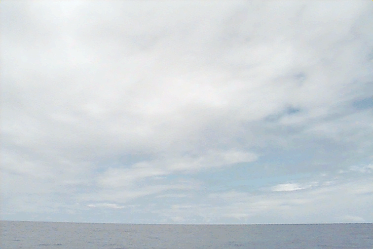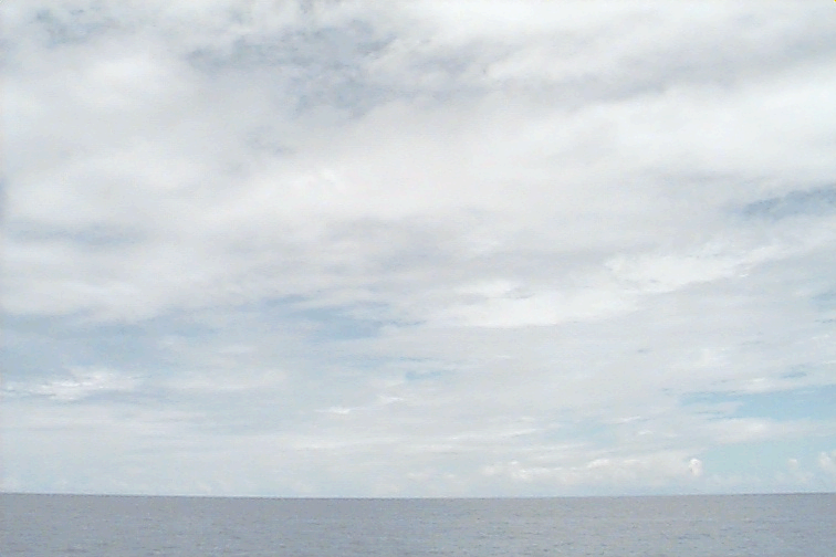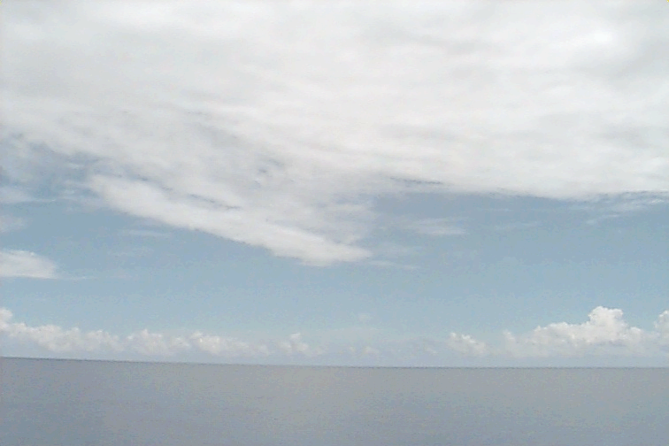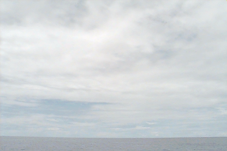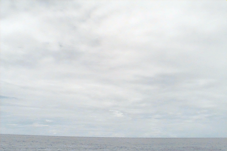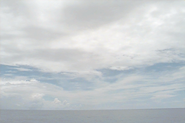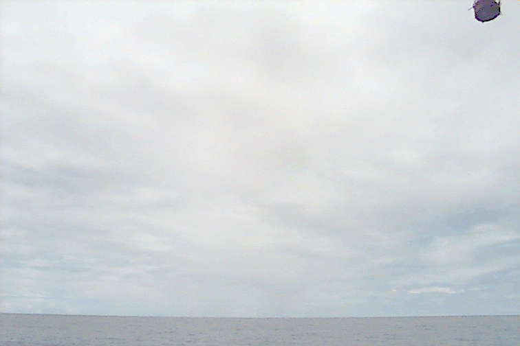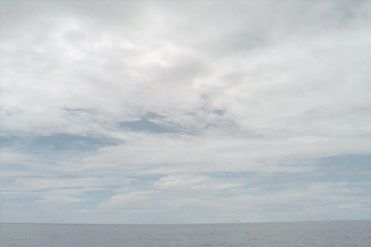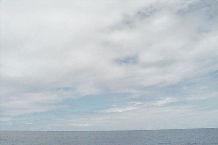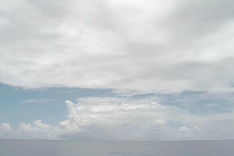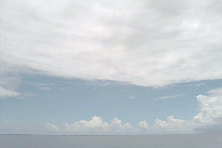Ac deck extending from the S just N of ship. Cb with anvil E. Large Cu complex NE: wide base but only extends to mid-levels; not sheared, just stopped growing; raining.