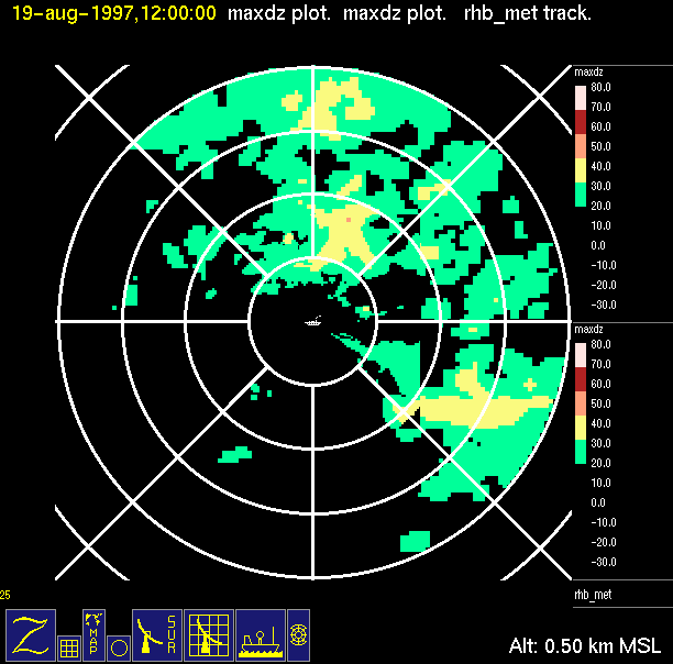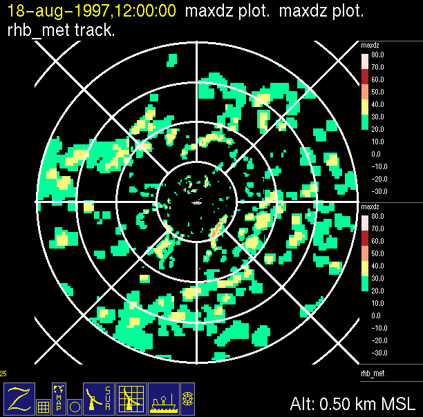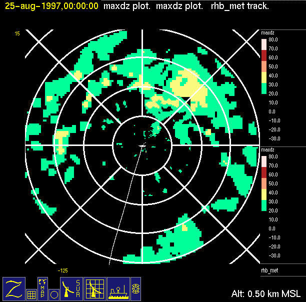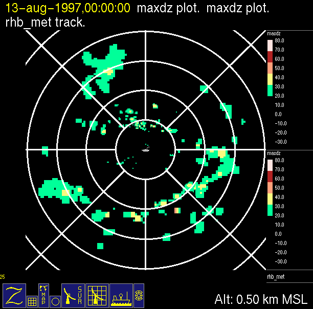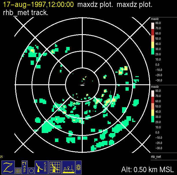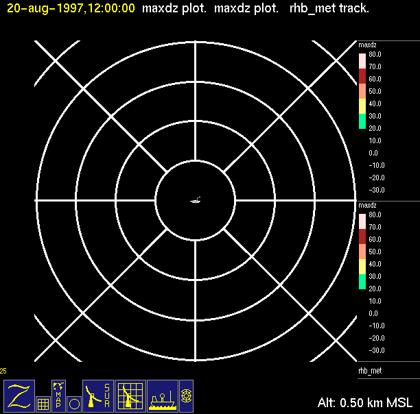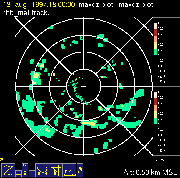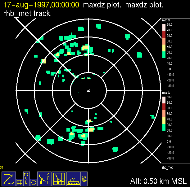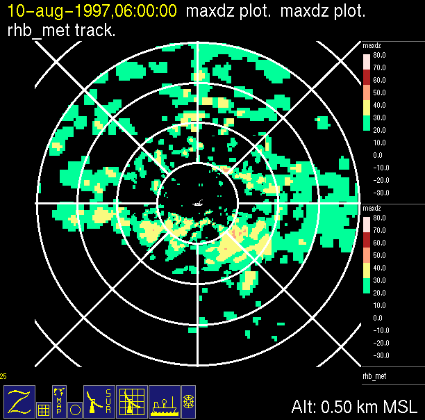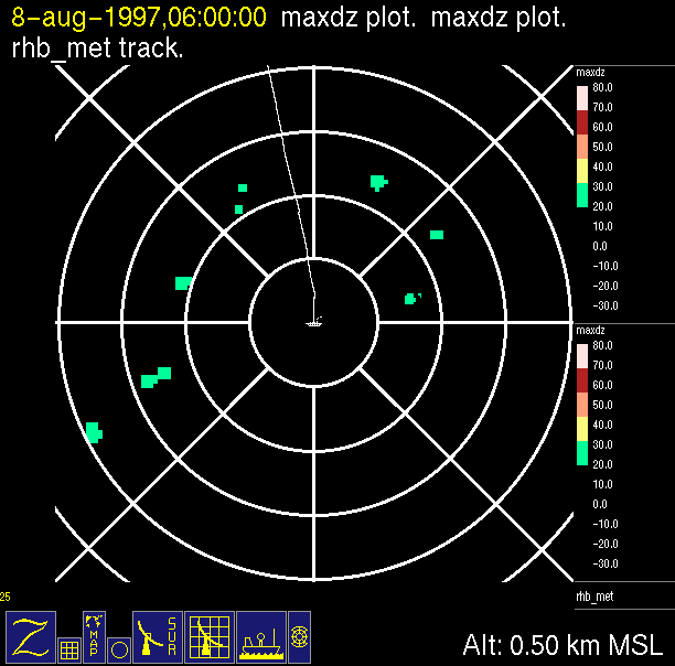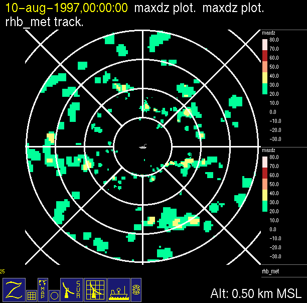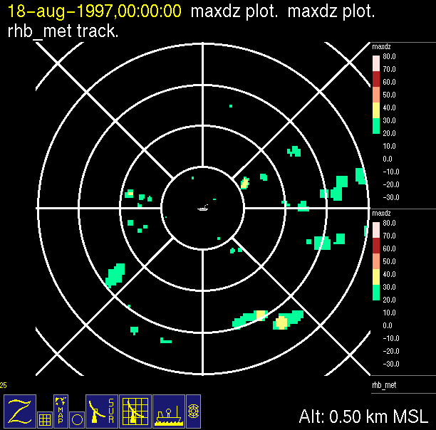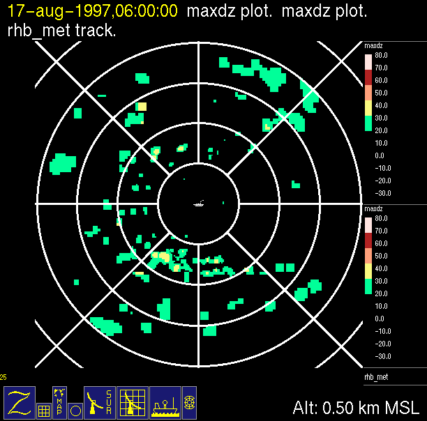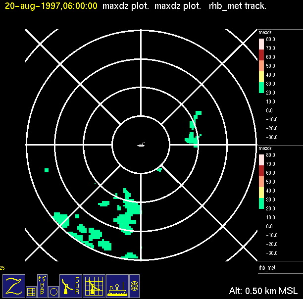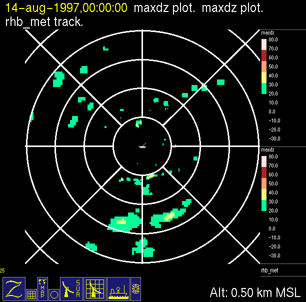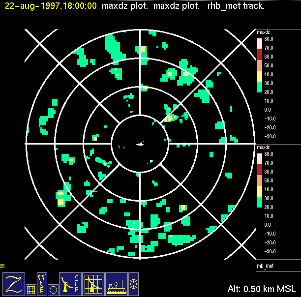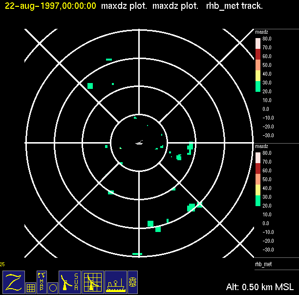 The ITCZ radar scan strategy had two main components: surveillance of the larger scale region within 240 km of the ship and collection of high resoution three-dimensional volume data within 100 km. Two three-dimensional volume scans and one surveillance scan were repeated every 15 minutes. This type of scan was used for the duration of the cruise while operating in or near the ITCZ.