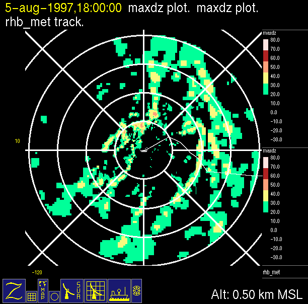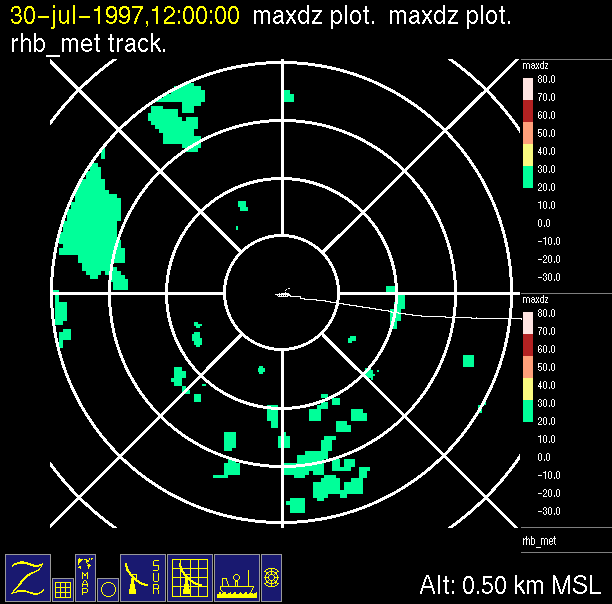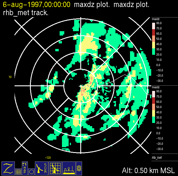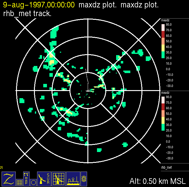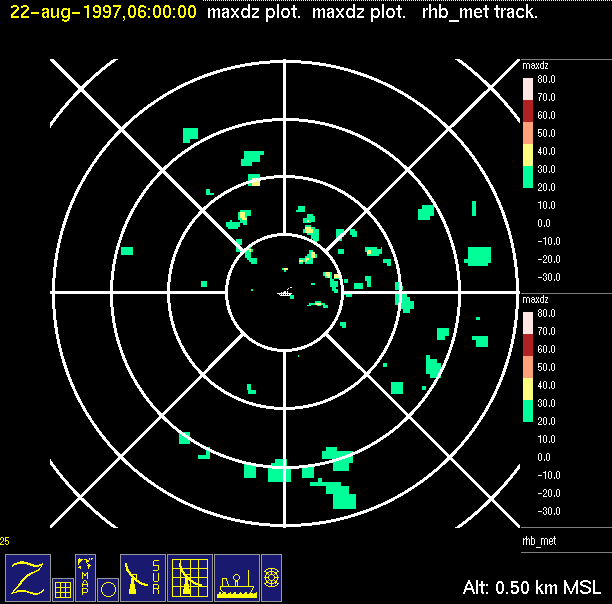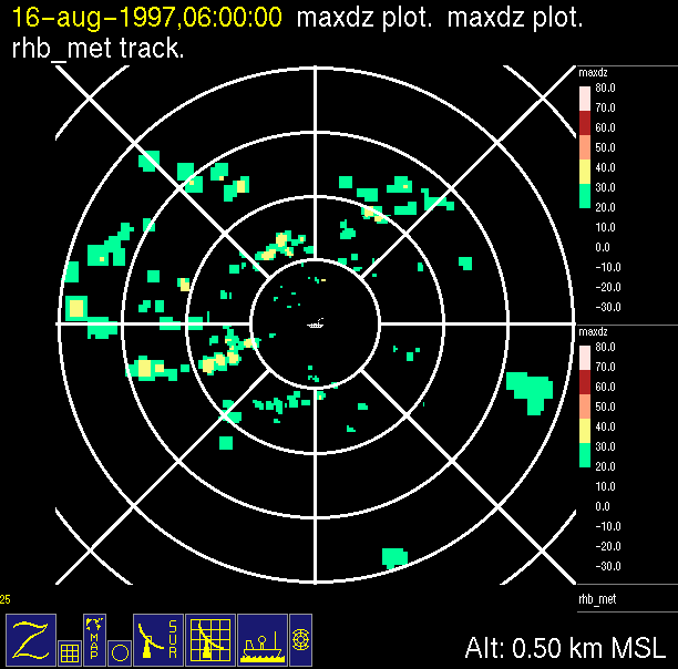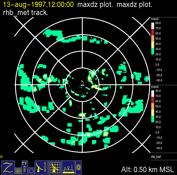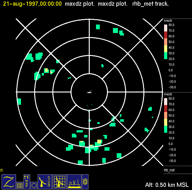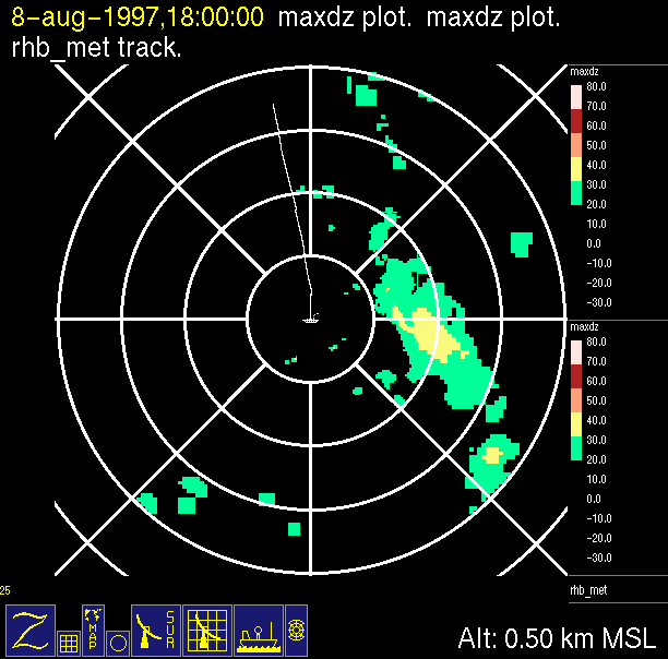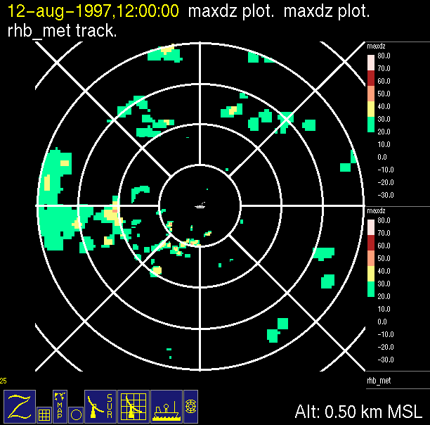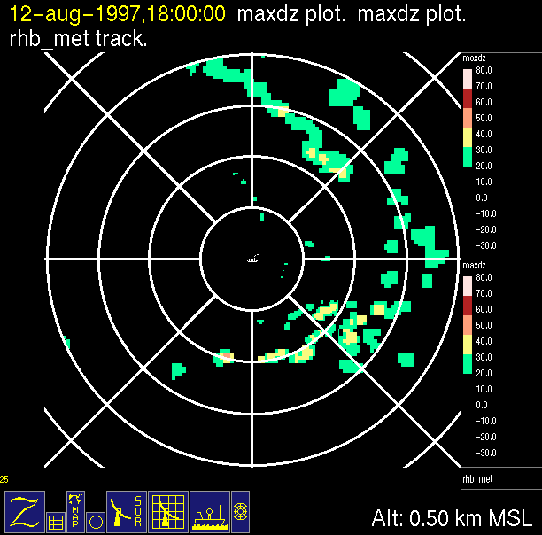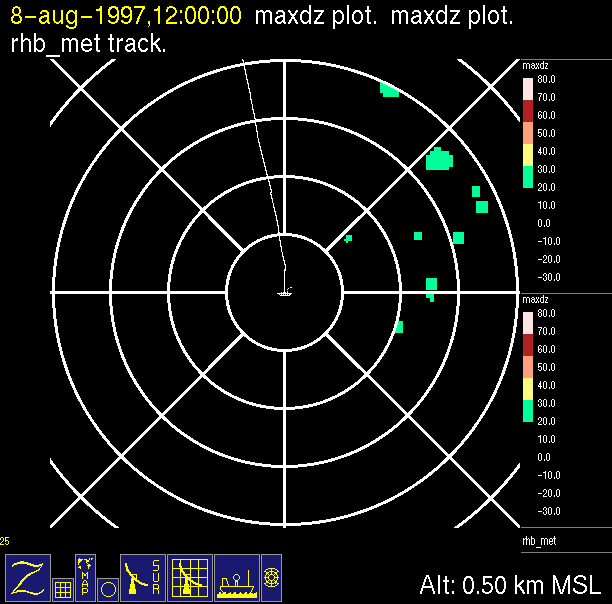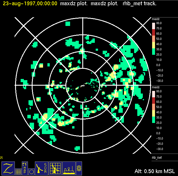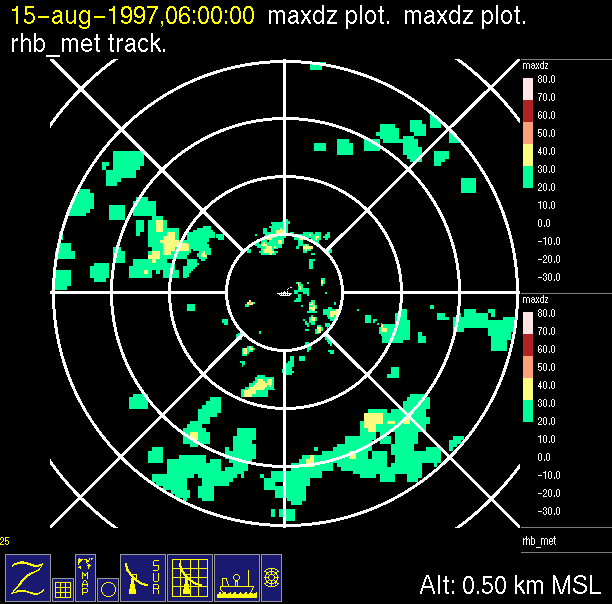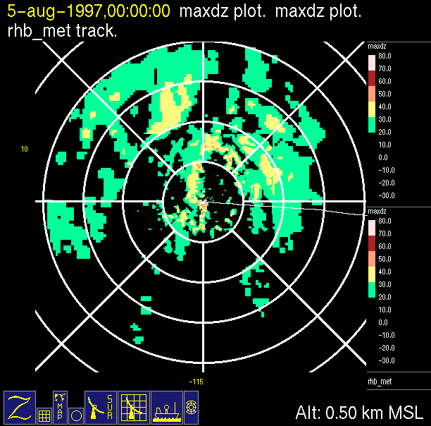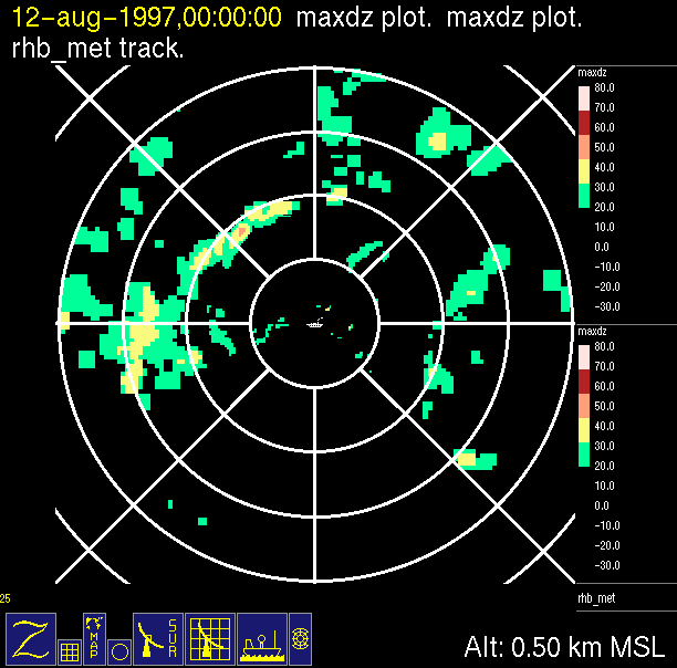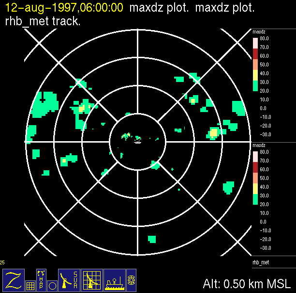 The ITCZ radar scan strategy had two main components: surveillance of the larger scale region within 240 km of the ship and collection of high resoution three-dimensional volume data within 100 km. Two three-dimensional volume scans and one surveillance scan were repeated every 15 minutes. This type of scan was used for the duration of the cruise while operating in or near the ITCZ.