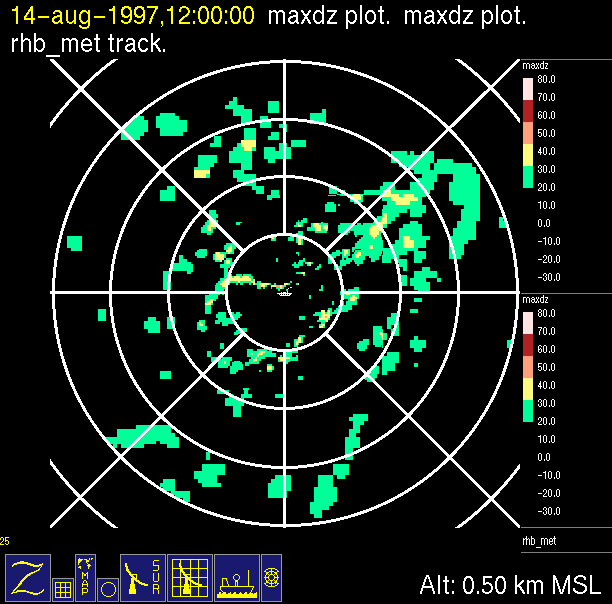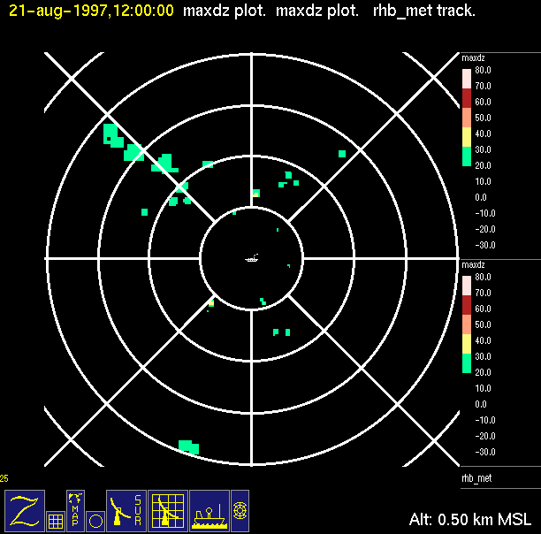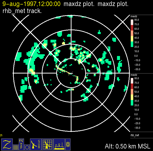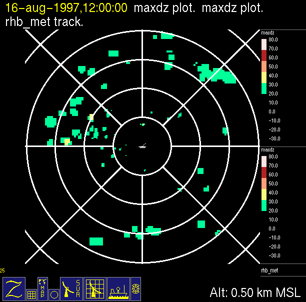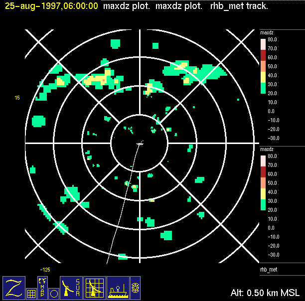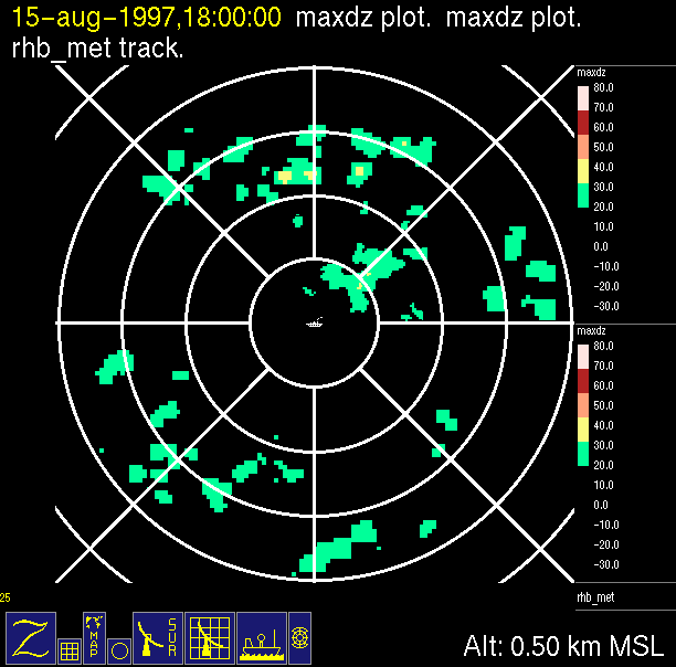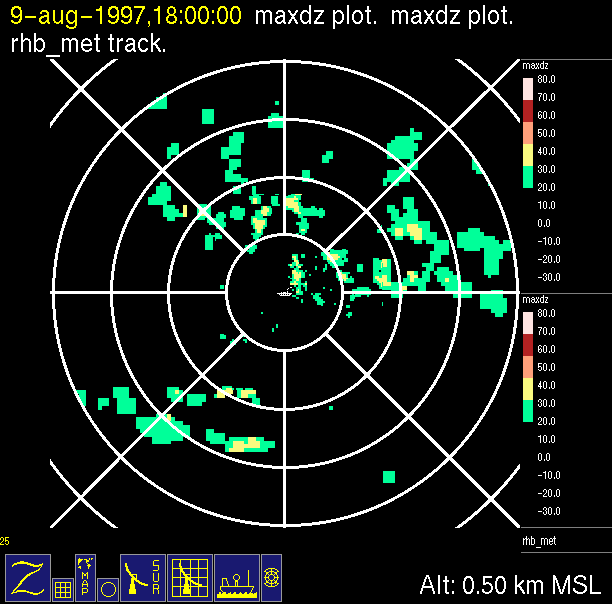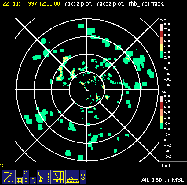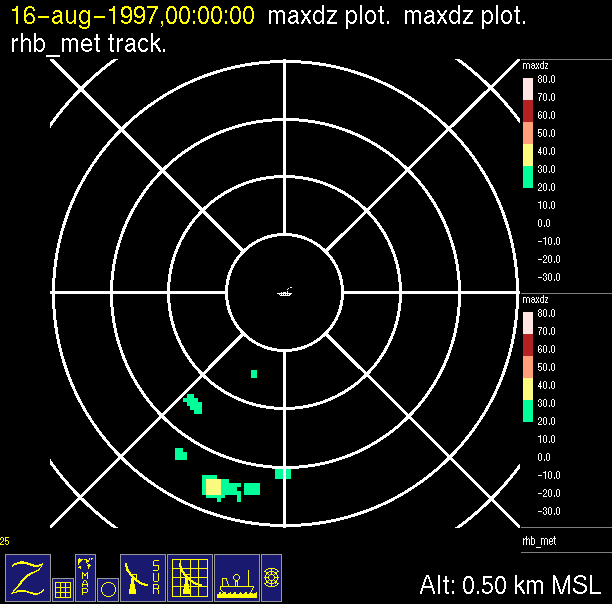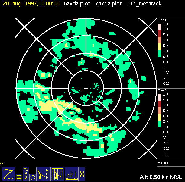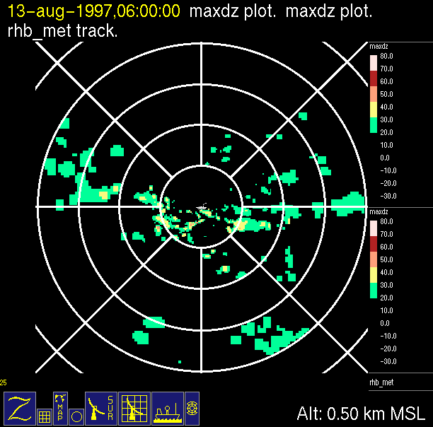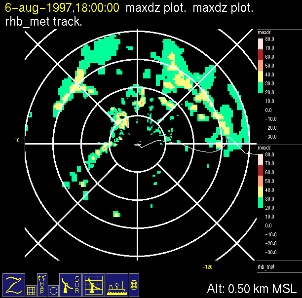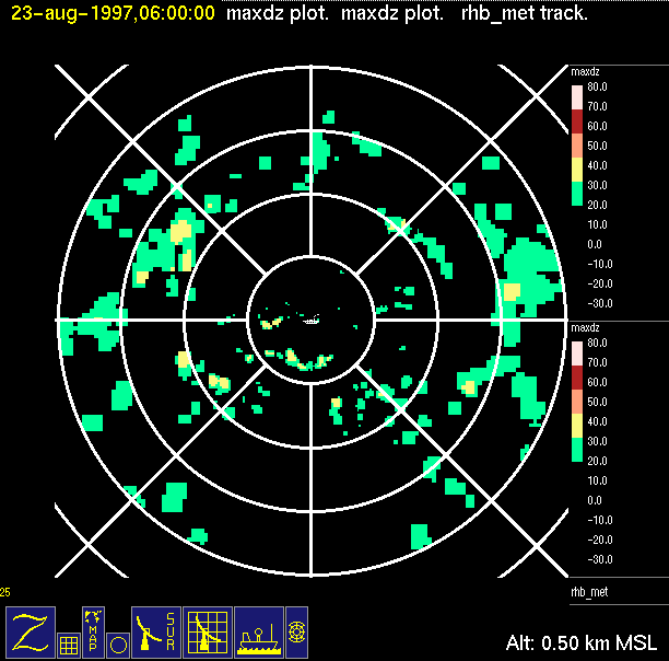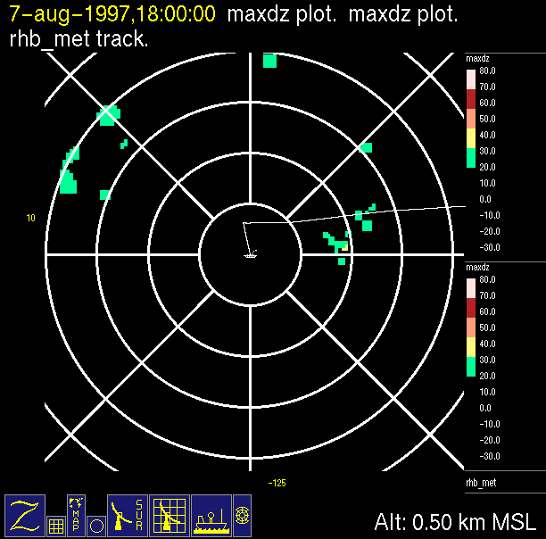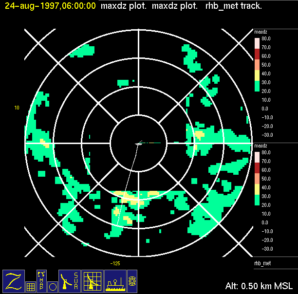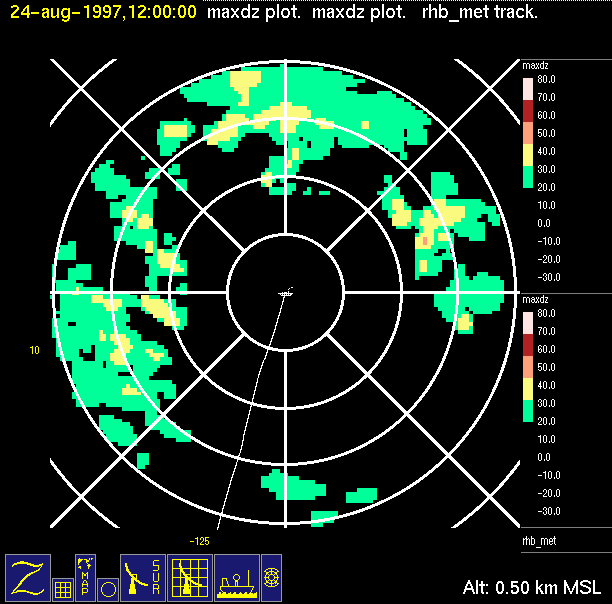 The ITCZ radar scan strategy had two main components: surveillance of the larger scale region within 240 km of the ship and collection of high resoution three-dimensional volume data within 100 km. Two three-dimensional volume scans and one surveillance scan were repeated every 15 minutes. This type of scan was used for the duration of the cruise while operating in or near the ITCZ.