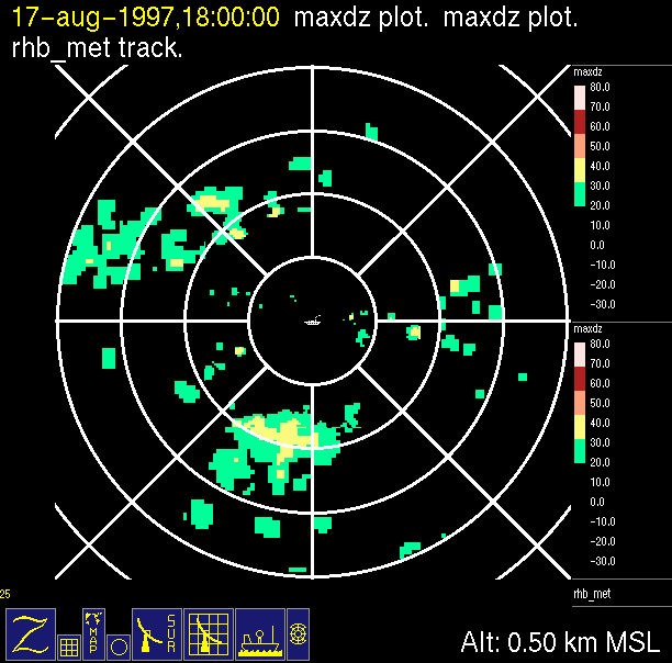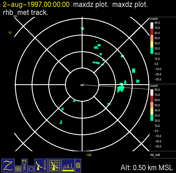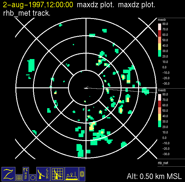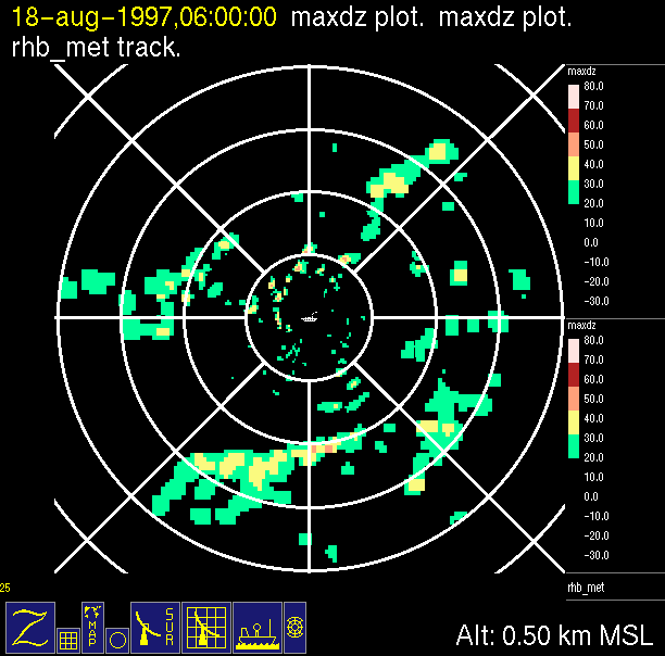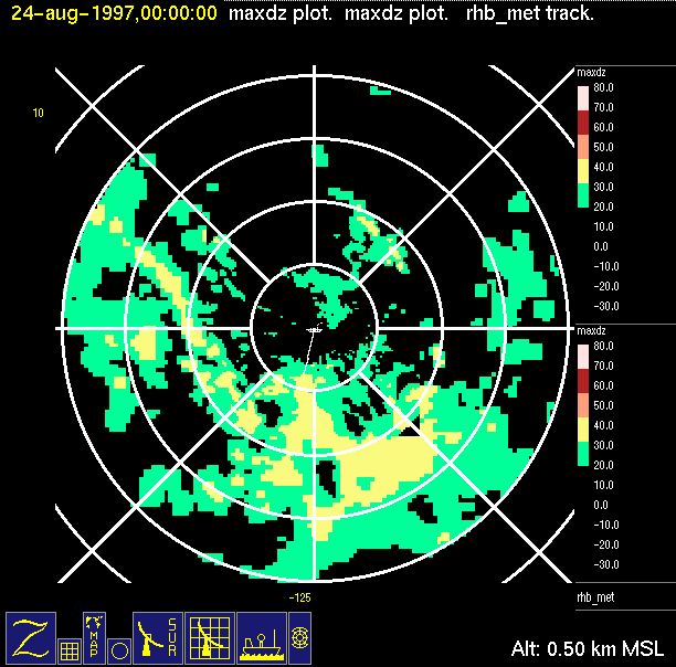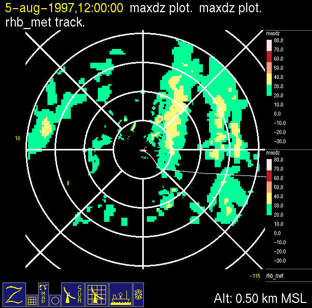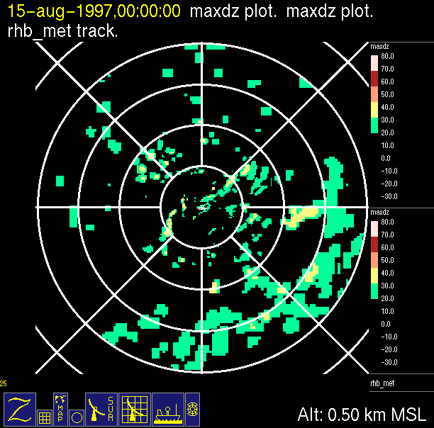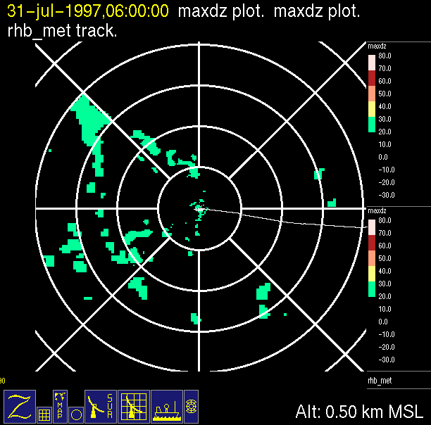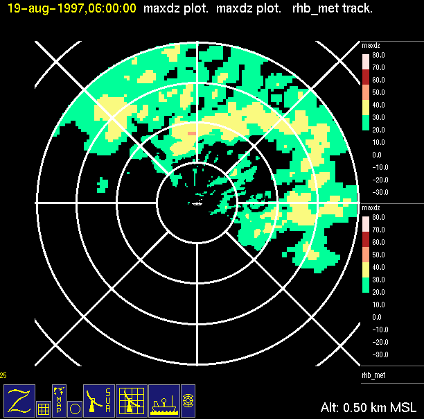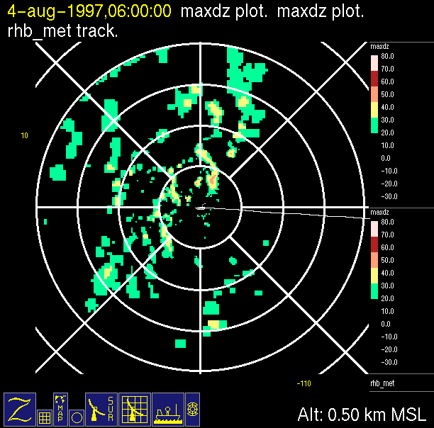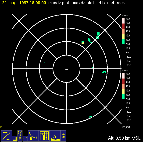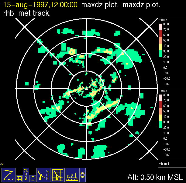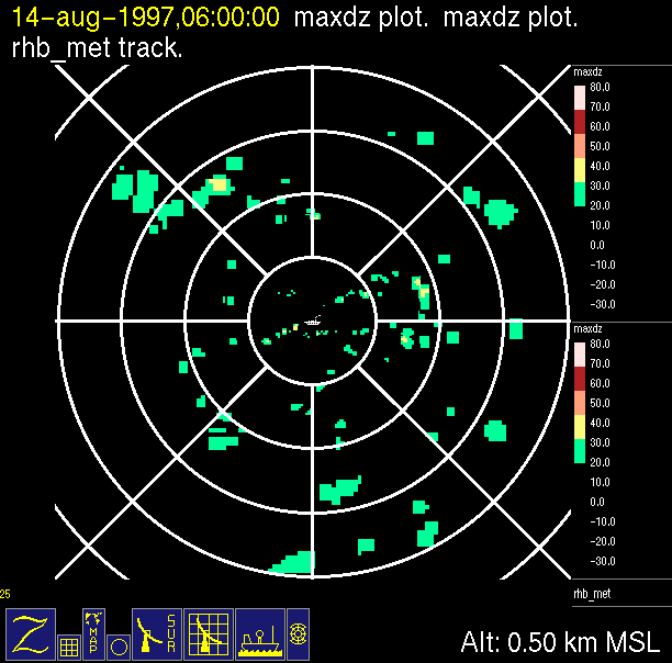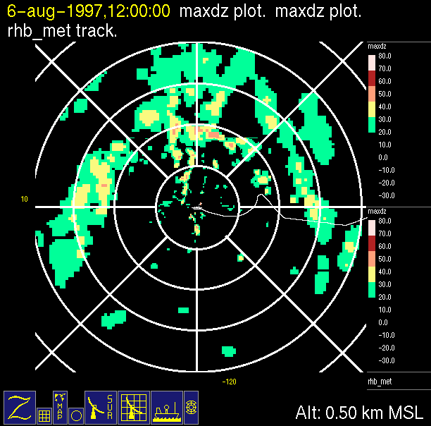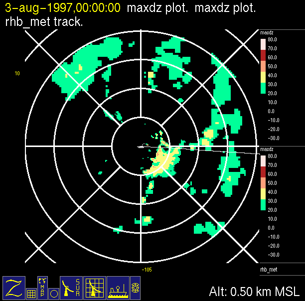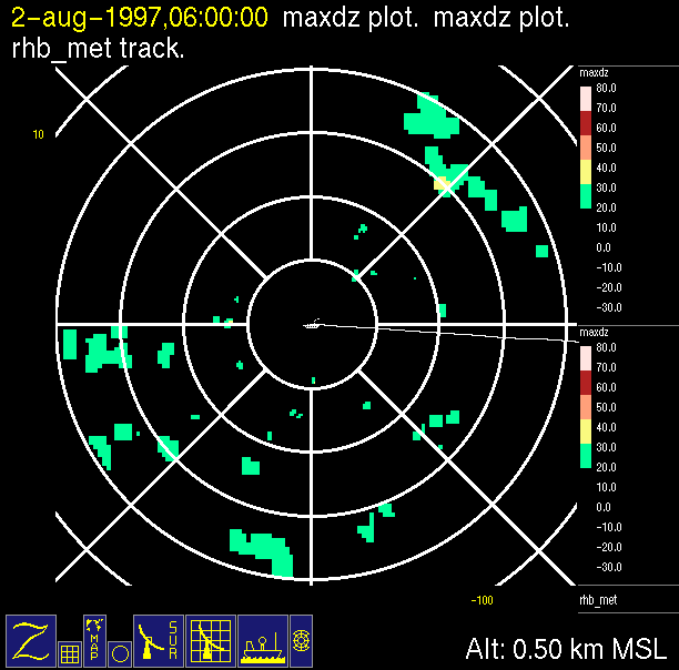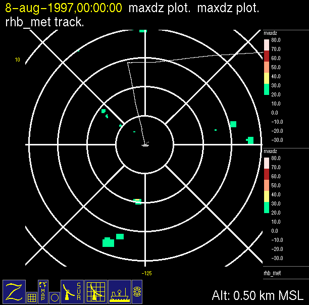 The ITCZ radar scan strategy had two main components: surveillance of the larger scale region within 240 km of the ship and collection of high resoution three-dimensional volume data within 100 km. Two three-dimensional volume scans and one surveillance scan were repeated every 15 minutes. This type of scan was used for the duration of the cruise while operating in or near the ITCZ.