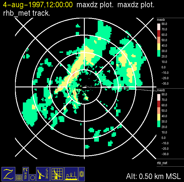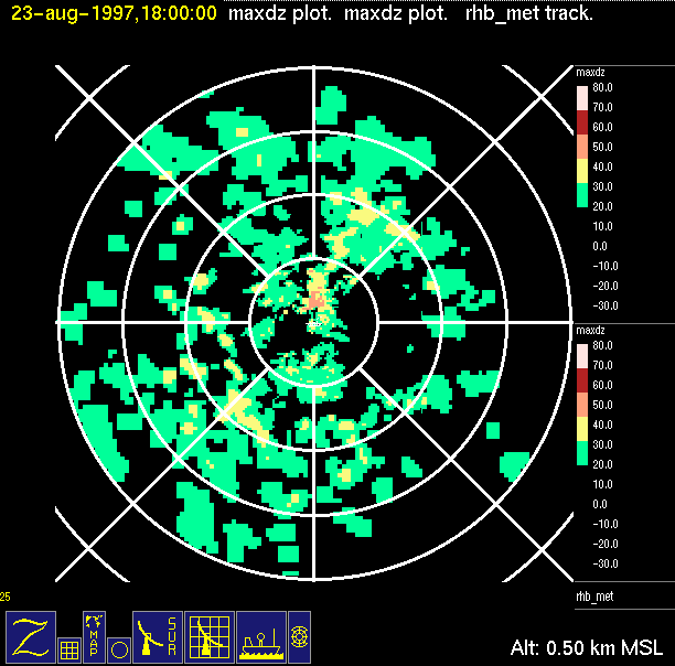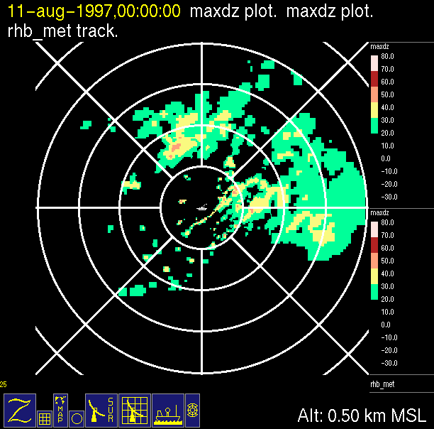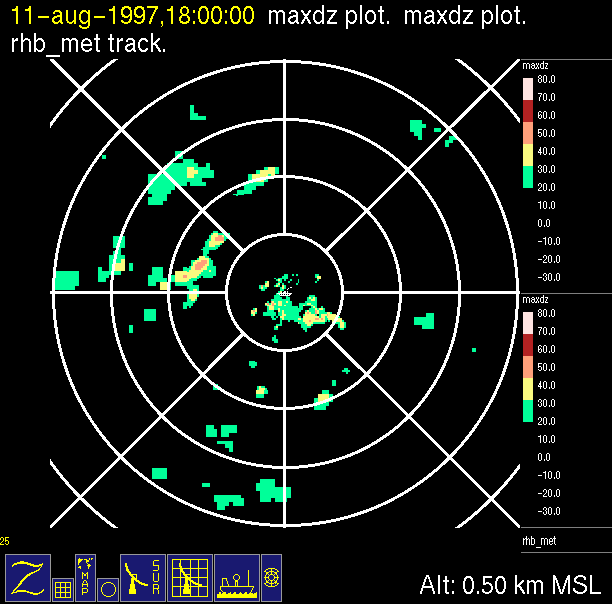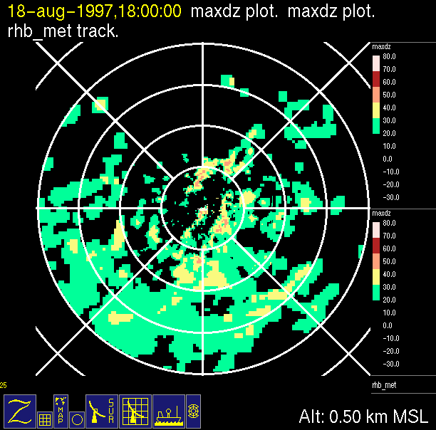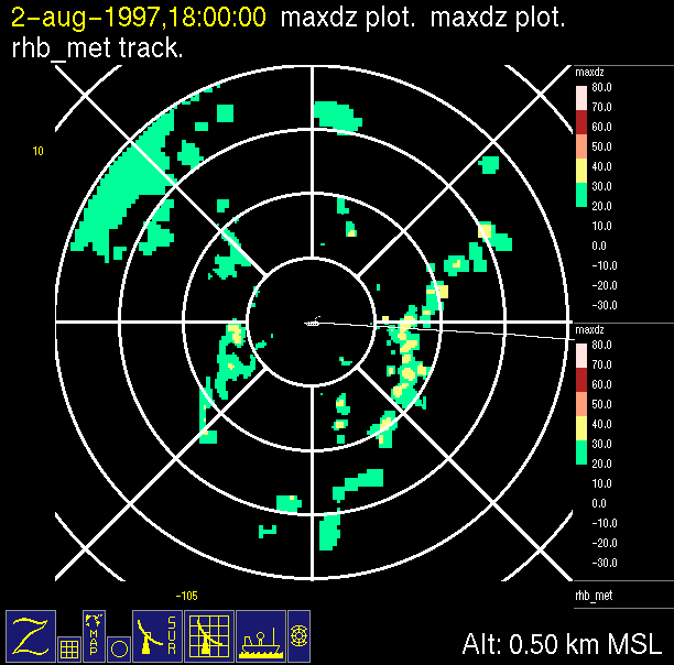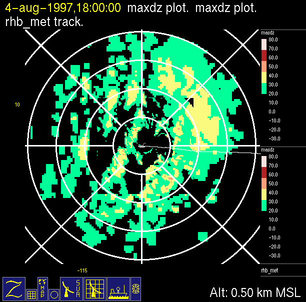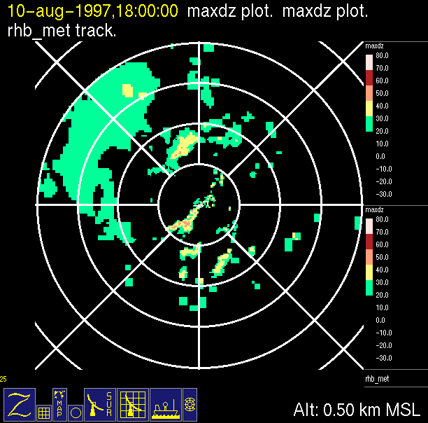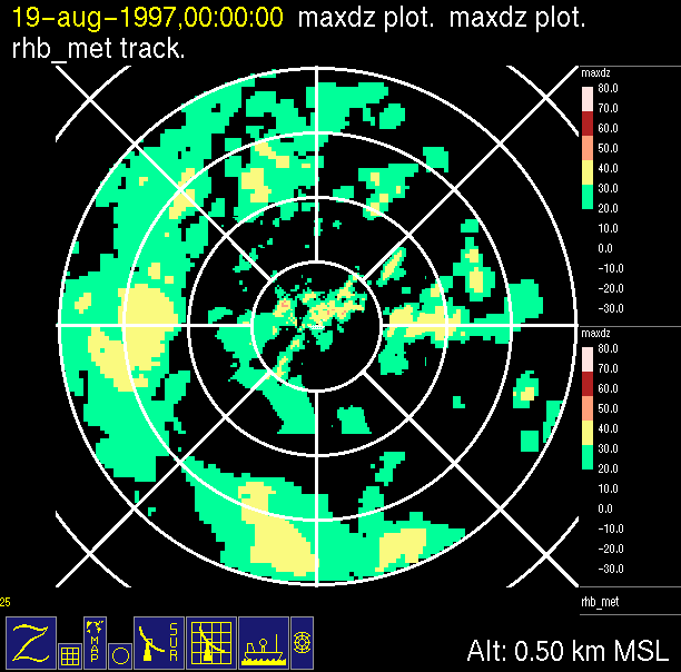 radar reflectivity data color-coded in 10 dB increments.