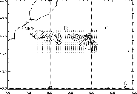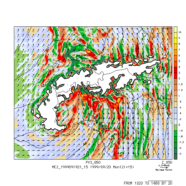 On the morning of 18 September the ARAT aircraft took off at 0655 UT and landed at 0948 UTC. During its flight it identified a cyclonic vorticity feature at the 1000 ft (~300 m) level over the Ligurian Sea (Fig. 3). This feature may have been a precursor to the strong precipitation event in Northern Italy, which was observed over the next three days. The Swiss Model 12 h forecast for this time had a suggestion of such a low-level circulation in the 10 m level flow (Fig. 4).