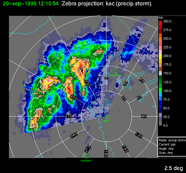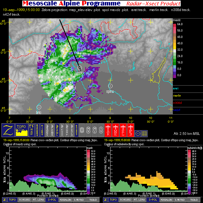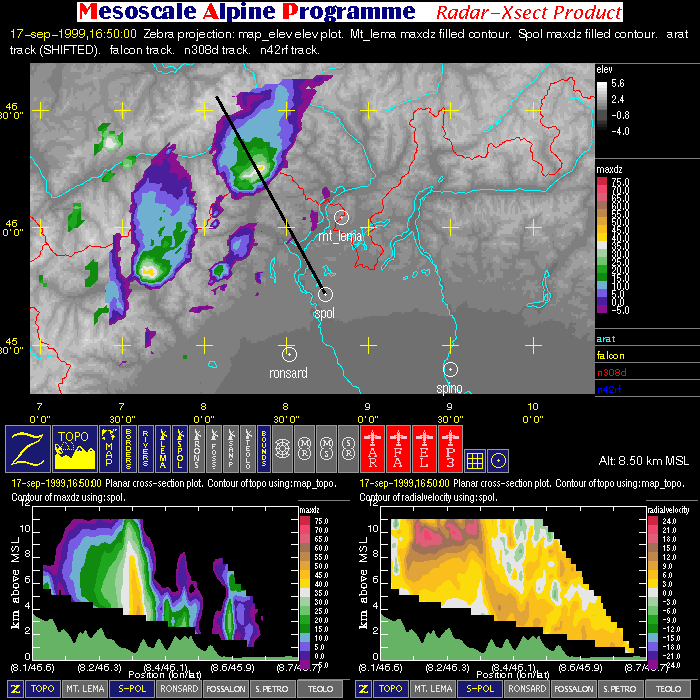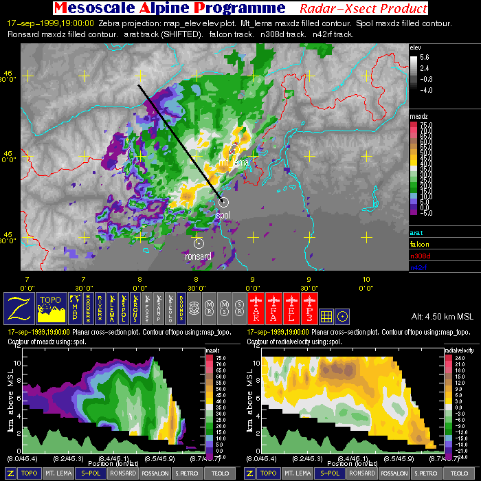 A major squall line developed in the afternoon and evening of 17 September 1999 over the mountains northwest of the Lago Maggiore and moved over the research radar network during the night. The squall line moved through the dual-Doppler lobe of the RONSARD and Monte Lema radars. Uninterrupted data sets were obtained by RONSARD, S-Pol, Monte Lema, DOW, and OPRA radars. Over 3 inches of rain fell at the S-Pol radar site. Lightning was frequent over the whole region.