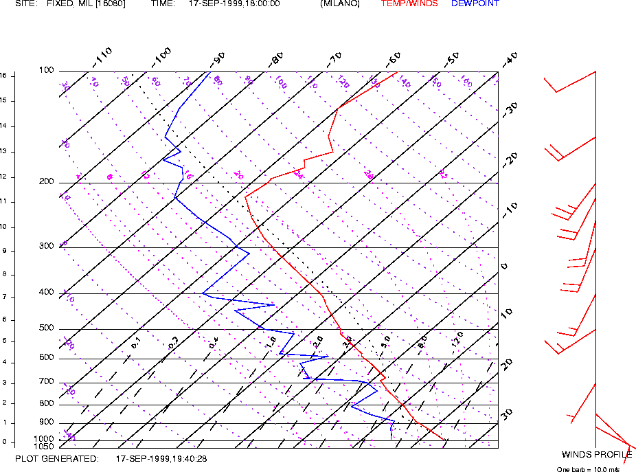The squall line occurred in a convectively unstable flow well ahead of a long wave trough moving into western Europe. The 1800 UTC sounding for Milano (Fig. 1) shows the unstable stratification and basic large-scale wind profile, consisting of weak low-level easterly flow and moderate southwesterly flow aloft. The squall line comprised a mesoscale convective system seen in infrared satellite imagery over northern Italy as a cold cloud top approximately 400 km in N-S dimension and ~100 km in the E-W direction (Fig. 2).