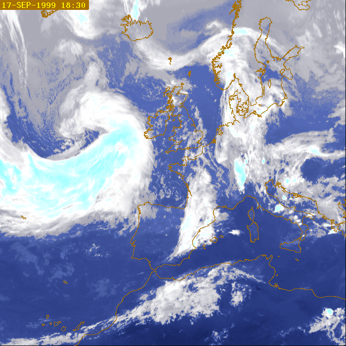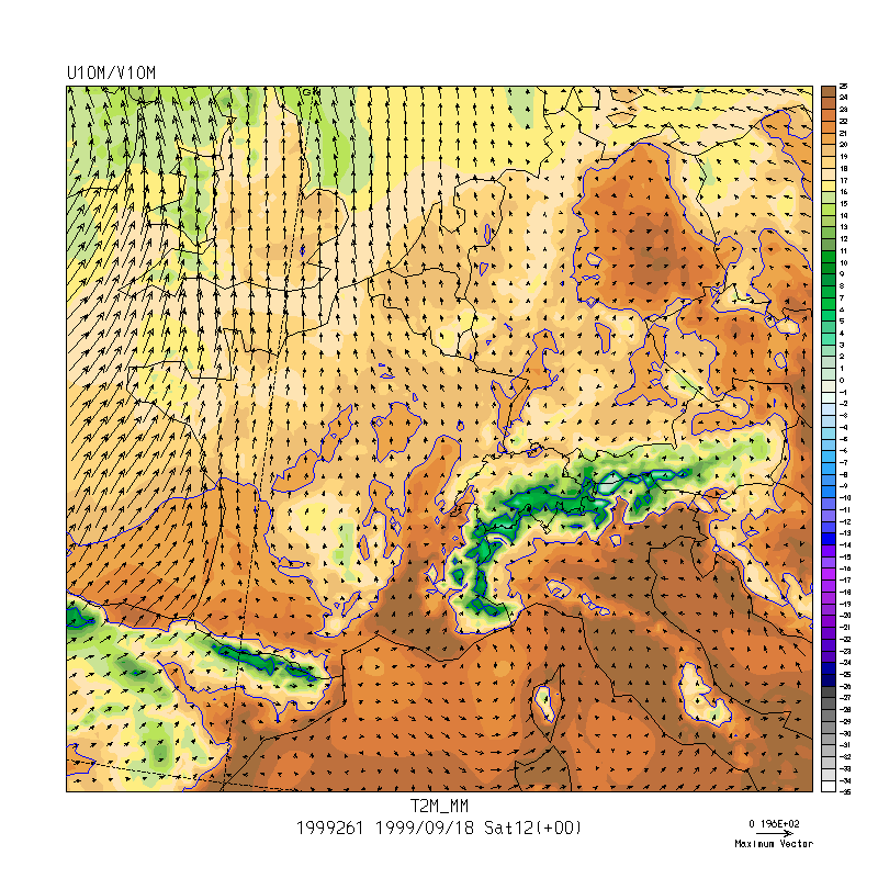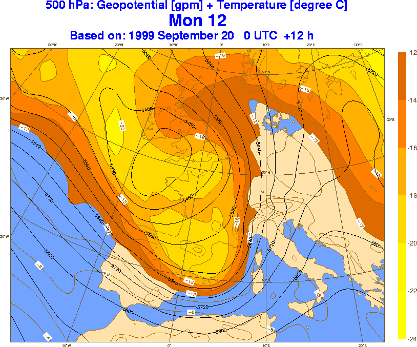 The trough that was far to the west during IOP2A moved rapidly over the region of northern Italy during the period of 18-21 September 1999 ( Fig. 1). When the trough affected northern Italy on 20 September it extended far south, into northern Africa, and the southwesterly jet ahead of the trough lay directly over the the Lago Maggiore region. A frontal cloud system with apparent embedded convective elements swept across northern Italy in association with the trough (Fig. 2). Rainfall was heavy throughout the region. The accumulation of rainfall in the mountains on the western side of the Lago Maggiore region was particularly large. According to the opinions of experienced Italian synoptic meteorologists at the POC (viz. Pino Frustaci, Andrea Buzzi, Claudio Cassardo), this case had strong similarities to previous flooding storms, especially the famous Piemonte flood (November 1994).