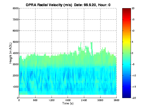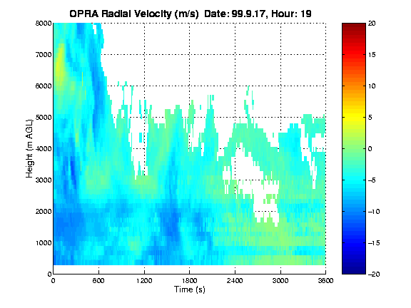 At about 1200 UTC 19 September 1999 light stratiform rain started in the Lago Maggiore region as the major trough to the west began moving across northern Italy. The flow was southeasterly at low levels turning to south-southwesterly aloft. The flow was directly over the Alpine barrier producing strong orographic precipitation in the context of the passing trough and downslope flow on the north side of the Alps. By 1500 UTC most of the research radar area was covered with light rain. The S-Pol radar showed that the rain was in a shallow layer at first and that the flow was upslope ( Fig. 11). The stratiform precipitation layer in the upslope flow deepened through the night (Fig. 12), and was characterized both on DOW and OPRA by a pronounced bright band (echoes in the 40s of dBZ) and very well defined fallstreaks emanating from enhanced spots in the bright band (Fig. 12). Fig. 13 shows the associated fallspeeds. By early morning the flow was still upslope but apparently more unstable, as the radar echo exhibited embedded cells over individual mountain peaks (Fig. 14). A particularly large persistent intense cell 50 km northwest of S-Pol is seen in Fig. 15. Occasionally a convective cell would form over the flat land of the valley just upstream of the cells forming over the mountains ( Fig. 16). Orographic precipitation in the form of small cells over the windward slopes of small peaks continued in this region (e.g., Fig. 17) until about 1100 UTC 20 September.