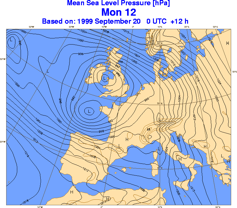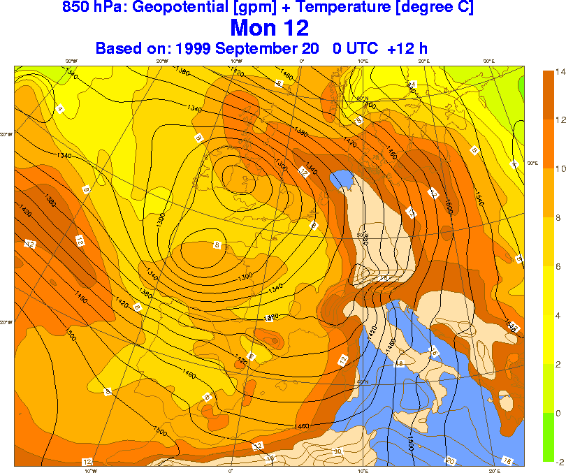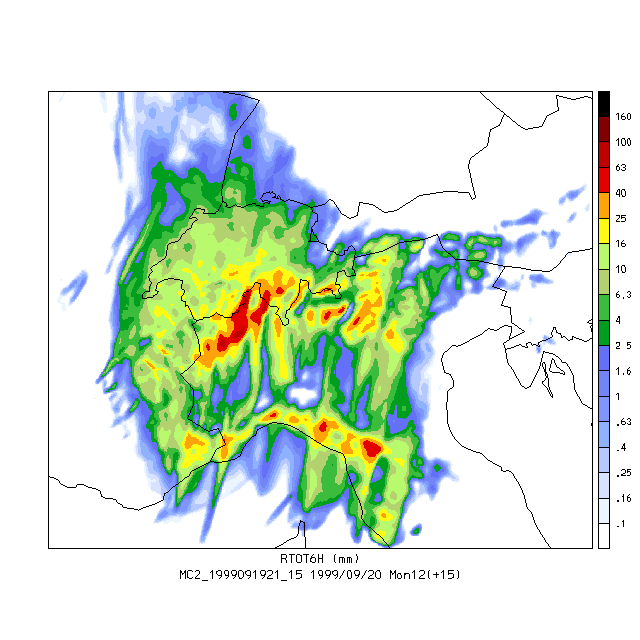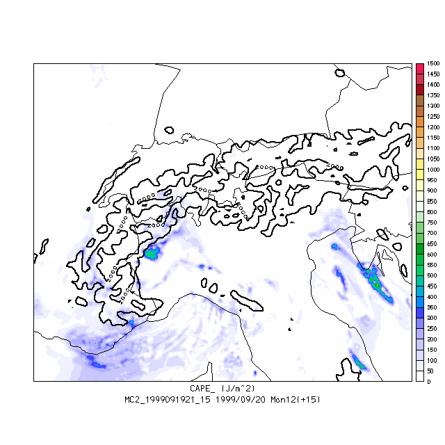 It was not until two days later (1200 UTC 20 September) that the 500 mb trough reached the Lago Maggiore region (Fig. 5). The 850 mb chart showed a frontal zone blocked by the eastern part of the Alps and the suggestion of a low forming on the lee side of the eastern Alps, over the Lago Maggiore region (Fig. 6). The MC2 indicated a cyclonic circulation developing at 850 mb in the Lago Maggiore region, with easterly components beginning to be apparent near the foothills of the Alps west on the west side the Lago Maggiore region (Fig. 7). The ECMWF 12 h forecast surface pressure for 1200 UTC 20 September showed the low on the lee side of the Alps in the Lago Maggiore region (Fig. 8). The 12-hour SM model forecast for the same time (not shown) had a similar surface pressure pattern. The 15-hour MC2 forecast of for 1200 UTC 20 September showed only moderate CAPE in the Lago Maggiore region (Fig. 9). The precipitation forecast by the MC2 showed a major rain event (Fig. 10).