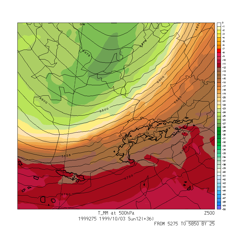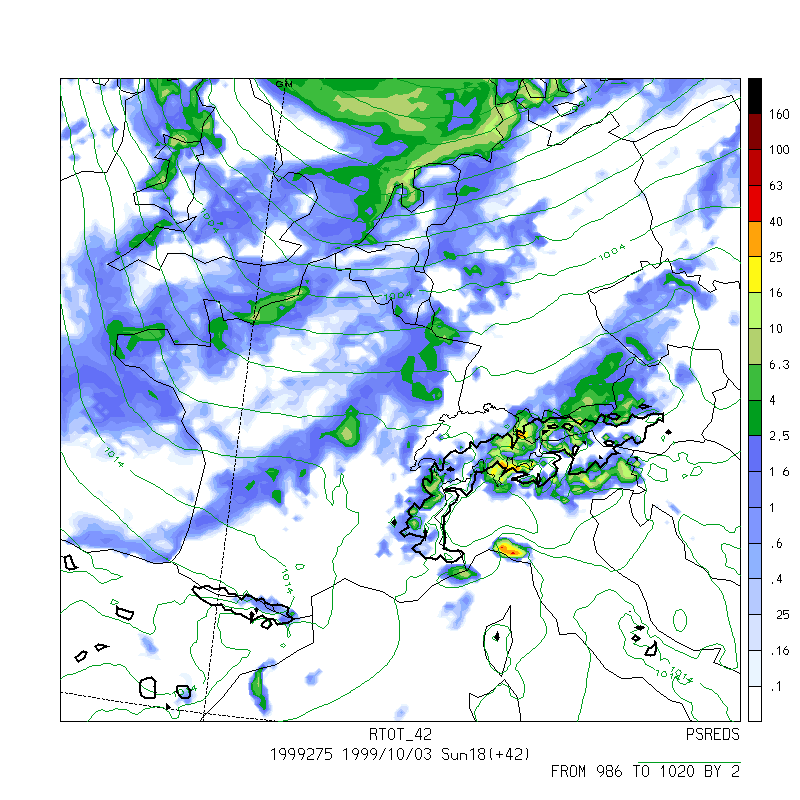 Saturday, 2 October 1999: The Swiss model indicated that an upper trough would be over western France by 1200 UTC (Fig. 1), with the predicted southwesterly flow over the Maritime Alps and Ligurian Appennines producing mountain waves and lee-side subsidence. The latter was forecast to suppress the upward motion tendency associated with the upper wave/cold front (Fig. 2). Consequently, the only precipitation forecast was that associated with the cold front before and during the time it approached the Alps (Fig. 3)