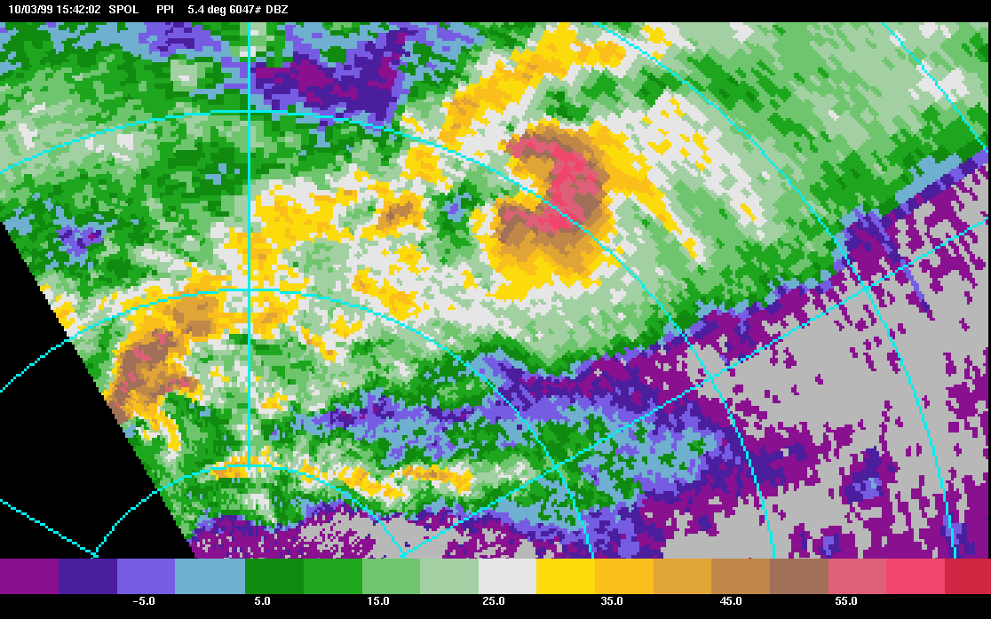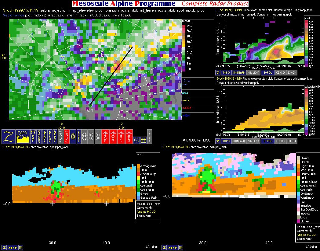 Between 1500 and 1600 UTC 3 October, very intense convective cells formed in the region of maximum precipitation in the northeastern part of the Lago Maggiore region (Fig. 15). This cell formed in the upslope flow (radial velocity cross section, middle right). It had a maximum of reflectivity aloft of over 50 dBZ (reflectivity cross section, upper right). At the 2-3 km level, the high reflectivity pattern formed a semi-circular pattern around the cell core (Fig. 16). Other cells at about this time exhibited similar semi-circular structure. The microphysical algorithms showed heavy rain, graupel, and possibly some hail near the region of high reflectivity (lower two cross sections of Fig. 15).