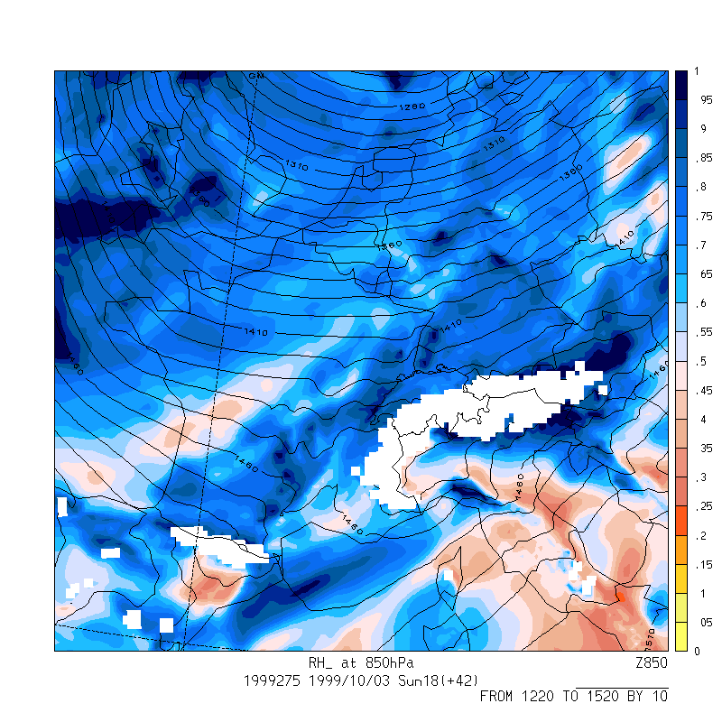 Sunday, 3 October 1999: The MC2 model continued to reinforce the idea that during the day there would be precipitation over the target area and on the upwind slope of the Ligurian Appennines, with little precipitation over the Milano area (Fig. 4) The satellite images showed a clearing zone in the western Po Valley at early times, but later cloudiness started to approach from the west (satellite-loop, Fig. 5). The Milano soundings at 0600 UTC and 1200 UTC showed weak destabilization (Fig. 6, Fig. 7); in Milan, the surface wind was east-southeasterly most of the day, and it was overcast, although the forecast indicated southerly flow and foehn-like conditions in the lee of the Ligurian Appennines (Fig. 8). The front moved very slowly during the day.