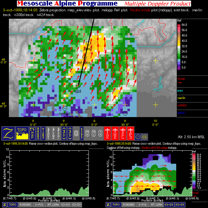 The DOW was at Magadino airport from 0645 to 2315 UTC 3 October. This position (DOW2 in Fig. 13) was in the center of the precipitation area at the northeast end of the line of persisistent convection described above. Water was ponding at the site, and police were closing flooded roads. A total of about 100 mm of rain fell at the Magadino airport. Just a few kilometers to the southeast, on higher ground, 280 mm were recorded at Tamaro. In the same general area, near Mezzovico and Sementina, 100 mm fell in 2 hours and the flooding left one person dead. The flow over Magadino was upslope, producing convective-scale cells of moderate to heavy rain for many hours (Fig. 13). The dual-Doppler winds from the RONSARD and Monte Lema radars showed how the flow at the 2.5 km level approached the region (Fig. 14). On the eastern side of the region, southwesterly flow turned to a more southerly direction as it approached the mountains at the northern end of the Lago Maggiore region. The flow was evidently responding to the mountain barrier on the eastern side of the Lago Maggiore region. Over the center of the region, directly over the southwest-northeast oriented radar reflectivity maximum, the flow on the eastern side of the region converged with the flow on the western side of the region.