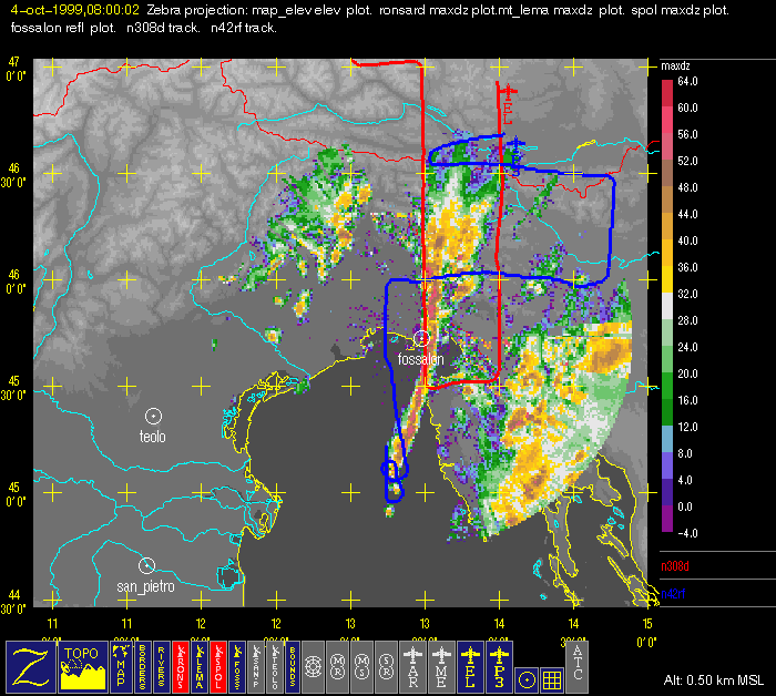 Monday, 4 October 1999: Precipitation moved out of the Lago Maggiore area early this morning and re-intensified over the eastern Po Valley. The P3 and Electra flew in this convection over northeastern Italy, the Adriatic Sea, and Slovenia, in view of the Fossalon radar (Fig. 17).