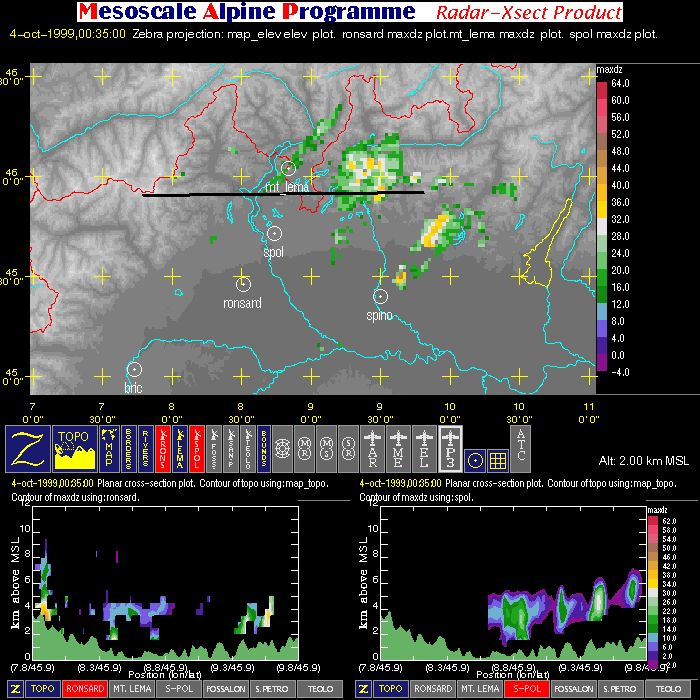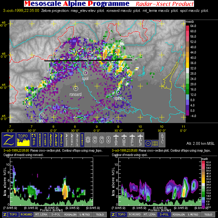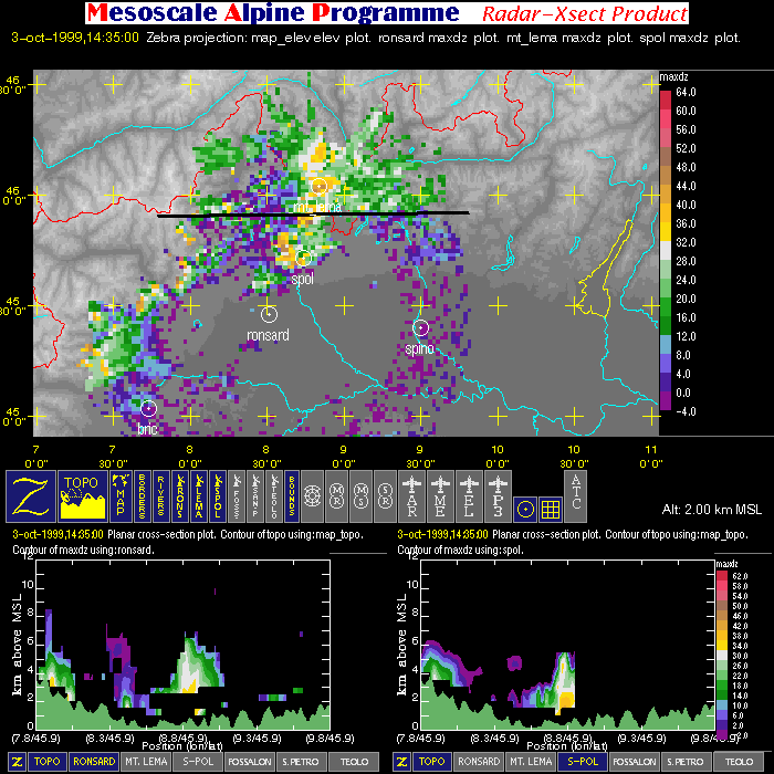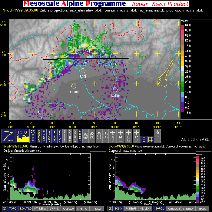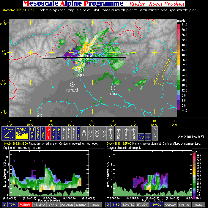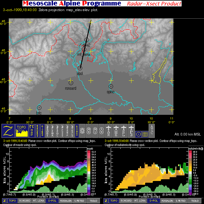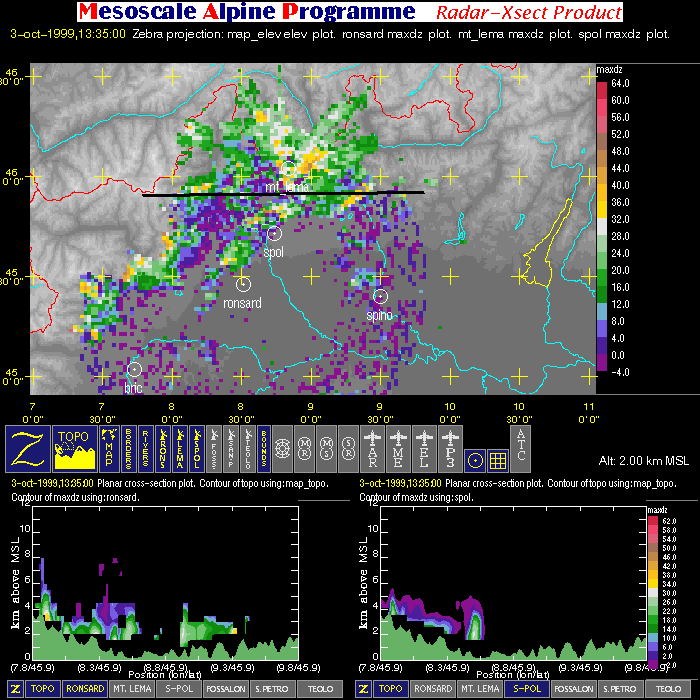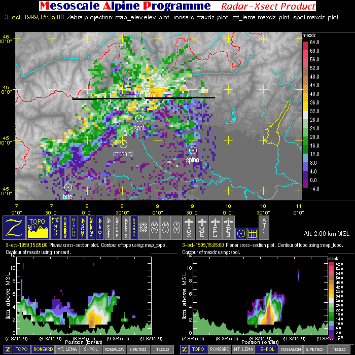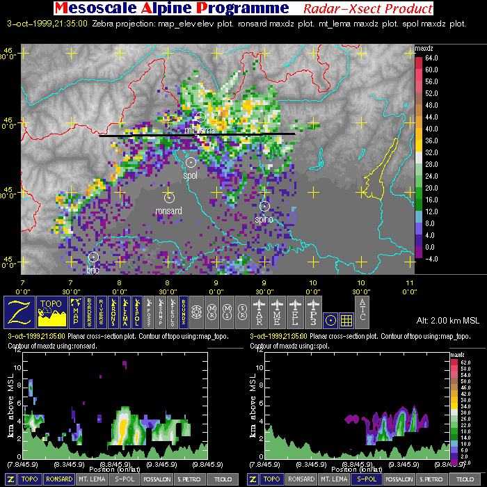 - Radar Cross-section: image with one horizontal cross-section (containing flight tracks, radar data, and geography) and two vertical cross-sections (containing radar data and terrain).