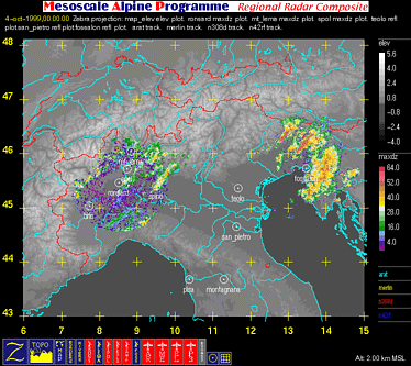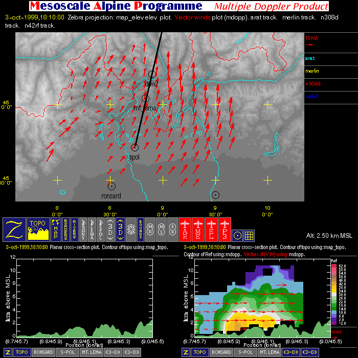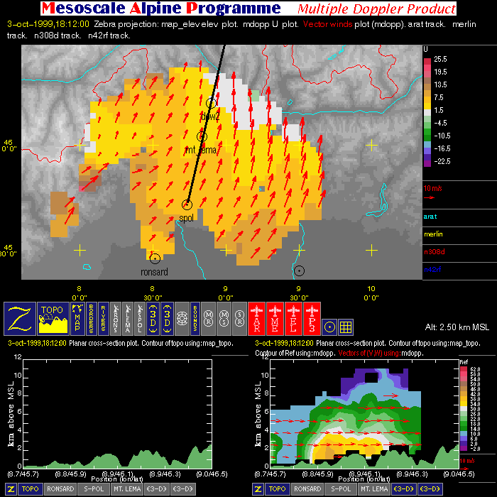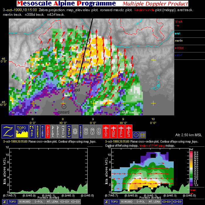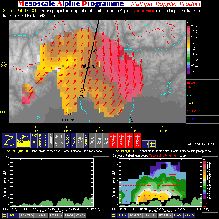 - Multiple Doppler: image with one horizontal cross-section (containing flight tracks, multiple-doppler fields, radar data, and geography) and two vertical cross-sections (containing multiple-doppler fields, radar data and terrain).