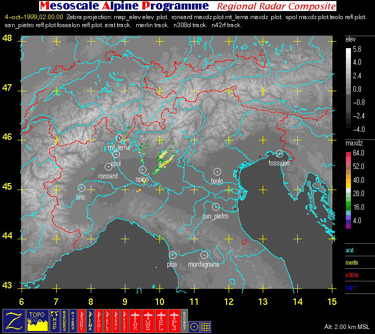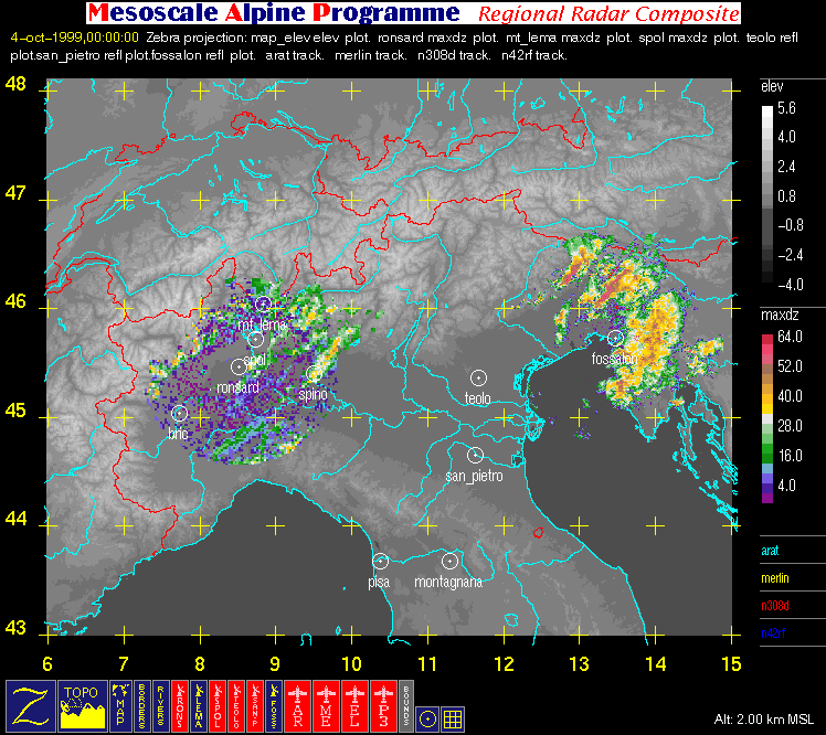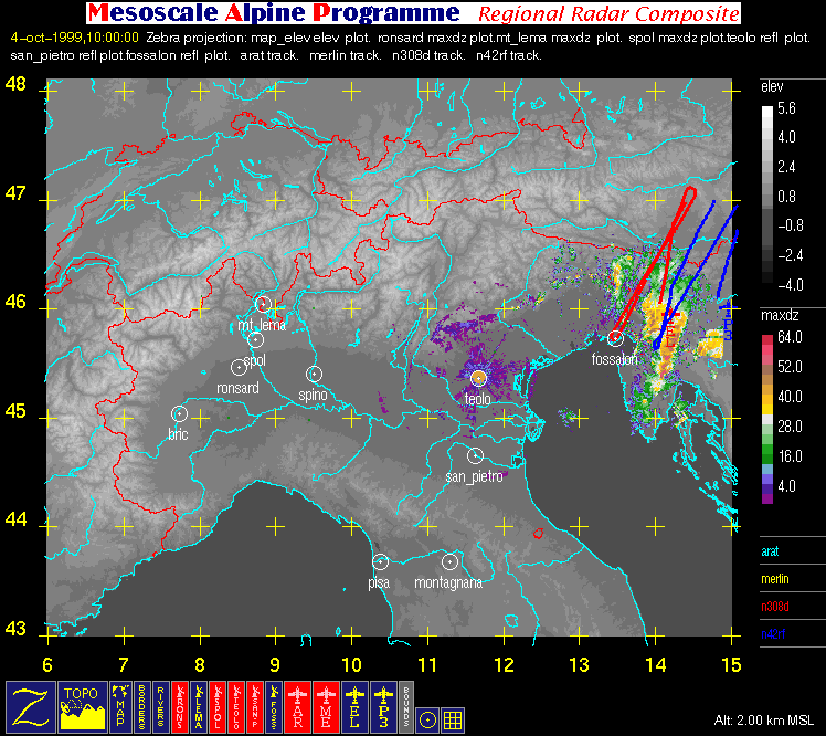 - Regional Radar Composite (with aircraft flight tracks where available): large horizontal image (2 km MSL) covering the region bounded by 6° E, 15° E, 43° N, and 48° N that contains flight tracks superimposed on radar data and geography.