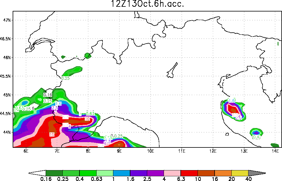 With IOP 6 in progress on Wednesday 13 October, the MC2 run for the day indicated light rain over the western Alps of decreasing intensity between 1200 and 1800 UTC (Fig. 7) and with little over the Po Valley. This forecast was basically a more refined version of the ECMWF version shown in Fig. 12b. The MM5 forecast for 1200 UTC (Fig. 14) showed a similar forecast to that of MC2. Available data showed that these models basically had the right idea, except as noted in previous cases, the models predicted dry conditions over the Po Valley, when in fact light rain occurred (e.g.Fig. 8, Fig. 15).