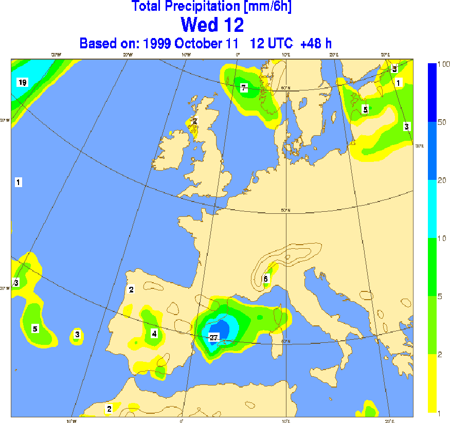 Based on this uncertainty in the model forecasts, and the general agreement of the latter forecast with the position of the cold cloud tops in the IR imagery, IOP 6 was initiated on 0000 UTC Wednesday 13 October and the dual aircraft mission described above was launched. However, a further puzzling discrepancy between the models was noted as the SM originating at 0000 UTC Tuesday 11 October showed almost no precipitation over southern France (Fig. 13) but large amounts over the Mediterranean, consistent with the earlier ECMWF run initialized at 1200 UTC Monday 11 October (Fig. 11b).