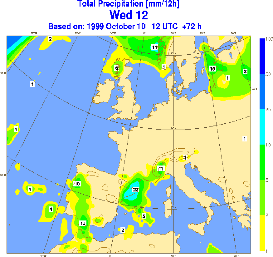 One of the more interesting aspects of this IOP was the way in which the numerical forecast models handled the conditions leading up to the IOP. Although the conditions over Europe were dominated by the large-scale high pressure system seen in Fig. 6 and Fig. 2, the models started picking up the weak low-pressure system of African origin that ended up as the weak upper-level trough discussed above. Briefings on Monday 11 October and Tuesday 12 October showed ECMWF forecasts starting, respectively, at 1200 UTC Sunday 10 October, and 1200 UTC Monday 11 October, which indicated an eastward progress of the precipitation toward central Italy (Fig. 11a,Fig. 11b). However, at an afternoon meeting on Tuesday 12 October, we were shown the ECMWF forecast originating at 0000 UTC Tuesday 12 October, which indicated a more northerly track of the precipitation toward southern France (Fig. 12a). In looking for clues for why the solution changed so much, we in retrospect looked at the ECMWF forecast originating at 0000 UTC Monday 11 October (Fig. 12b). Surprisingly the two forecasts originating at 0000 UTC 11 October and 0000 12 October were consistent with each other. Hence rather than a change of solution trajectory in the ECMWF model, we can only guess that there must be an inconsistency in the way the 0000 UTC and 1200 UTC runs are initialized. A query has been sent to ECMWF regarding this hypothesis.
