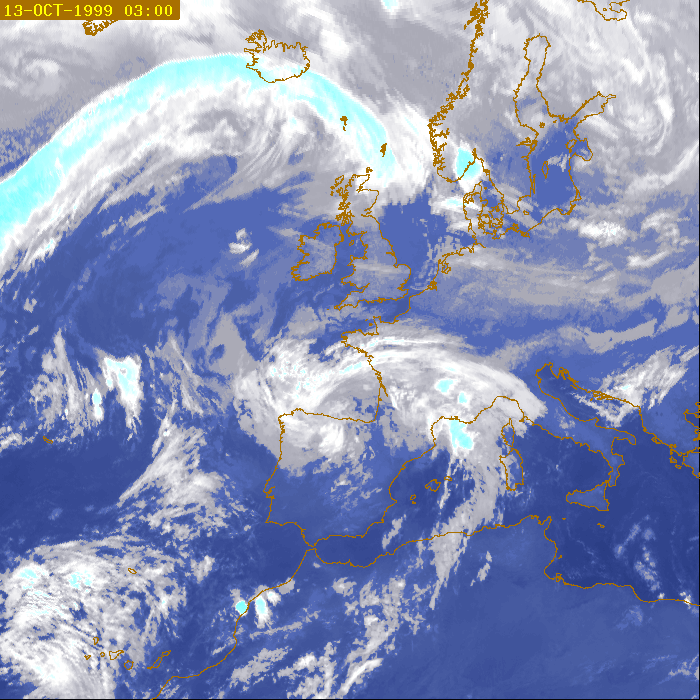 Satellite infrared data showed a weakening cyclonic cloud system moving into northern Italy on 13 October 1999 (Fig. 1). This disturbance had its origin outside the midlatitude westerlies, over northwestern Africa. By 1200 UTC it was manifest in the 500 mb flow as a weak trough over Spain (Fig. 2). This low was moving toward the ridge line of an "omega block" that had been dominating the region from the British Isles to Italy for several days. The 700 mb flow exhibited the same trough entering northwest Italy at 1200 UTC 13 October (Fig. 3). The flow at both 700 mb and 850 mb (Fig. 4) flow over north central Italy (the Po Valley) was very weak. The flow in the boundary layer was also weak over the Po Valley with, while to the west air from the Ligurian Sea was flowing strongly northward through the gap between the Alps and the Pyrenees (Fig. 5). A surface high pressure system was located over the northern portion of the Italian Penninsula (Fig. 6). The MC2 forecast a pattern of precipitation ahead of the weak trough weakening as it moved into the region of weak flow and surface surface high pressure in the Po Valley (Fig. 7). The RONSARD, S-Pol, and Monte Lema radar composite for 0630-1530 UTC showed an area of stratiform precipitation with a well defined bright band moving into the Po Valley (Fig. 8). The area of rain moved across the region in conjunction with the satellite cloud pattern (Fig. 1). Also consistent with the satellite sequence, the radar data showed that the stratiform precipitation was stronger during the earlier part of the time period of its passage over the Po Valley. The P3 and Electra aircraft tracks are shown in the composite. They flew several tracks through the stratiform precipitation, and the flight scientists on the Electra and P3 reported that good ice particle samples were obtained at their respective altitudes of 11000 feet (~3.5 km) and 13000 feet (~4 km). The microphysical particle identification algorithms applied to the S-Pol radar data at 1214 UTC, when the bright band was well defined, showed a simple layered structure of snow above the 0 deg C level and rain below (Fig. 9). The NCAR algorithm attempted to distinguish wet ice from dry ice just above the melting layer (lower right panel). At 1500 UTC, when the aircraft was flying (Fig. 10) the radar was seeing mostly weak echo aloft, above the 0 deg C level. At farther range (~65 km), the NCAR algorithm tried to identify all the echo as some type of ice particles (wet snow, dry snow, or ice crystals). The UW algorithm makes no distinction between dry and wet snow, and the ice crystal zone was identified as ambiguous, i.e. not possible to classify with a high degree of confidence. At nearer range (~40 km), the NCAR algorithm called some of the particles supercooled drops. Although this is highly speculative, it is noteworthy that the dual-Doppler vertical velocity (middle right panel) showed upward air motions of ~1-2 m/s; however, this calculation is also of a speculative nature.