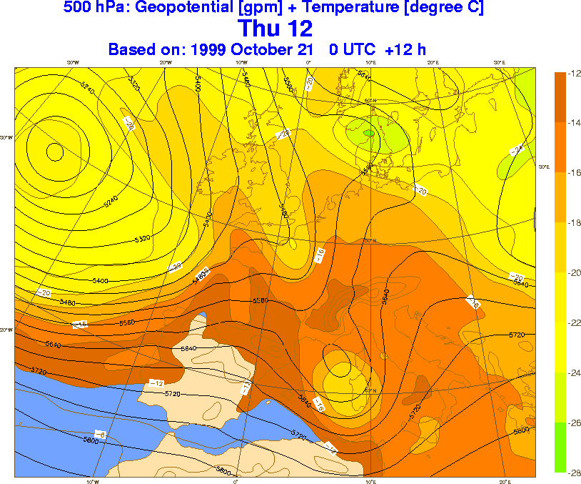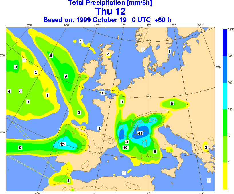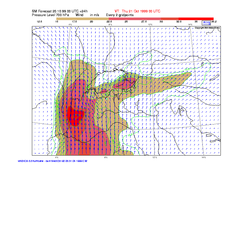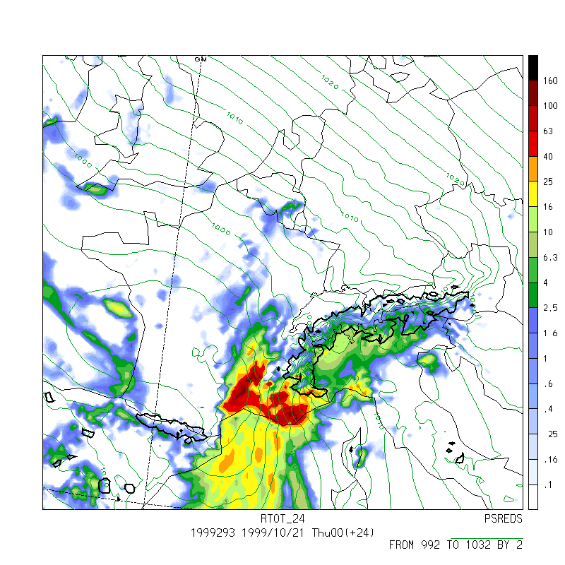 Wednesday 20 October: The ECMWF model continued to show favorable placement of the upper-level trough for Thursday 21 October (Fig. 3)). The Swiss Model (SM) forecast major rain for the Lago Maggiore area (Fig. 4). An interesting feature was the way the general eastward movement of the frontal system was forecast to be retarded over northwest Italy, which implied a long-lasting event over this region ( Fig. 5). Based on these precipitation forecasts, an early aircraft mission was planned for Thursday.