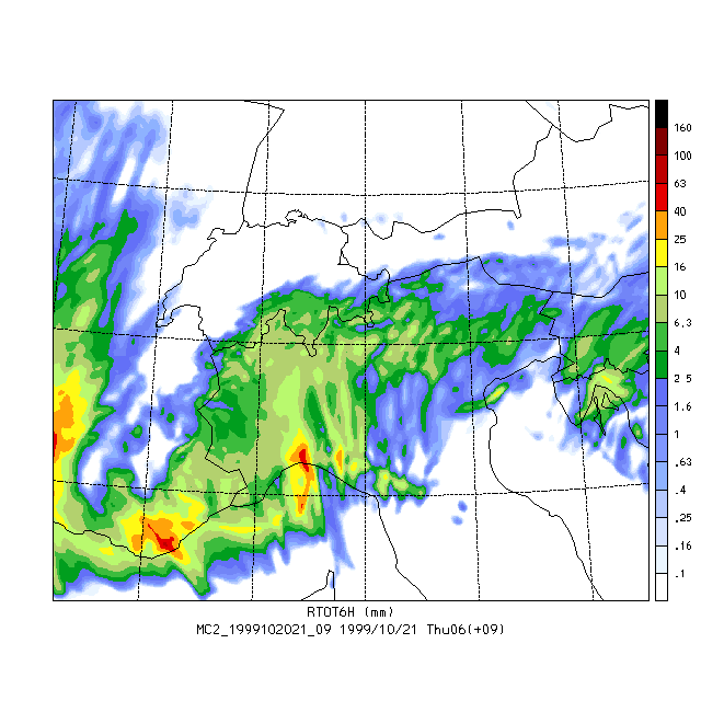 The MC2 model forecast the maximum precipitation in the Lago Maggiore area to occur between 0600 and 1800 UTC (Fig. 6). Between 0300 and 1500 UTC, infrared satellite imagery showed a frontal cloud band moving over northern Italy. The cold cloud top area was maximum just as the cloud band was passing over northern Italy, between 0900 and 1200 UTC (Fig. 16). During the passage of the cloud band over Italy a frontal wave appeared to deform the cloud pattern to produce a vortex centered over the sea northwest of Corsica. From 0400-1600 UTC 21 October 1999 stratiform precipitation filled the Lago Maggiore region. Although the precipitation had mesoscale maxima and minima, these features did not show coherent movement or life cycles. Rather the whole region seemed to be occupied by one general large persistent area of stratiform precipitation with a melting layer at 1-2 km level.