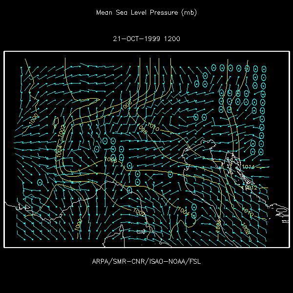 Thursday 21 October: MC2 model results continued to support the scenario that most of the rain would be early in the Lago Maggiore area, but linger until late (Fig. 6). The MC2 model also showed a strong PV maximum associated with the convection concentrated in the Piedmont region ( Fig. 7). The ECMWF model run verifying at 1200 UTC showed the 500 mb trough cutting off over the Mediterranean, to the southeast of the Alps (Fig. 8). The 850 mb flow indicated for 1200 UTC 21 October by the MC2 was from the southeast (Fig. 9). This airflow from the south and southeast at 850-500 mb was moist and stable and running over a lower layer of cold easterly flow. The 0000 UTC 21 October sounding for Milano (Fig. 10) indicated extreme stability of the air mass residing in the Po Valley. At 500 mb southwesterly winds were occuring, while variable winds were in the cold surface-to-800 mb layer. Similar stable stratification was evident in the 0600 UTC Milano sounding (Fig. 11). The 1200 UTC sounding (Fig. 12) showed the same stratification. The low-level cold layer had developed strong easterly winds, while the winds at higher levels (e.g., 500 mb) had turned to southerly in connection with the cutting off of the trough to the southeast, as discussed above. By 1800 UTC (Fig. 13) the extreme stability remained, and the 500 mb wind had turned further to southeasterly in connection with the cutting off of the trough. Surface data indicated that a northeasterly flow of cold stable air entered northeastern Italy, turned easterly across northern Italy through the Po Valley, and exited through the gap in the mountains between the western end of the Alps and the Ligurian Appenines in the region of Genoa (Fig. 14). The French ARAT aircraft obtained a sounding over the Adriatic coast of northeastern Italy, which showed the cold low level air entering the Po Valley from the northeast. The French profiler at Lonate (halfway between the RONSARD and S-Pol radars) was consistent with this analysis (Fig. 15). At 1200 UTC it showed northeasterlies in the lowest 500 m. It also showed southeasterlies at 2 km turning to southerly above about 4.5 km (consistent with the dual-Doppler radar data discussed below).