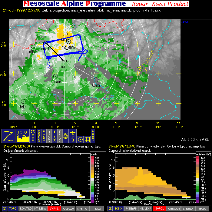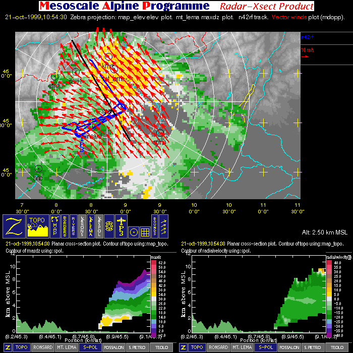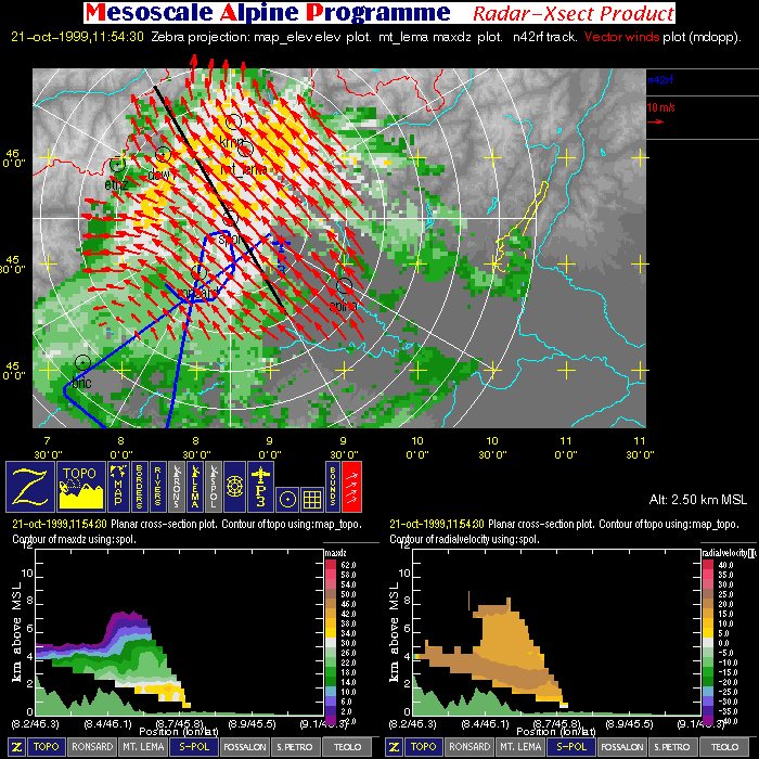 At the southwest corner of the region of dual-Doppler winds shown in Figs. RADAR09-13 there was a suggestion of a vortex farther to the southwest, which would be consistent with the 850 mb wind forecast. Between 1100 and 1200 UTC the P3 aircraft flew a triangular pattern to the southwest of the area of Monte Lema-RONSARD to use the airborne dual-Doppler radar to extend the wind field coverage and determine whether the vortex was present in that region.