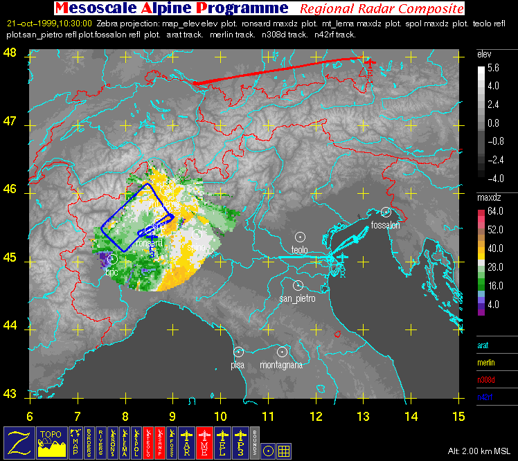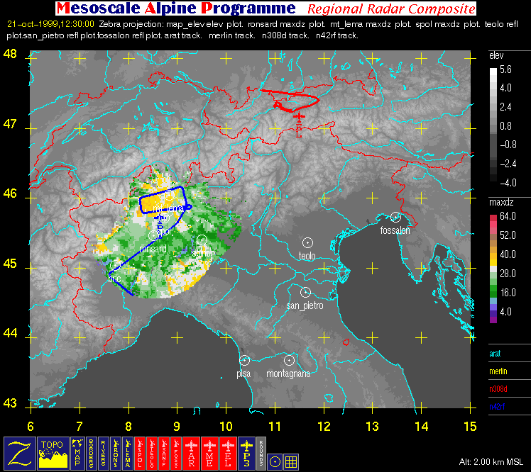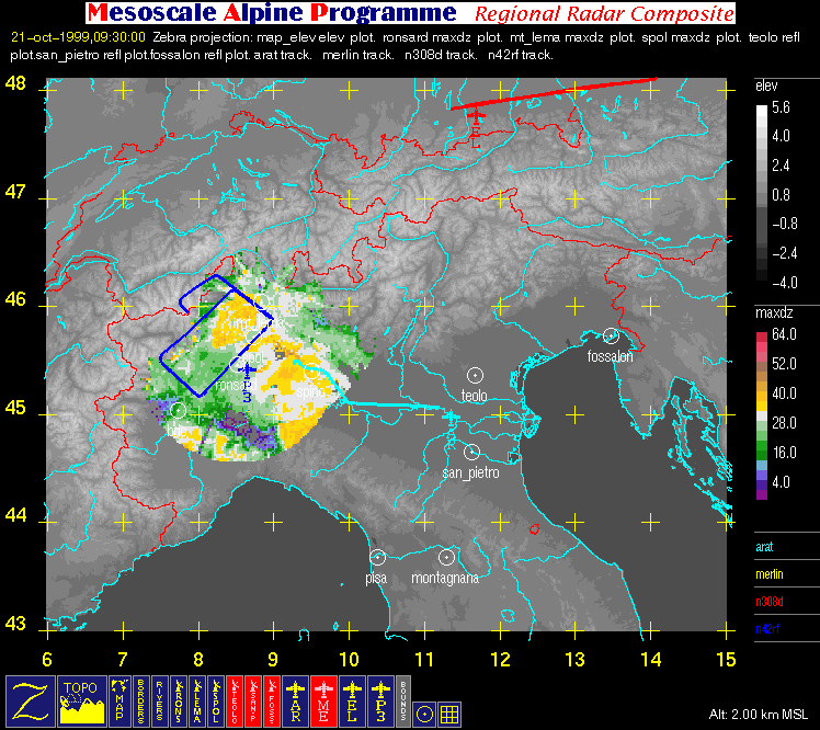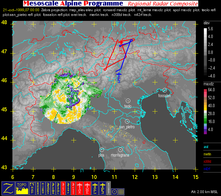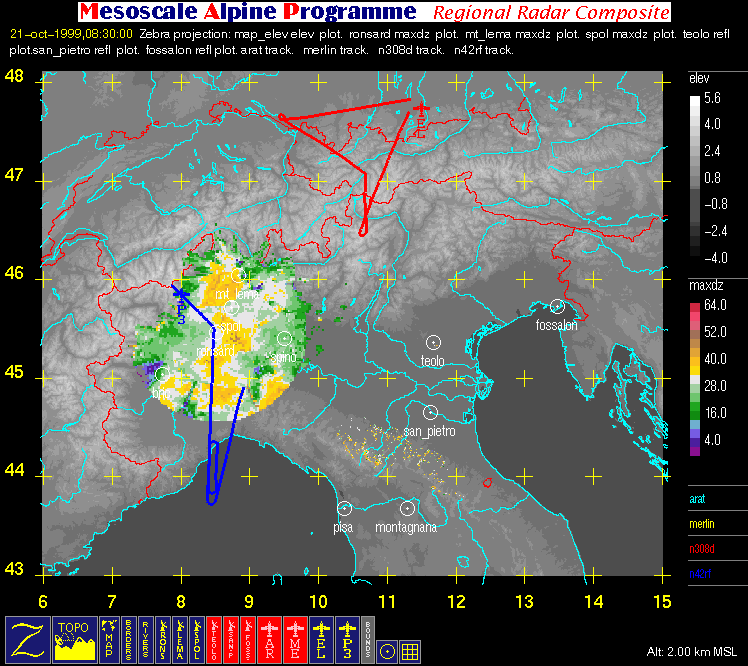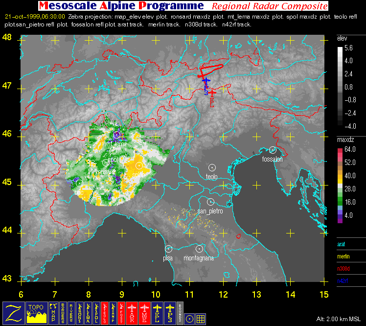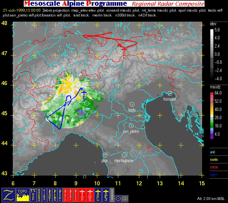 - Regional Radar Composite (with aircraft flight tracks where available): large horizontal image (2 km MSL) covering the region bounded by 6° E, 15° E, 43° N, and 48° N that contains flight tracks superimposed on radar data and geography.