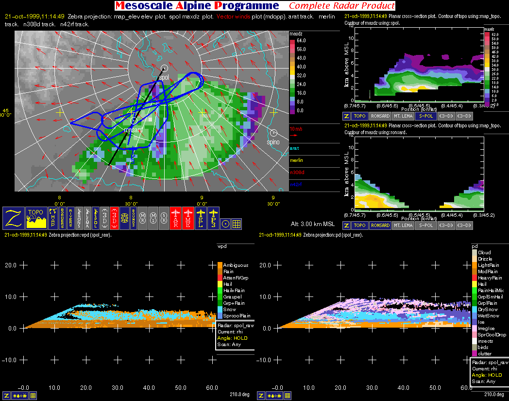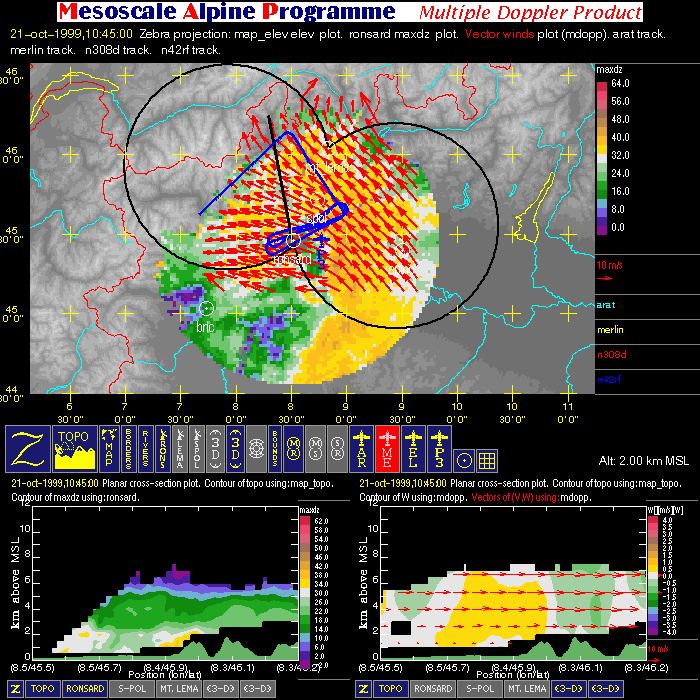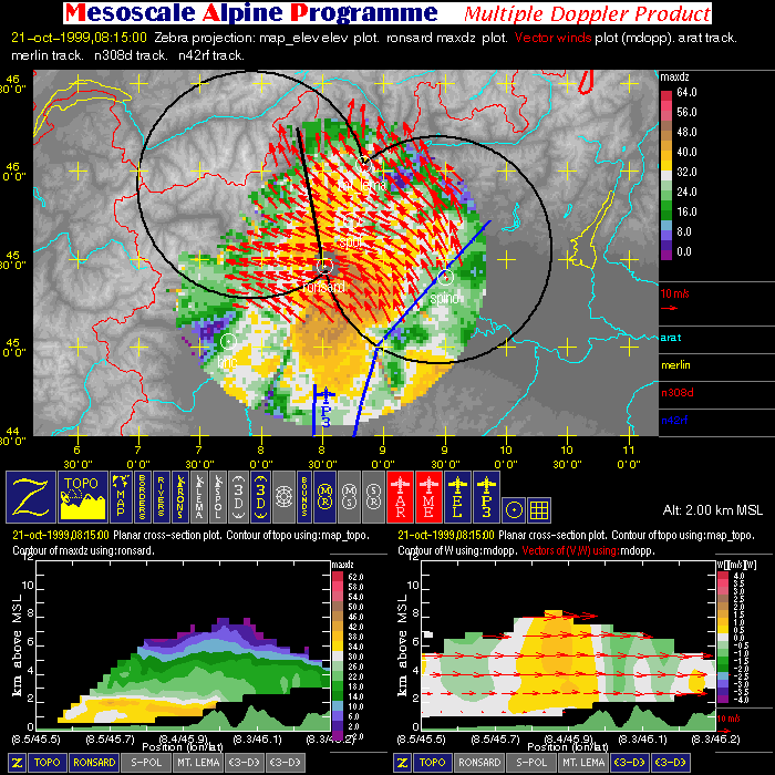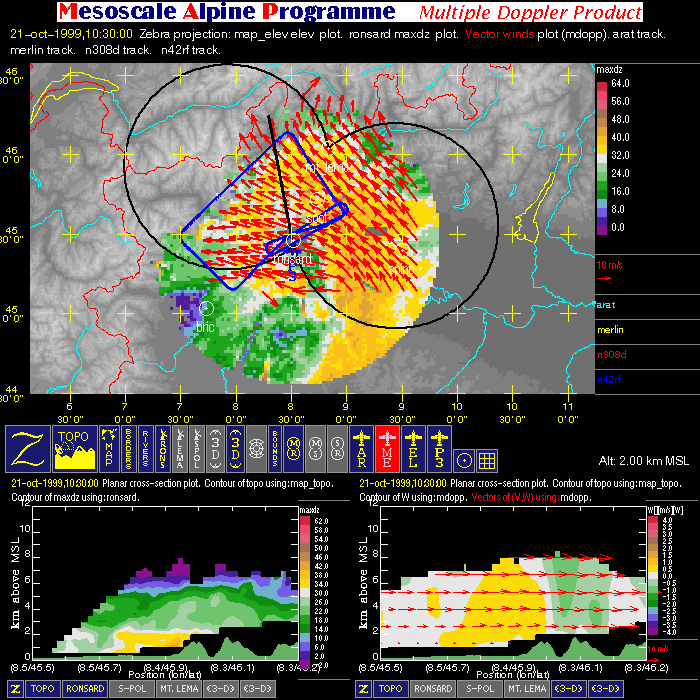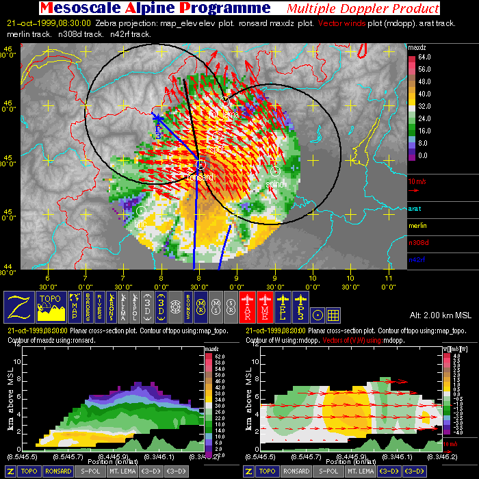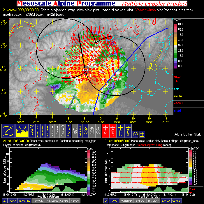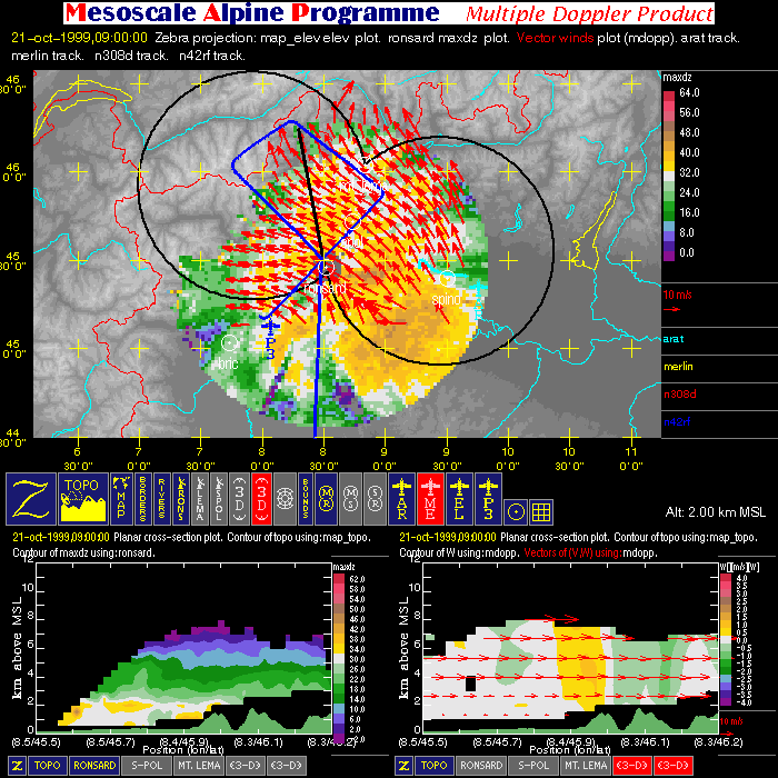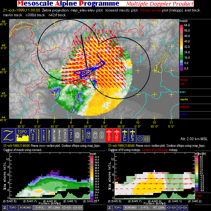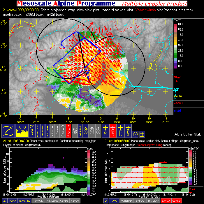 - Multiple Doppler: image with one horizontal cross-section (containing flight tracks, multiple-doppler fields, radar data, and geography) and two vertical cross-sections (containing multiple-doppler fields, radar data and terrain).
