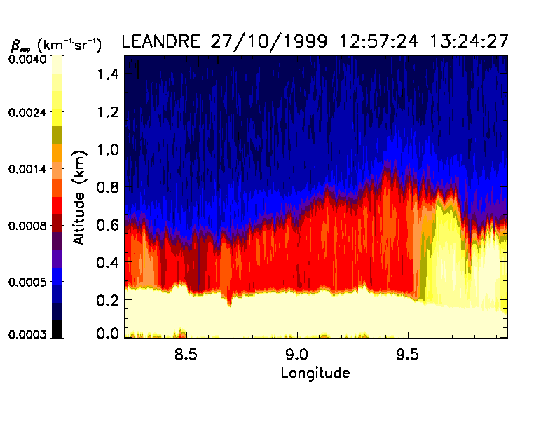 The reflectivity pattern in the boundary layer revealed by the LEANDRE lidar aboard the ARAT is shown in a nearly west-east vertical cross section in Fig. 6. The cross section extends from 8.2° E to 10° E at about 45.6° N latitude, and indicates that the boundary layer was deepest near Milan (9.5° E), and shallowest just to the west of the baseline between RONSARD and S-Pol (8.7° E).