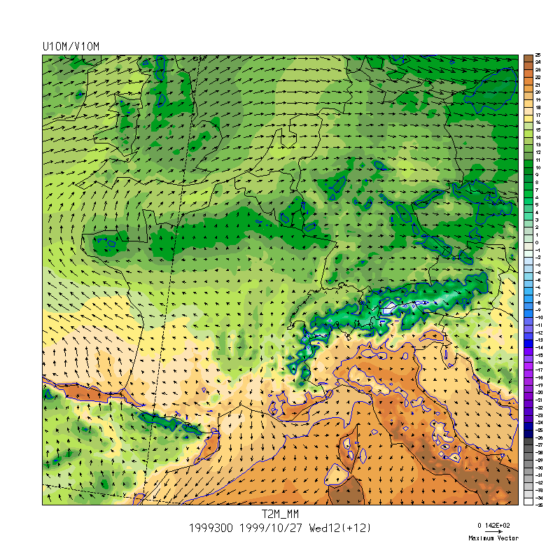 Wednesday 27 October: The sky cleared after more than a week of cloudiness and precipitation. The ECMWF forecast for 1200 UTC (Fig. 1) predicted a 500 mb ridge over eastern France, with weak northwestery flow aloft over the Po Valley of Northern Italy. At 850 mb, the SM model predicted weak flow and abnormally warm conditions, with temperatures over 20° C (See Fig. 2).