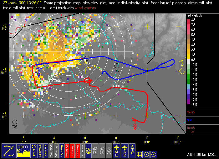 The RONSARD and S-Pol were operating during the flight, measuring clear-air returns in the boundary layer. The S-Pol radial velocity field at 1325 UTC revealed a vertical wind profile that is consistent with the Casale sounding (Fig. 5) taken by the Merlin aircraft. As shown in Fig. 7, the S-Pol measured southwesterly flow at 0.5 km, northeasterly flow at 1.0 km, north-northeasterly flow at 1.5 km, and northwesterly flow at 2.0 km MSL (range ring spacing is 10 km). It is also interesting to note the relatively strong up-valley flow (~ 8 m/s) into the Toce river valley and over Lago Maggiore at the 1.0 km level (Fig. 8; 10-30 km range at 330° azimuth).