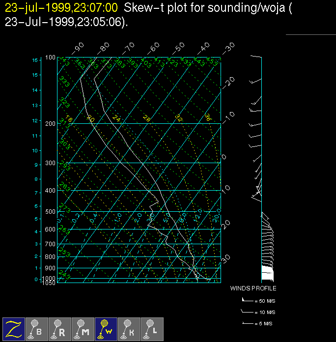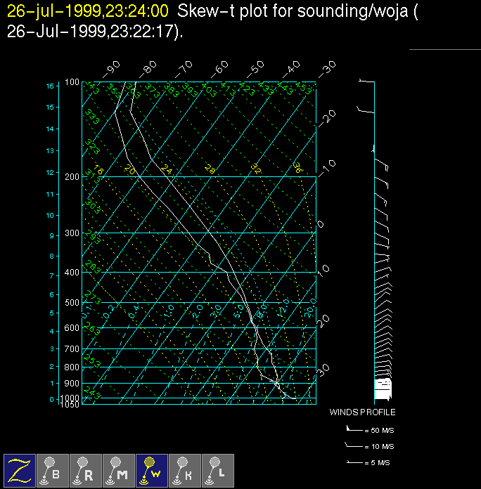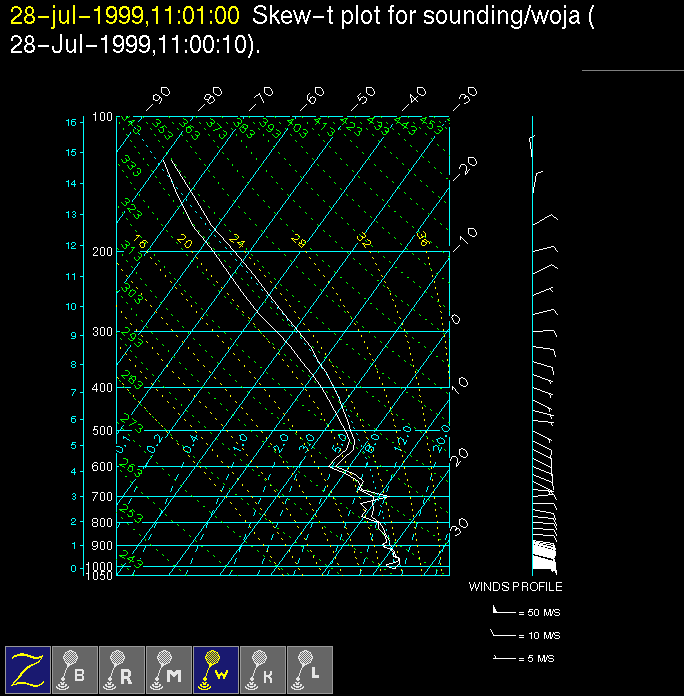 KWAJEX Weekly Sounding SummaryClick on "Plot" to see the skew-T for the sounding or select "Data" to see the data in tabular form. N/S signifies that no sounding was launched at the given time and location. AOP denotes an aircraft operational period. Soundings: July 23, 1999 (6-hourly)Use