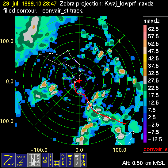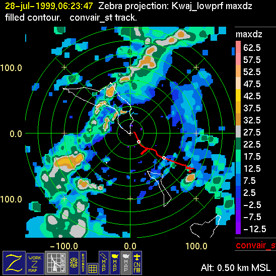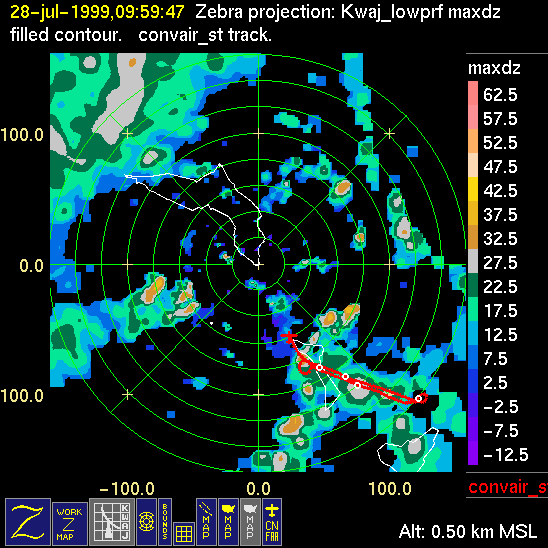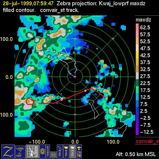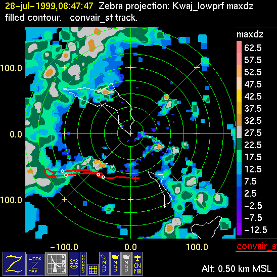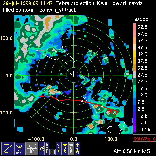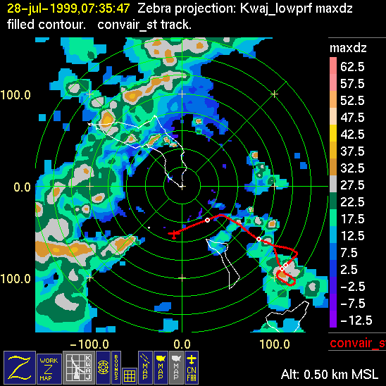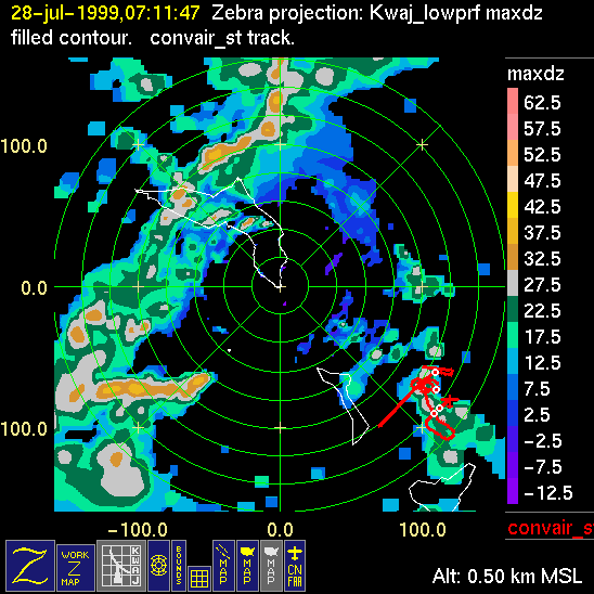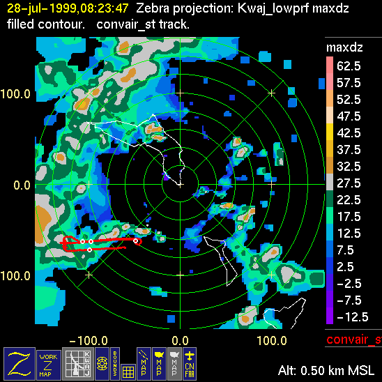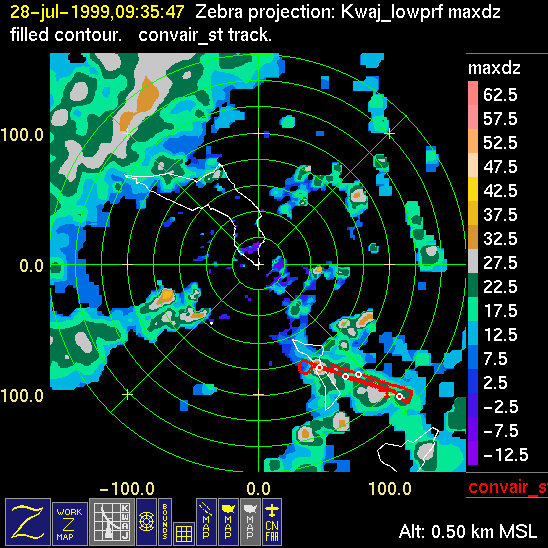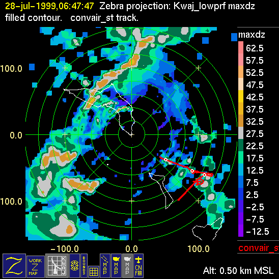 Mission summaries consist of Scientists' discussions of the flights and Radar Images overlayed with flight tracks. Separate discussions (written by the Aircraft Mission Coordinator and the chief airborne mission scientist on each aircraft participating in the mission) may be read by clicking on the "Scientists' Discussion" link shown below. Also shown below are the aircraft flight tracks (see color key below) superimposed on a series of radar echo patterns obtained by the Kwajalein S-band radar during flights. In some cases, horizontal maps of radar echo are accompanied by a vertical cross section of the radar reflectivity: indicated by light blue lines on the horizontal maps and displayed directly below them. The geography of the Kwajalein Atoll is outlined in white. The area covered by the radar is almost all open ocean. Range rings are at 10 nm intervals. The NOAA ship Ronald H. Brown is located ~22 nm (40 km) south of the Kwajalein radar. The overlapping white circles show the dual-Doppler radar lobes for the combined Kwajalein and ship radars. The red circle is a no-fly zone.