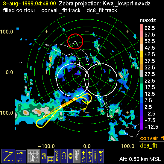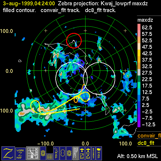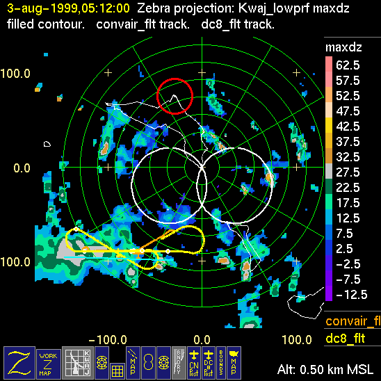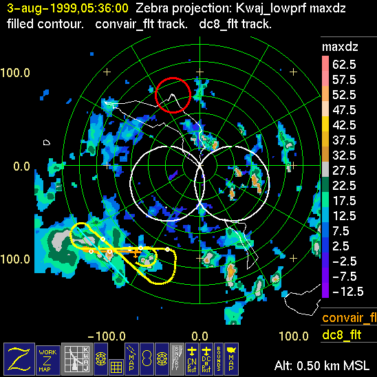 Mission summaries consist of Scientists' discussions of the flights and Radar Images overlayed with flight tracks. Separate discussions (written by the Aircraft Mission Coordinator and the chief airborne mission scientist on each aircraft participating in the mission) may be read by clicking on the "Scientists' Discussion" link shown below. Also shown below are the aircraft flight tracks (see color key below) superimposed on a series of radar echo patterns obtained by the Kwajalein S-band radar during flights. In some cases, horizontal maps of radar echo are accompanied by a vertical cross section of the radar reflectivity: indicated by light blue lines on the horizontal maps and displayed directly below them. The geography of the Kwajalein Atoll is outlined in white. The area covered by the radar is almost all open ocean. Range rings are at 10 nm intervals. The NOAA ship Ronald H. Brown is located ~22 nm (40 km) south of the Kwajalein radar. The overlapping white circles show the dual-Doppler radar lobes for the combined Kwajalein and ship radars. The red circle is a no-fly zone.